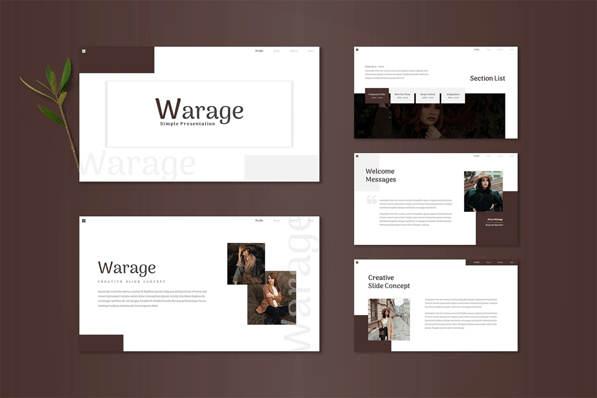 Get it now! **Warage - Google Slide Template** for All Business and Personal Needs All elements on this template are editable; input your content, replace your image with a placeholder, change the color, and all presentations include an animated slide to present your slides.
