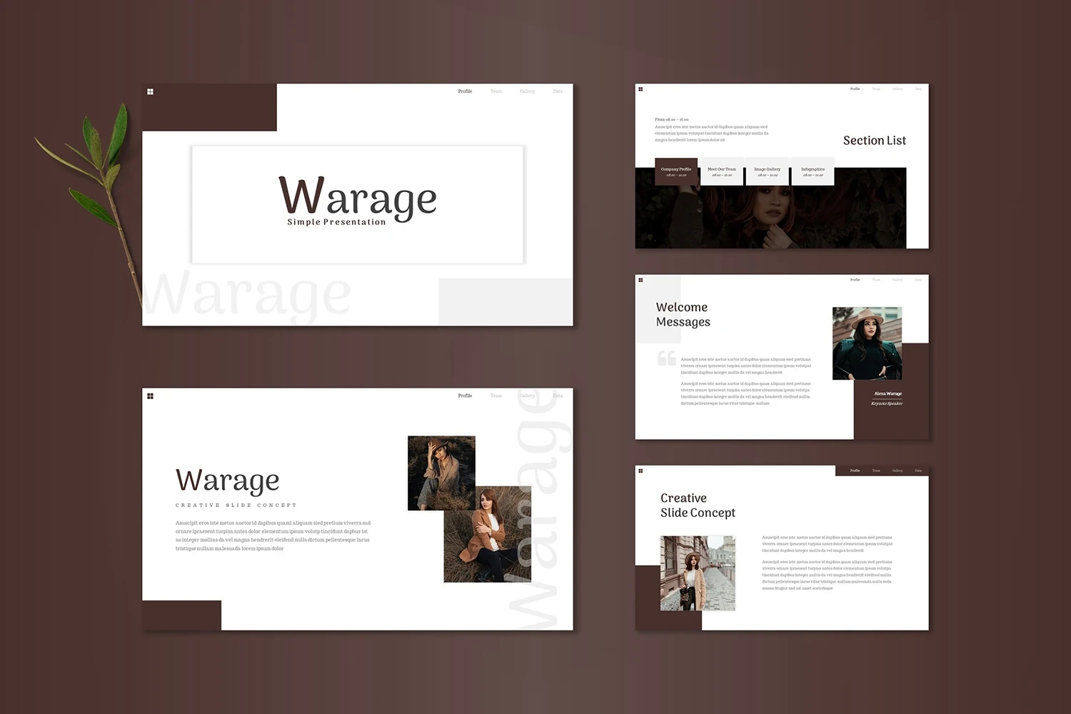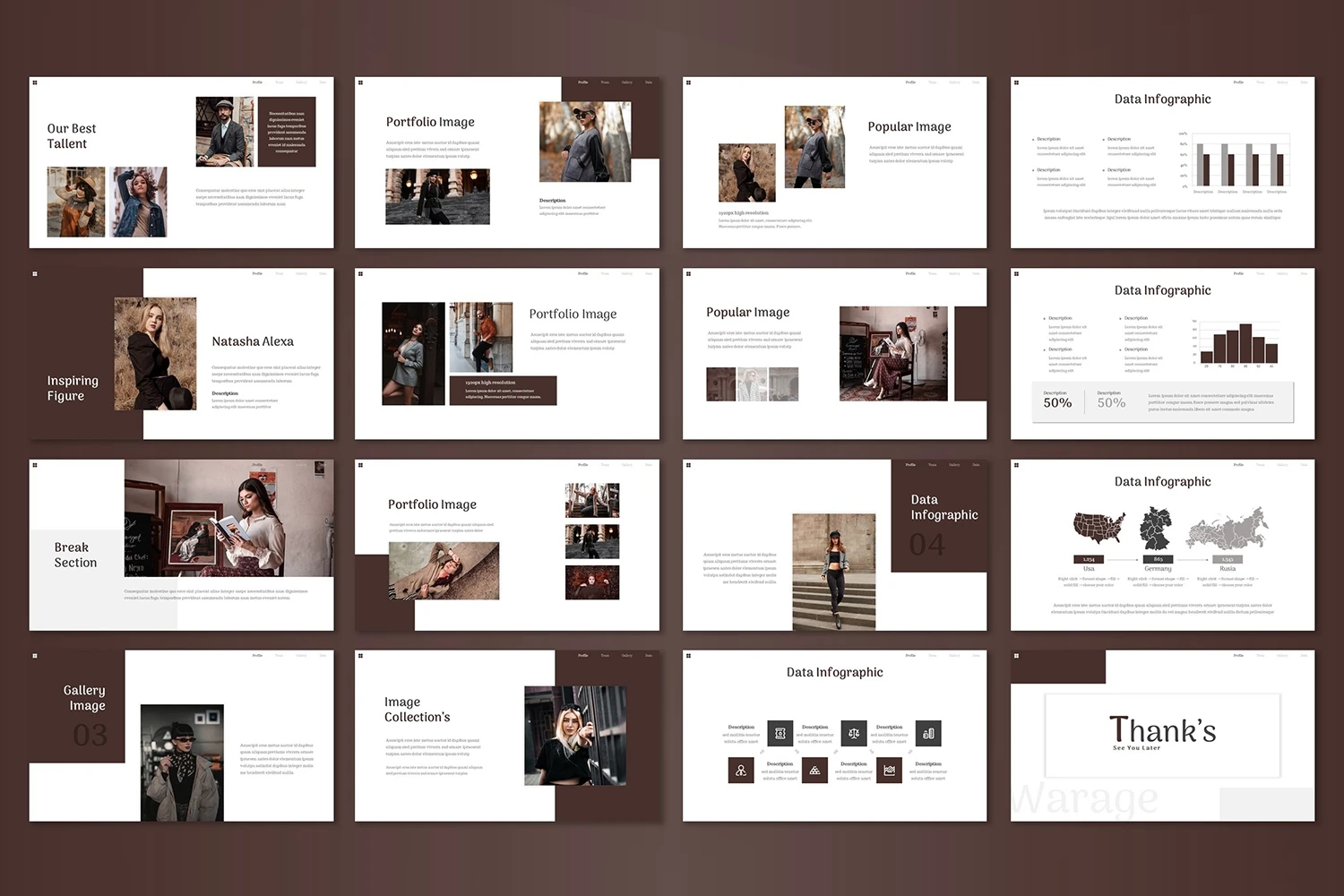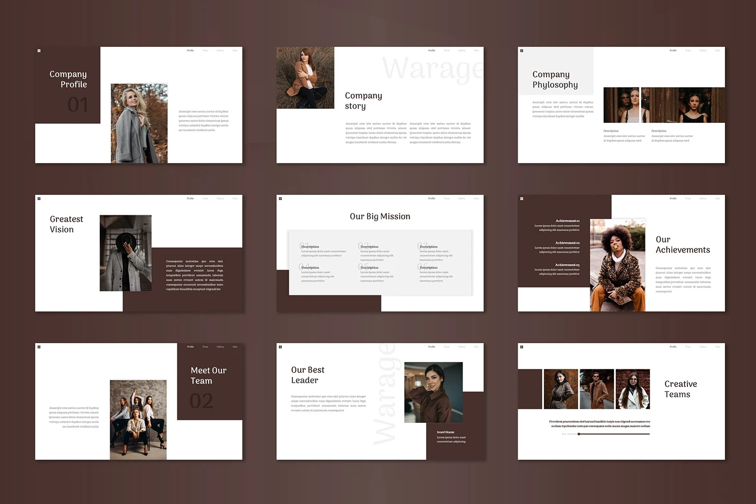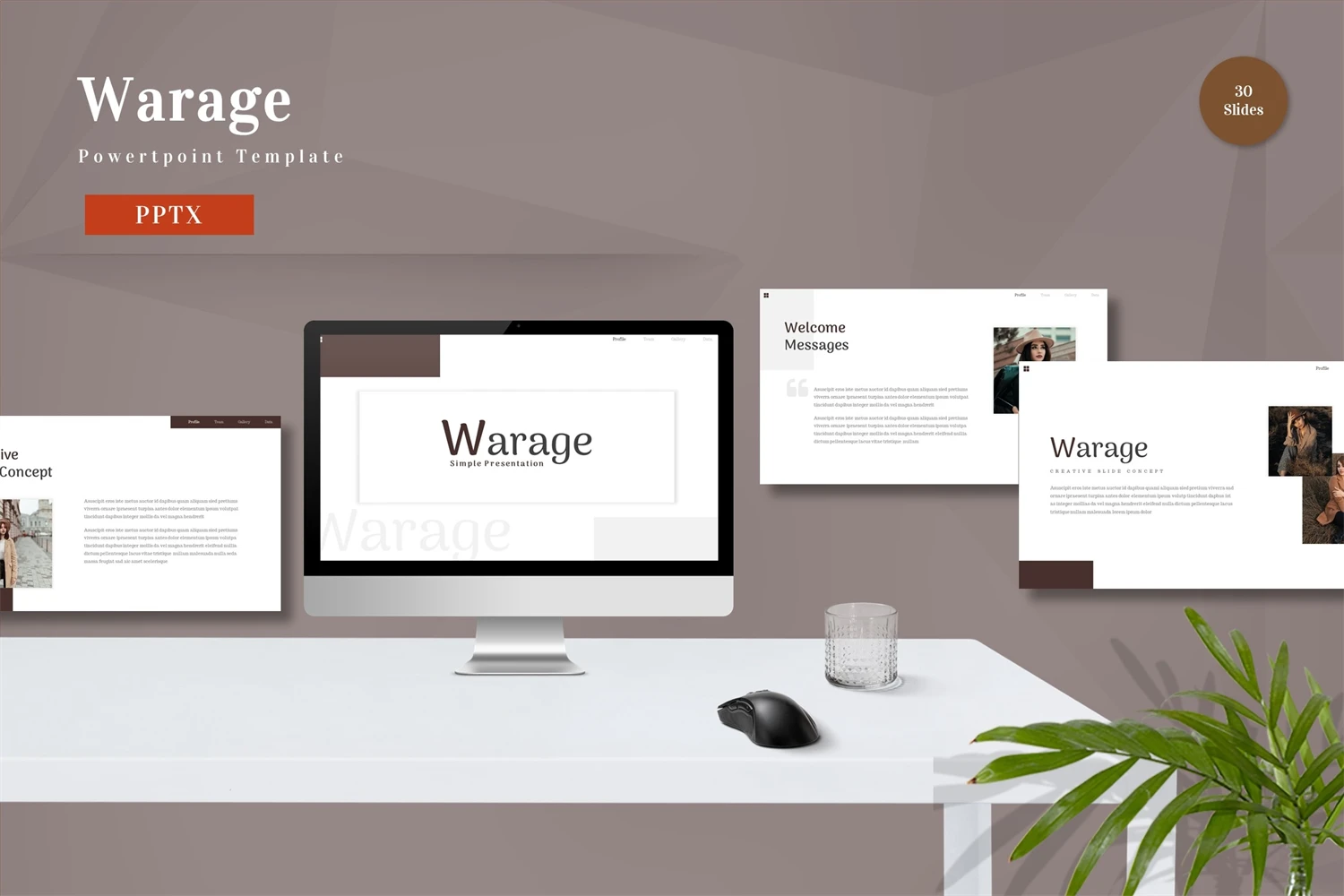 Get it now! **Warage - Powerpoint Template** for All Business and Personal Needs All elements on this template are editable; input your content, replace your image with a placeholder, change the color, and all presentations include an animated slide to present your slides.