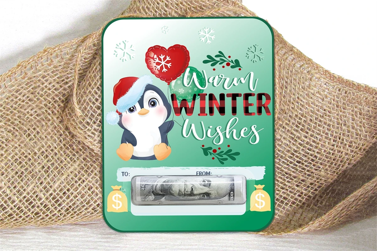Warm Winter Wishes Christmas Money Card PNG, Penguin Design