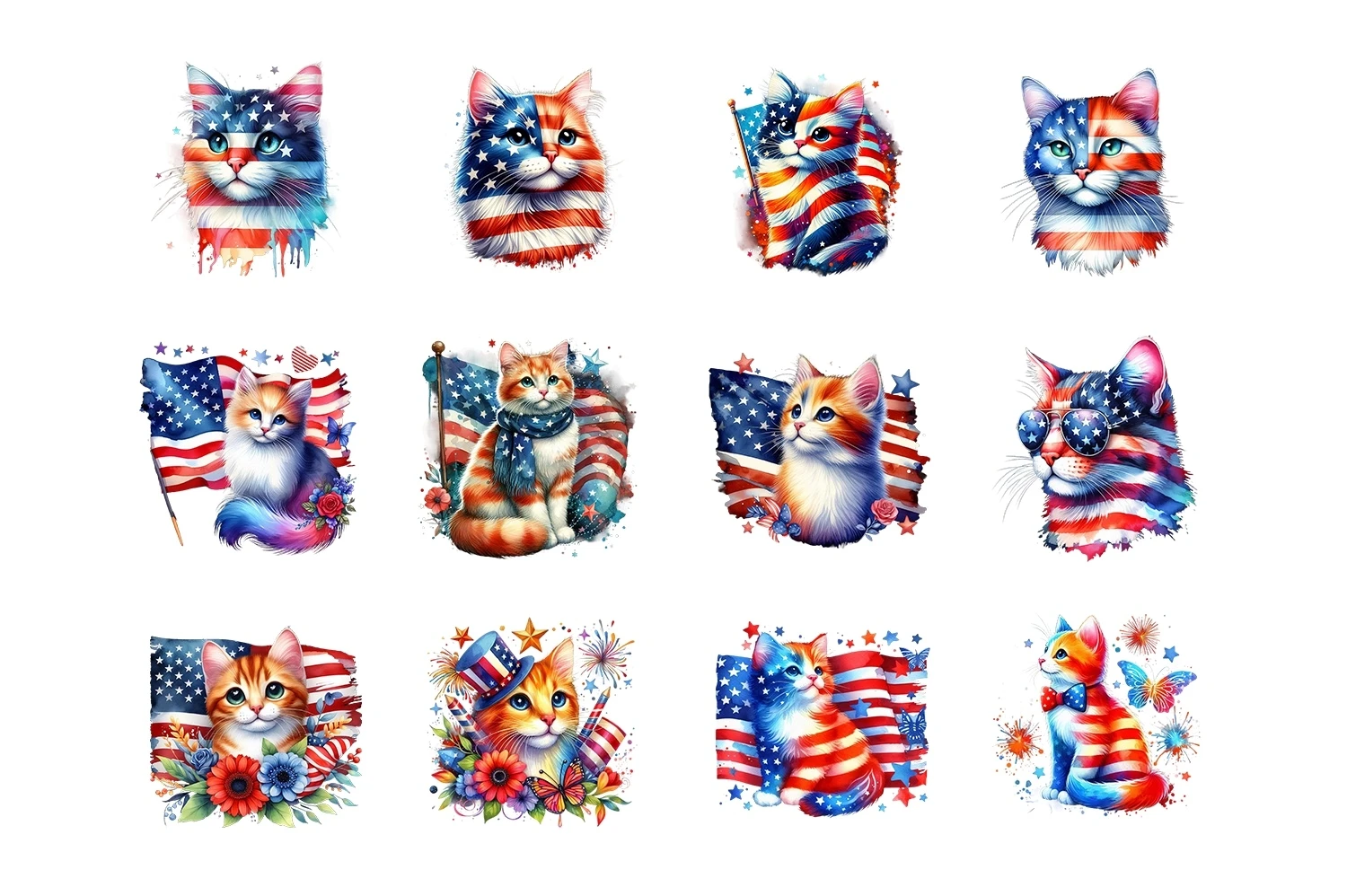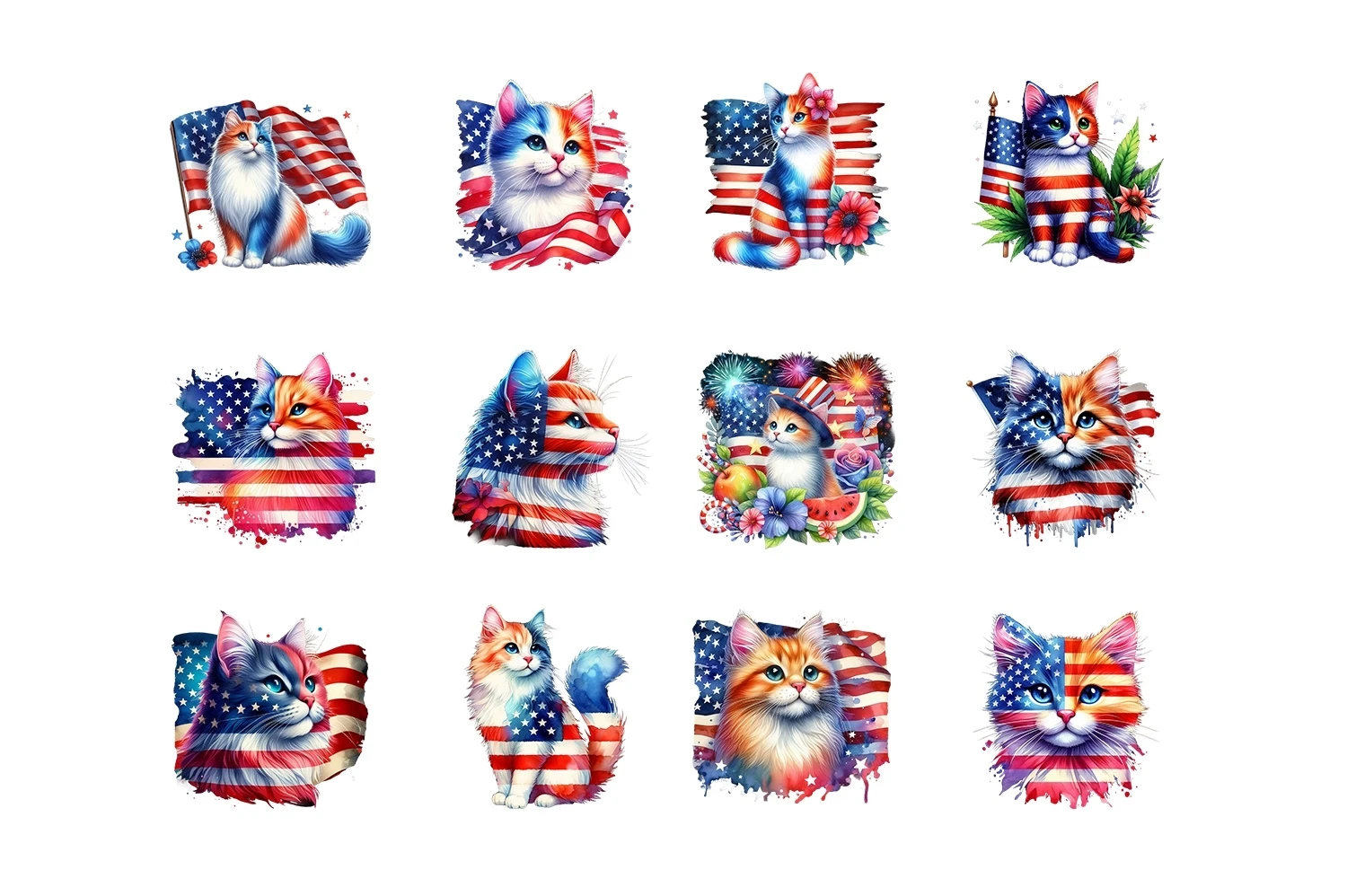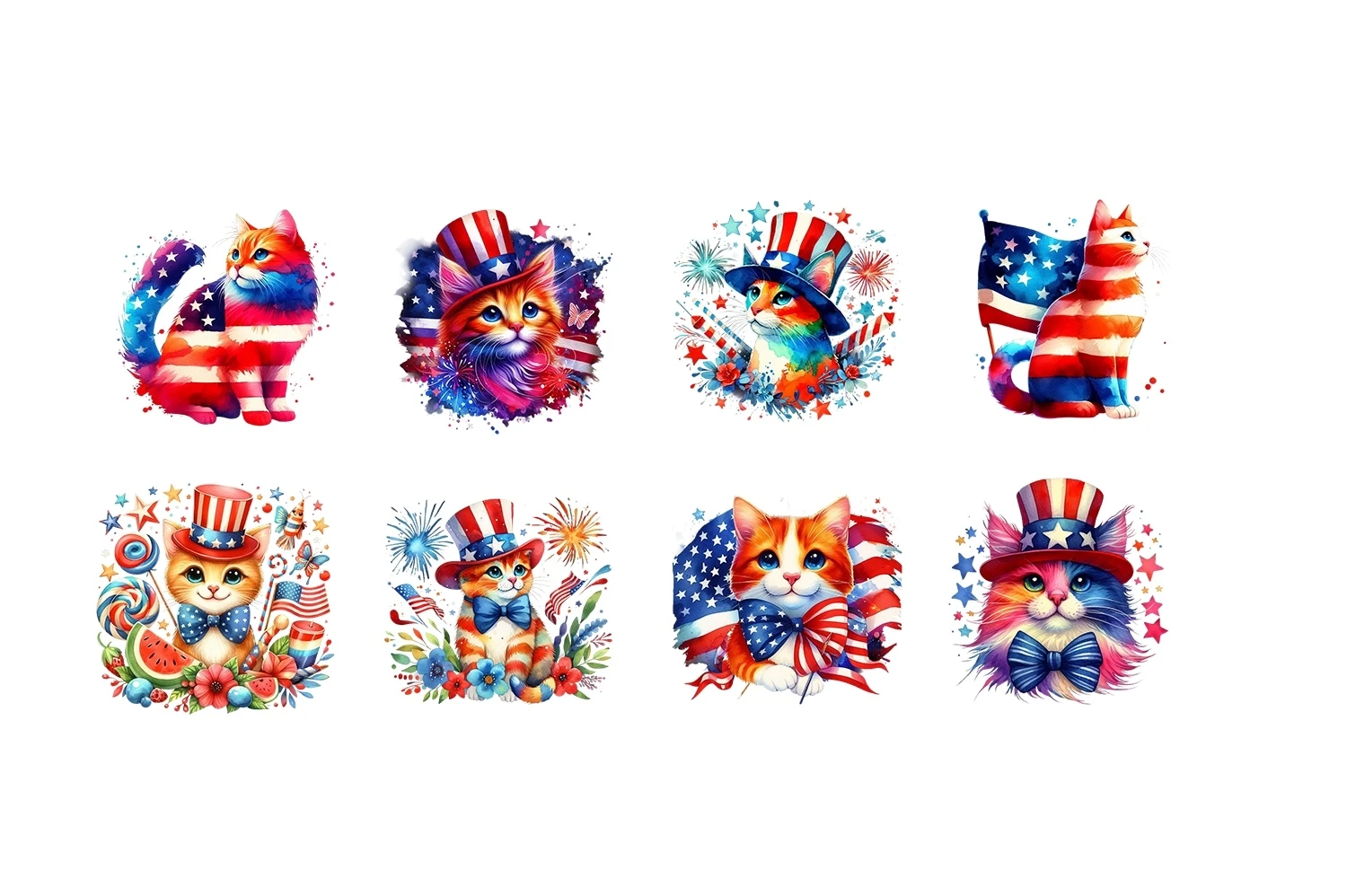 Watercolor 4th of July Cat Clipart Sublimation PNG (AI-generated).