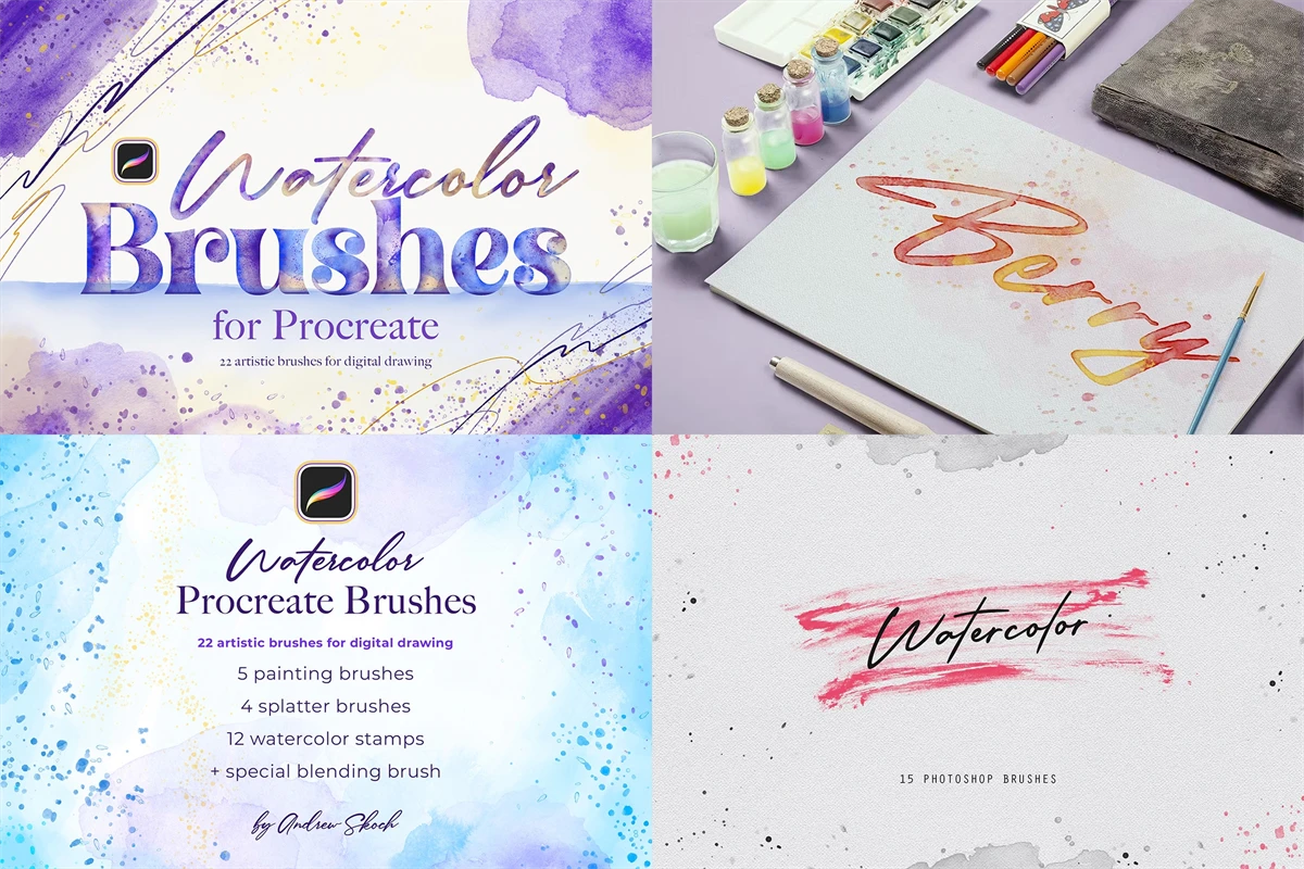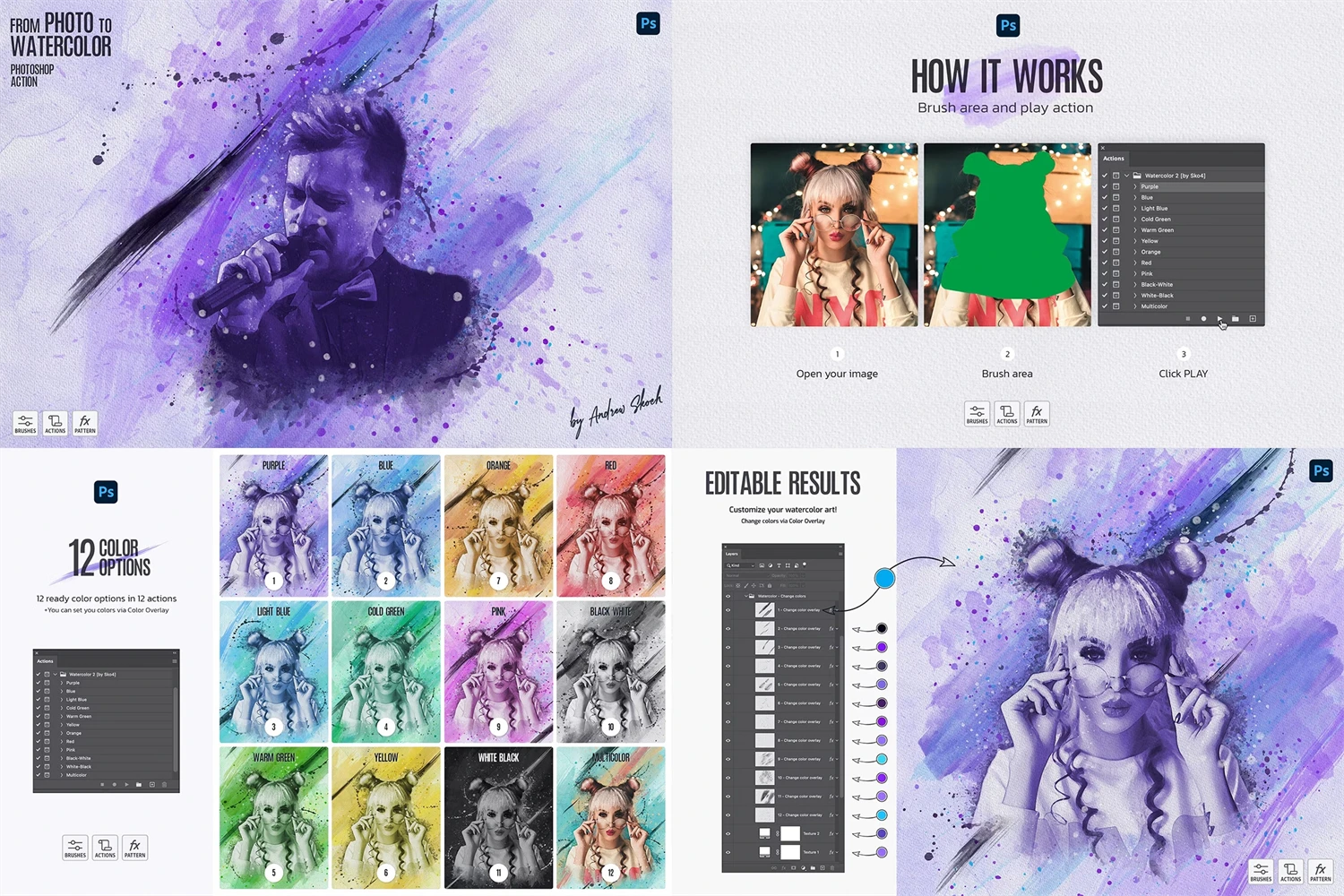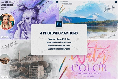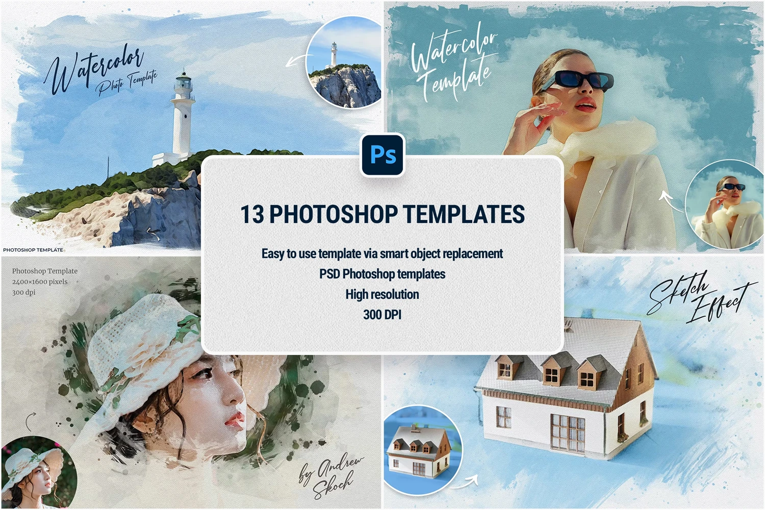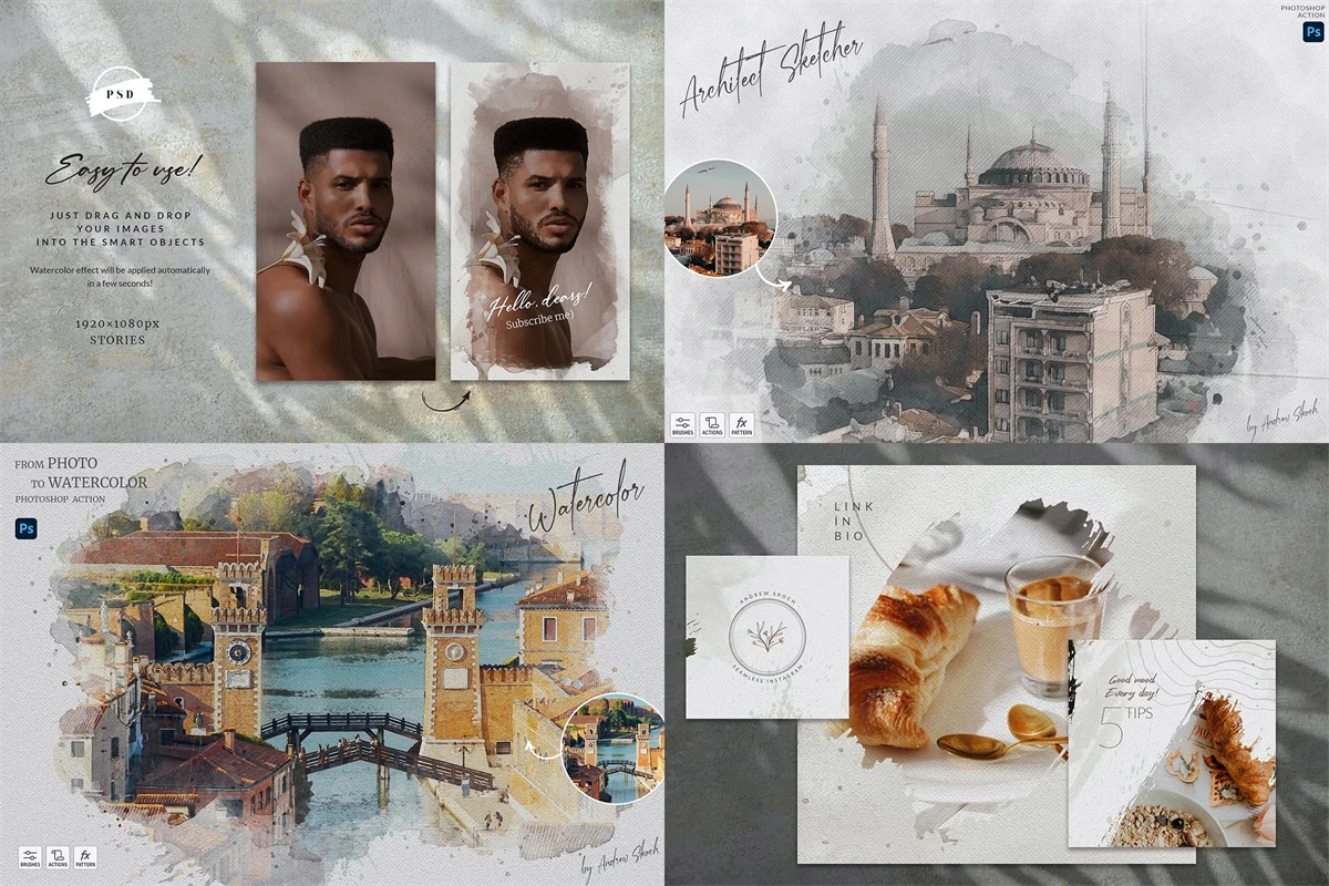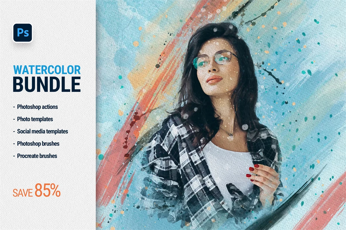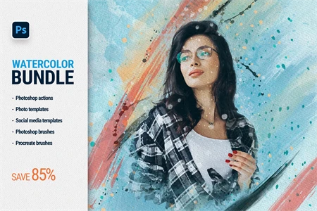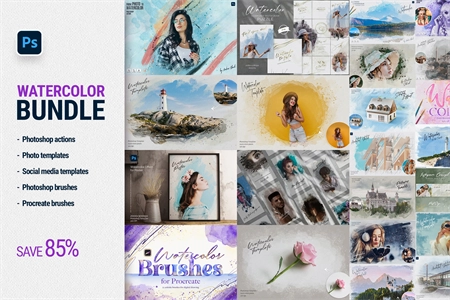 Big set of watercolor assets for Photoshop - actions and brushes, social media templates, photo templates.
