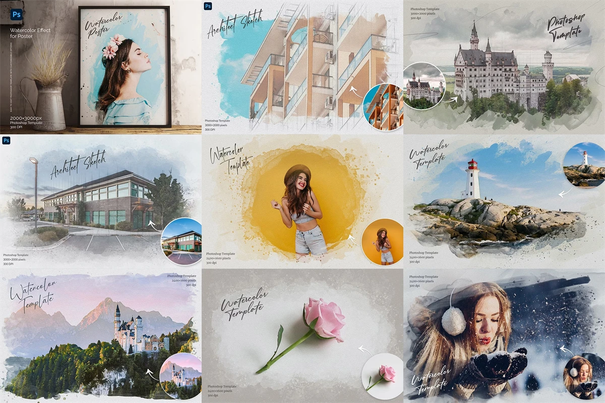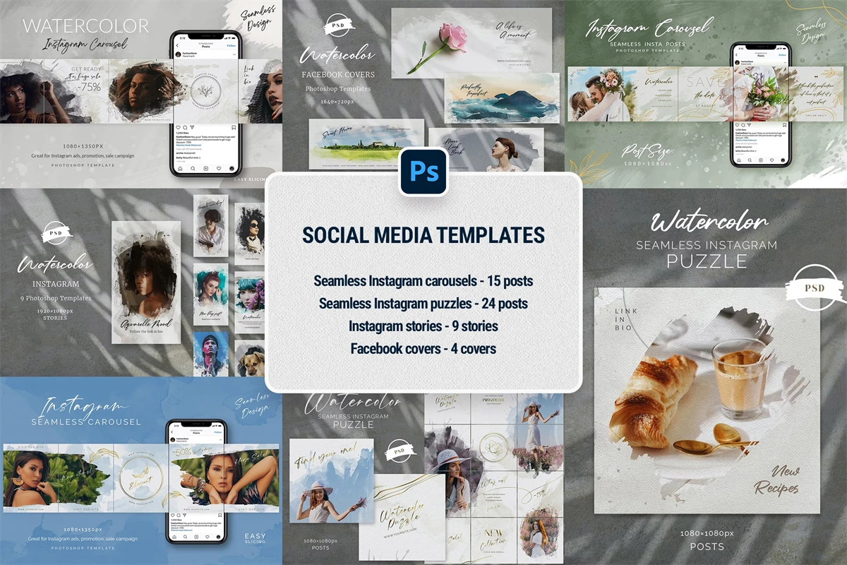 Get cool content with these templates bundle. You can make Instagram posts, Facebook posts, website banners, presentation slides, magazine pages, ad banners, postcards, posters and much more. Beautiful watercolor effects will open a word of artistic effects for you.