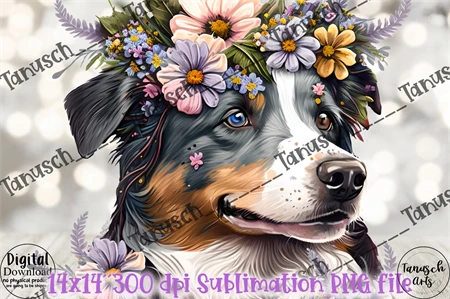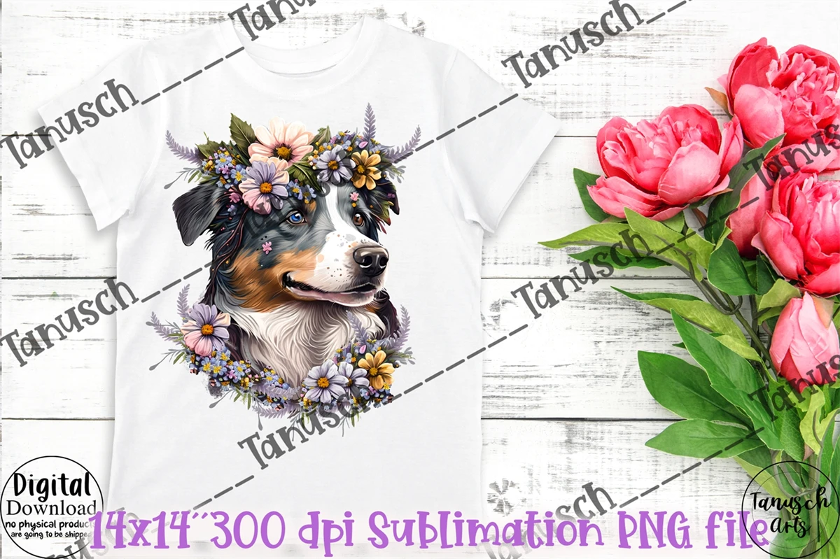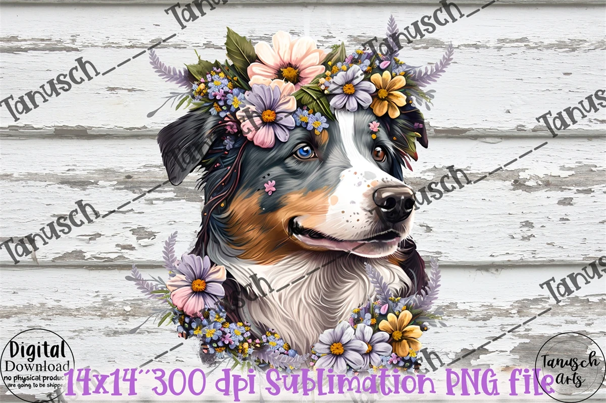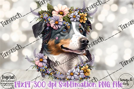 Hand painted cute Watercolor and mixed media Australian Shepherd with Flowers Sublimation