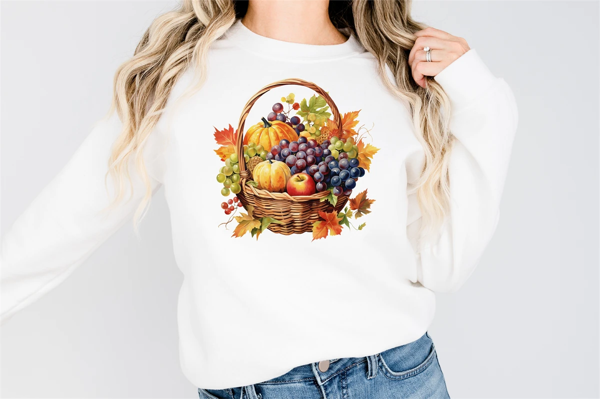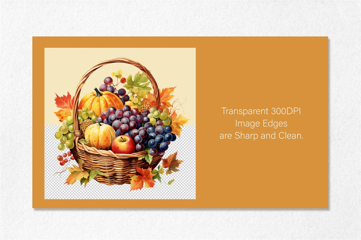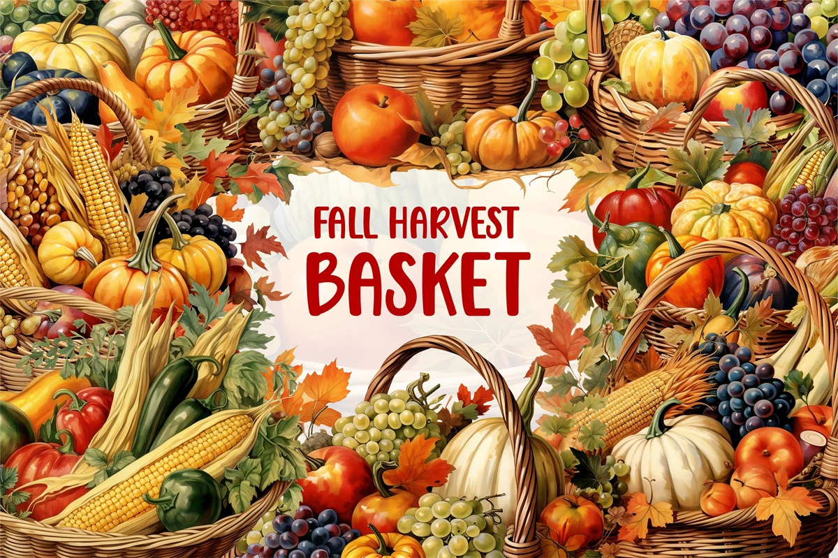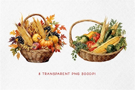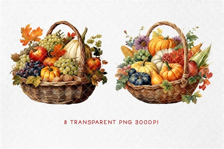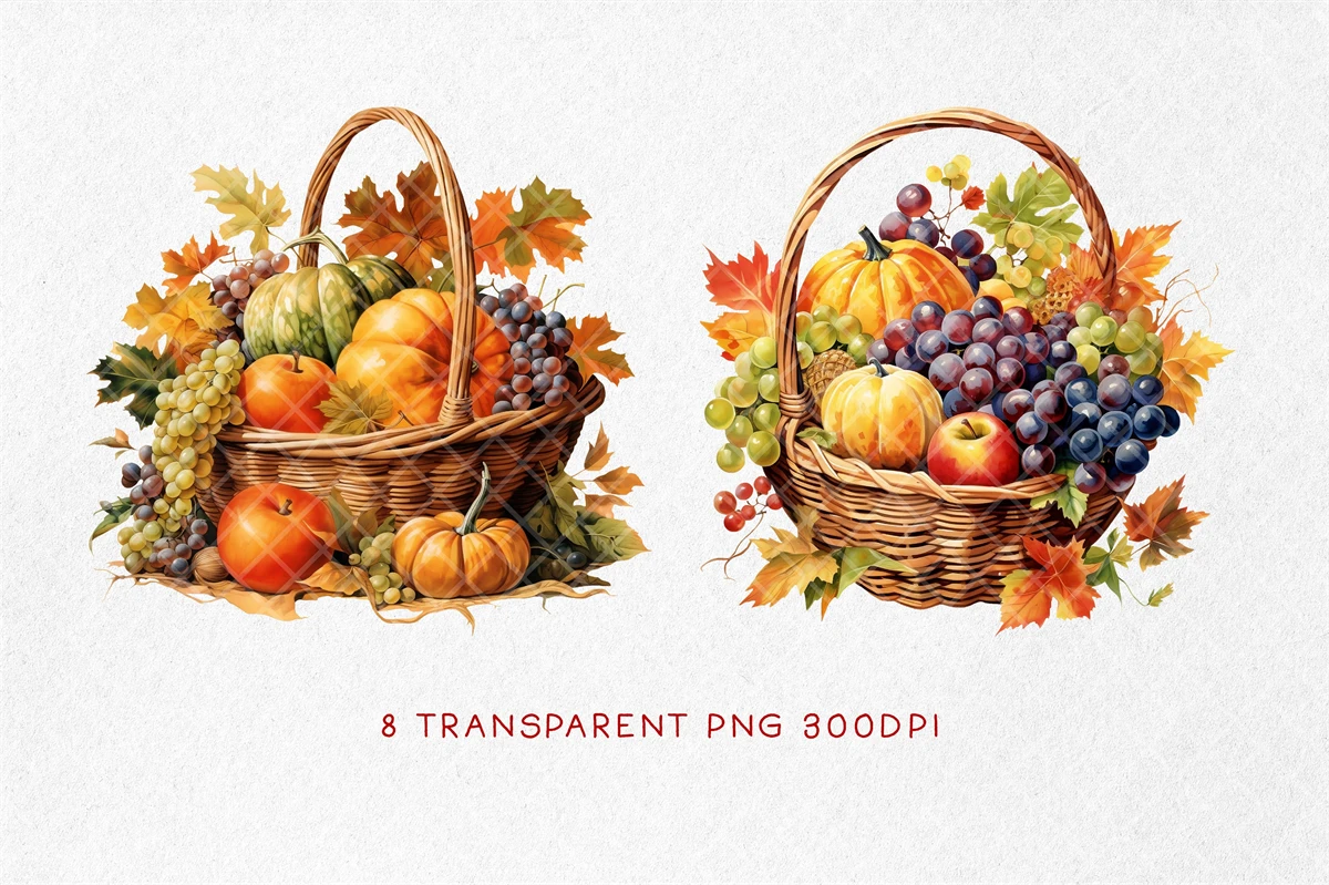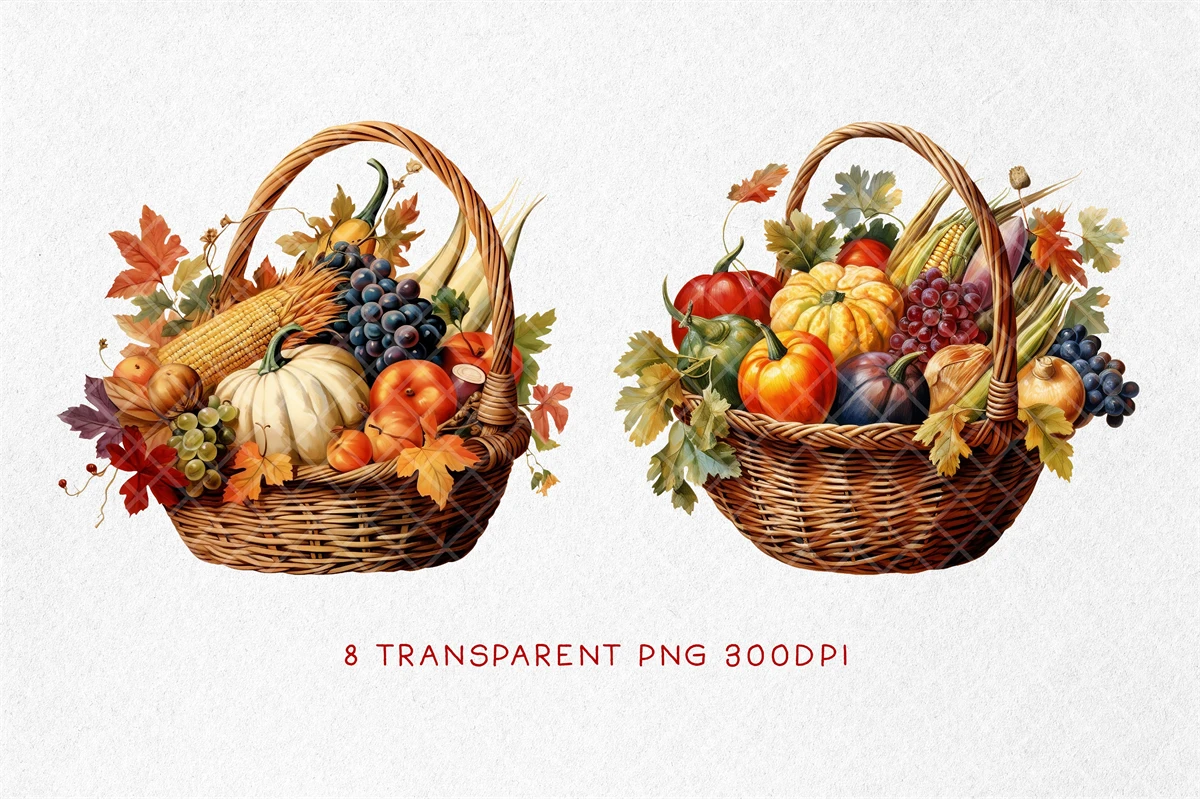 Watercolor Autumn Harvest Basket Clipart, Fall Vegetable PNG, Harvest Feast Clipart, Seasonal Clipart, Harvest basket, Fall fruit basket. All elements are high-resolution (300dpi) PNG files with transparent backgrounds.