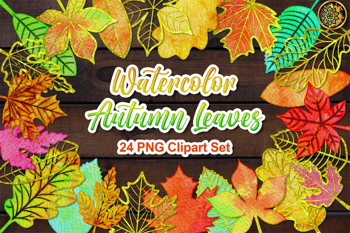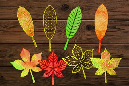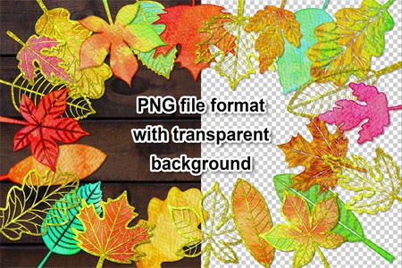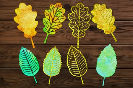 Watercolor Fall Autumn Leaves PNG Clipart Set Silhouette Outline Isolated Stencils Designs on Realistic Paper Texture for DIY Craft Projects. Great PNG set for creating a handmade gift in any performance, poster printing, wall art, or even creating a seamless pattern for a POD project.