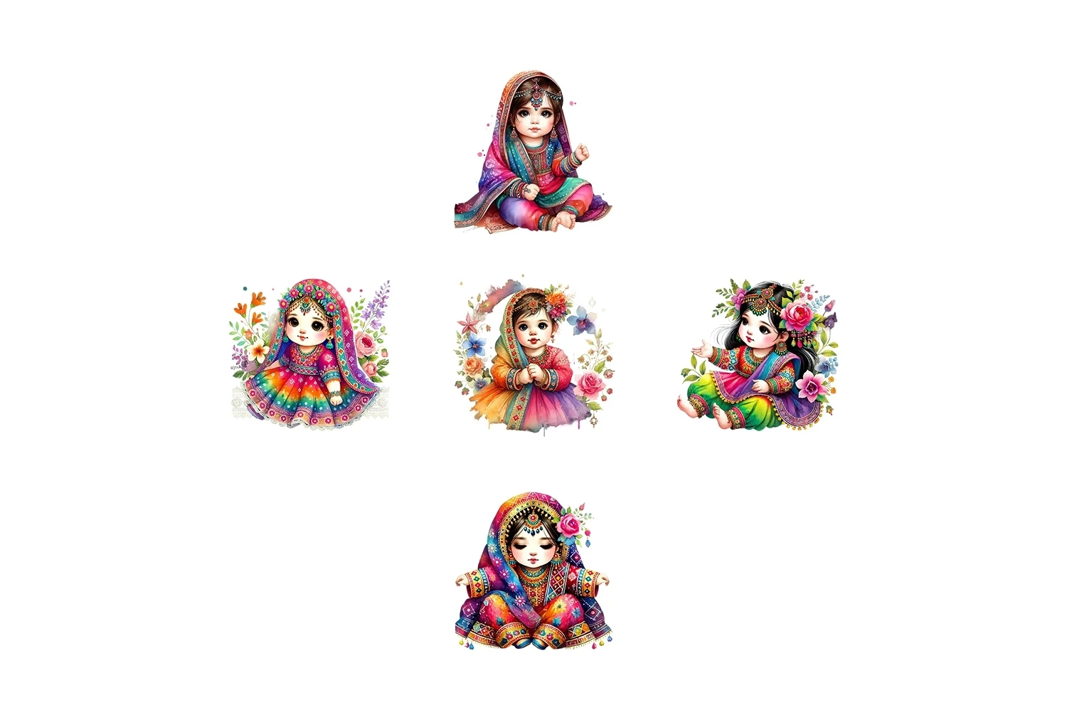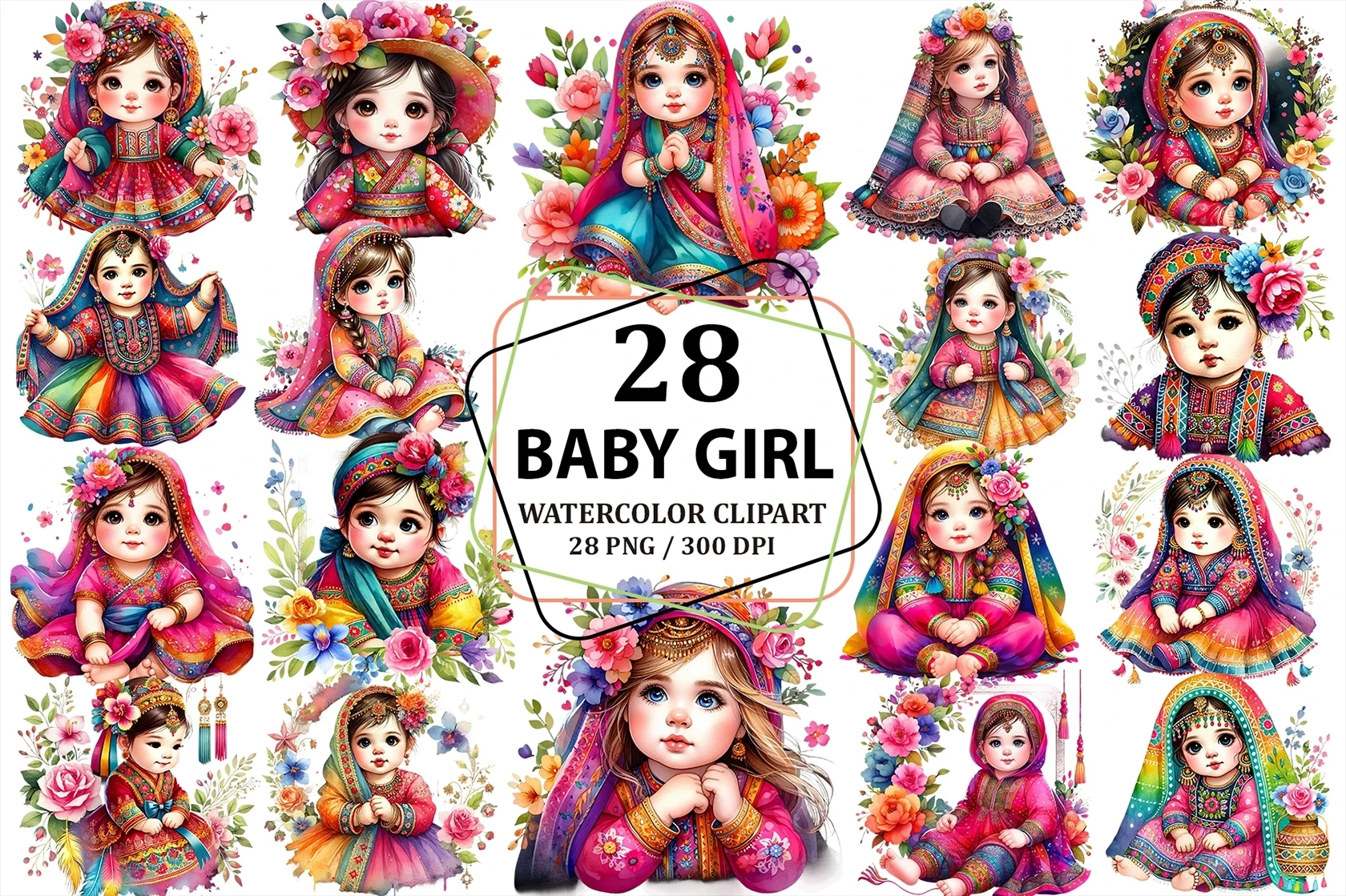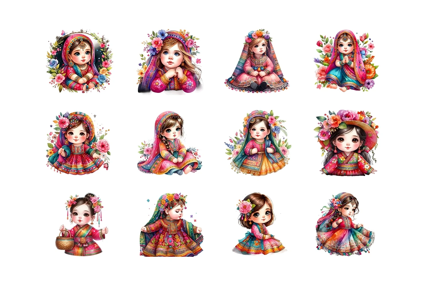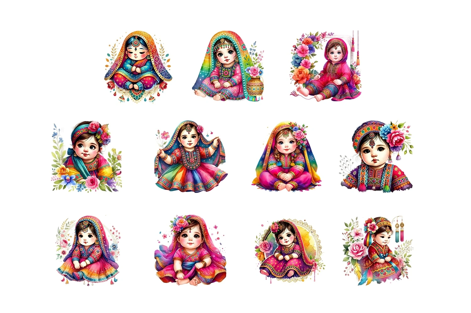 Watercolor Baby Girl in Traditional Dress Clipart PNG (AI-generated).