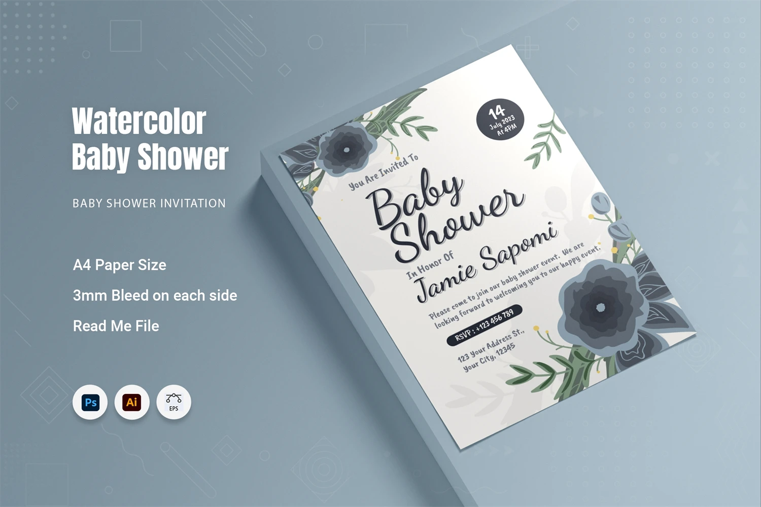 A **Watercolor Baby Shower Invitation** can be used for your baby shower or baby's birthday. You could also use it as a promotion for baby and parent photography services. Match the needs, whether personal or business. This template is easy to adjust and easy for you to edit according to your taste.