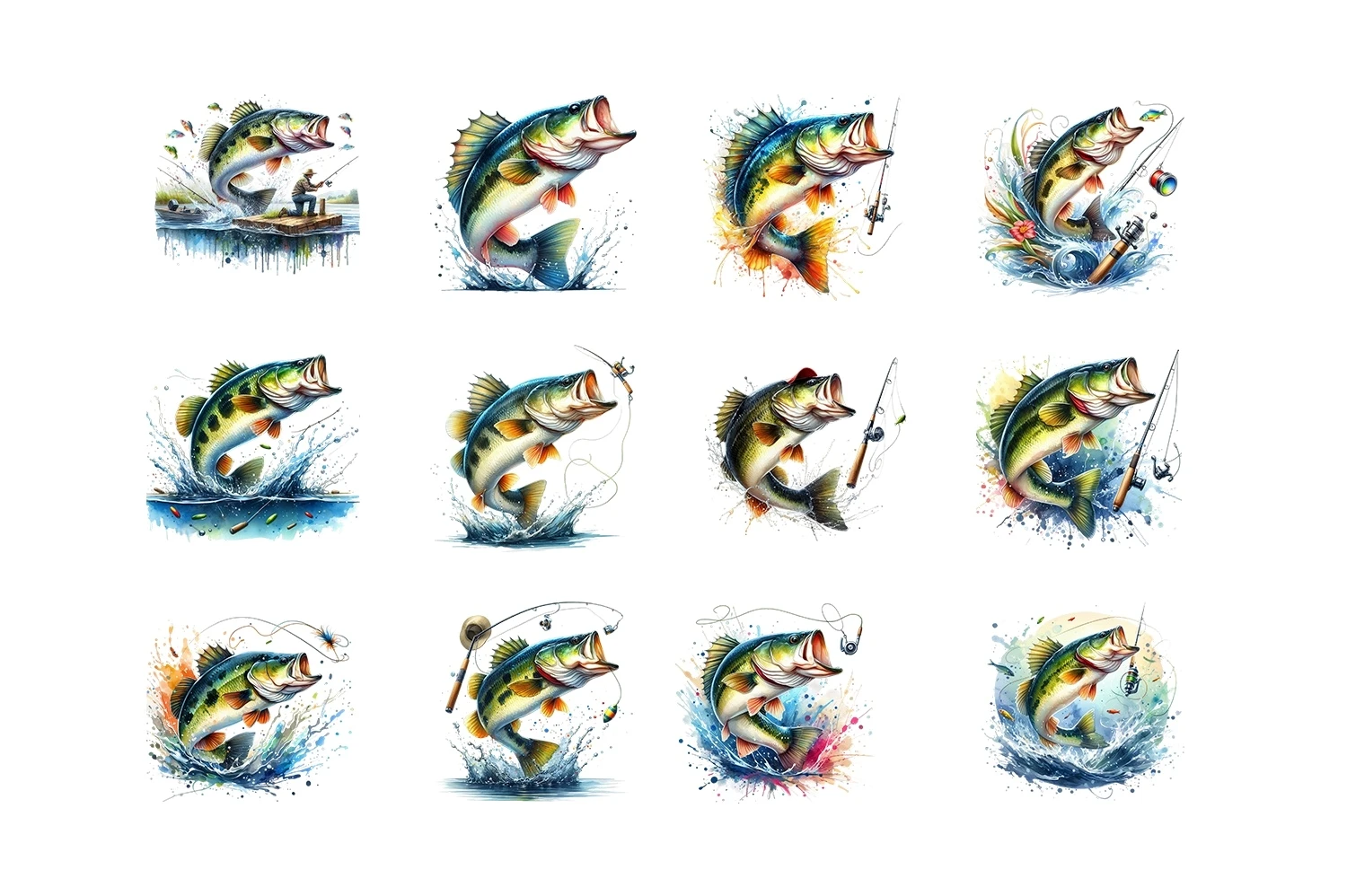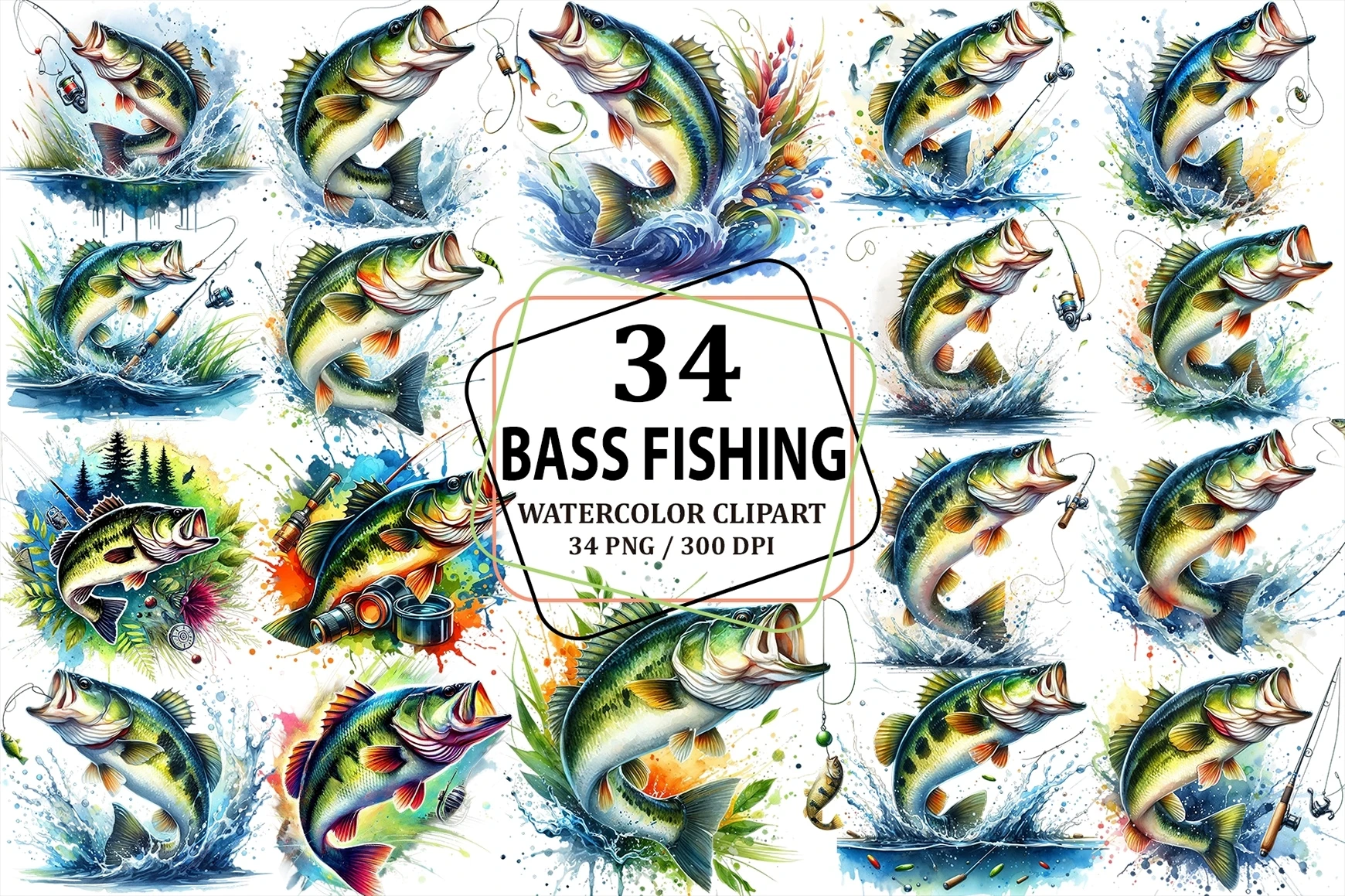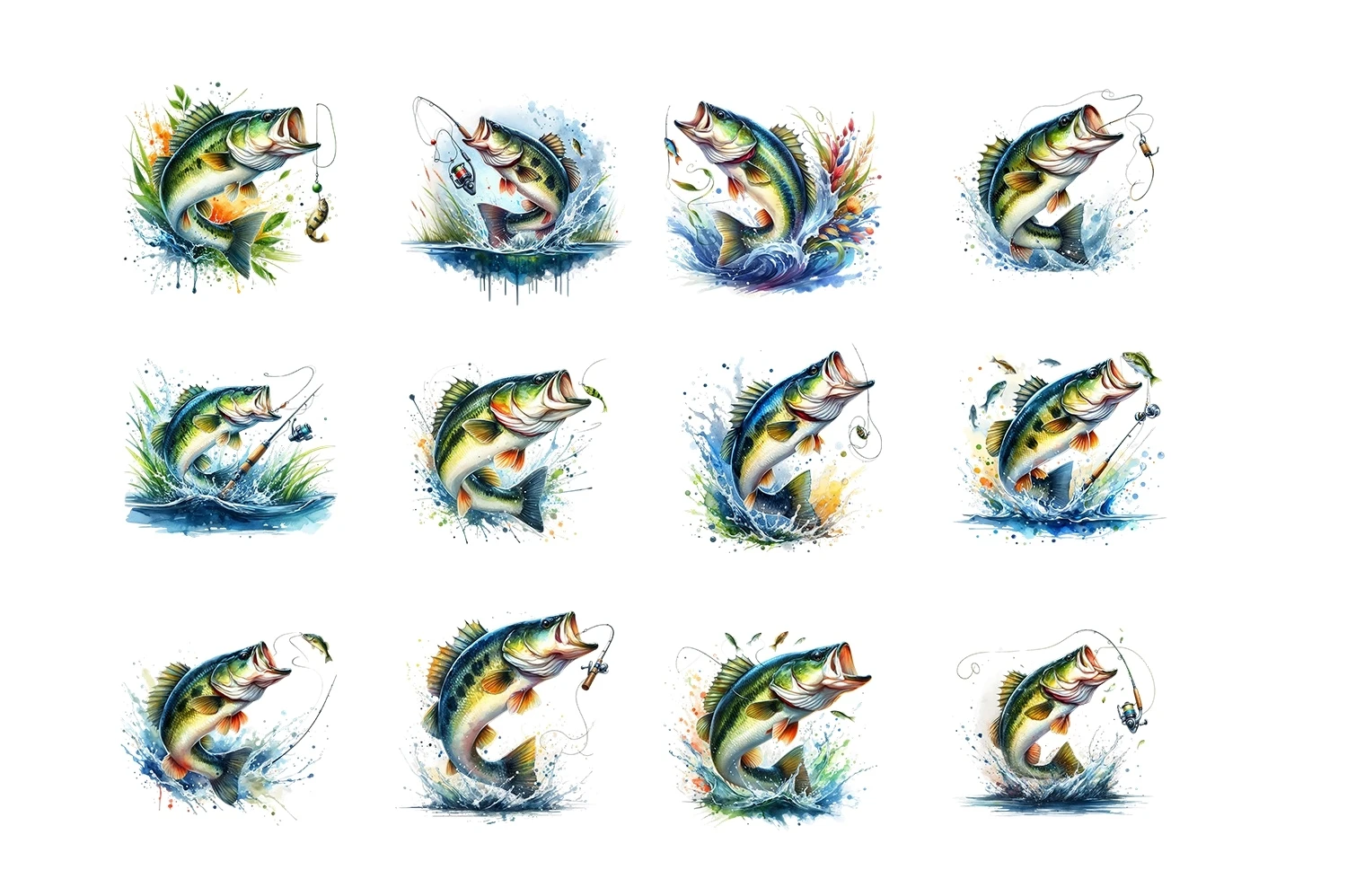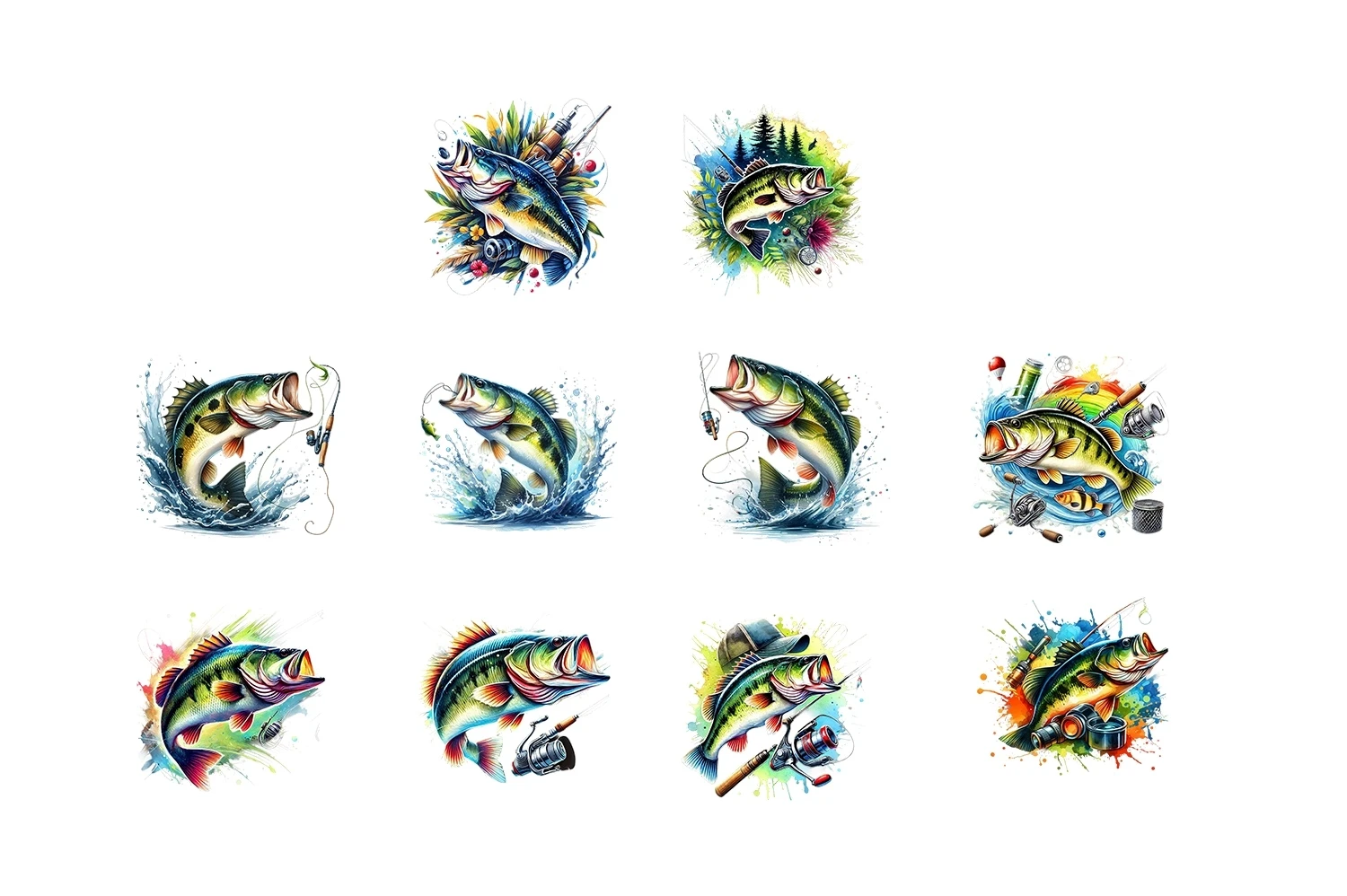 Watercolor Bass Fishing Clipart Sublimation PNG (AI-generated).