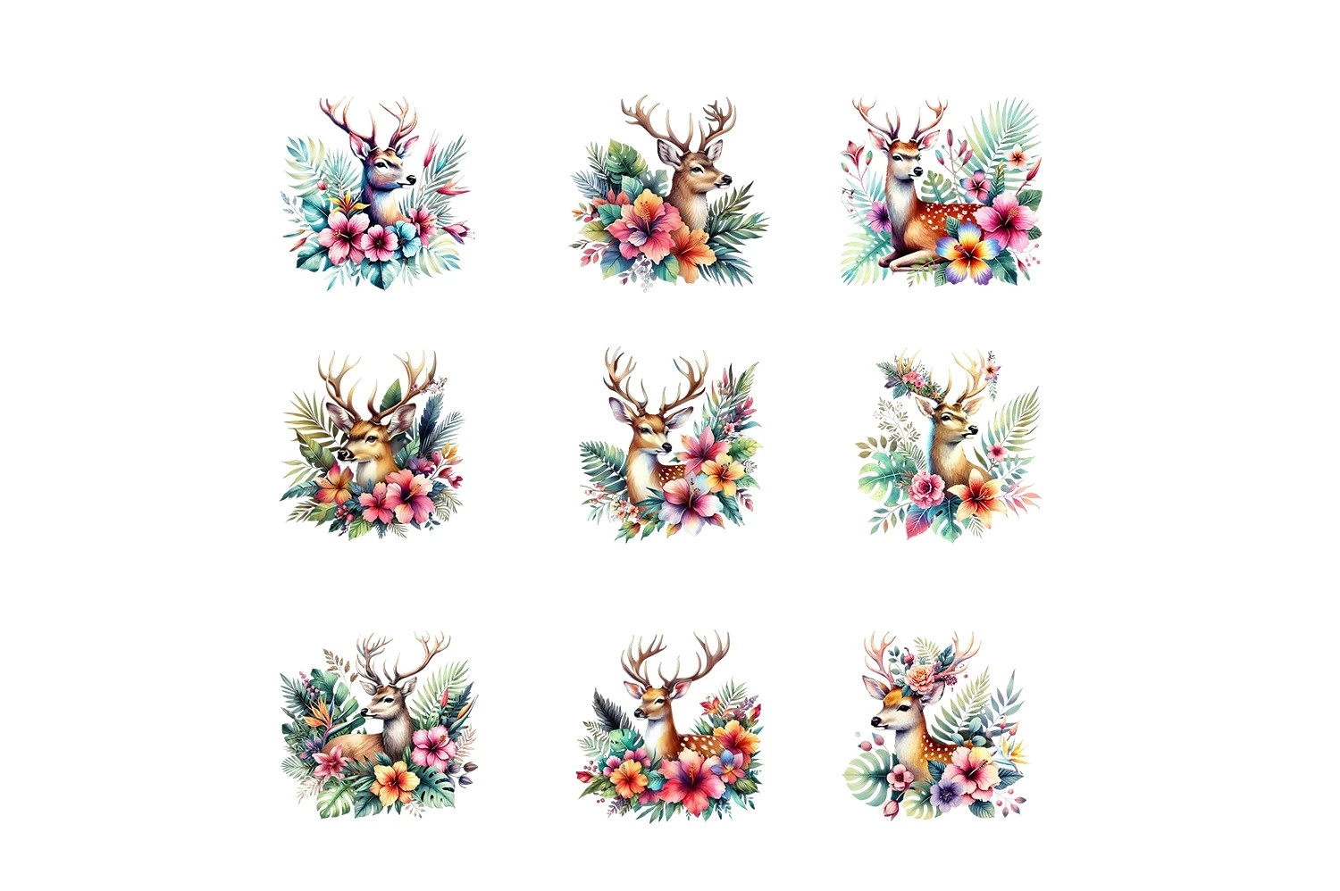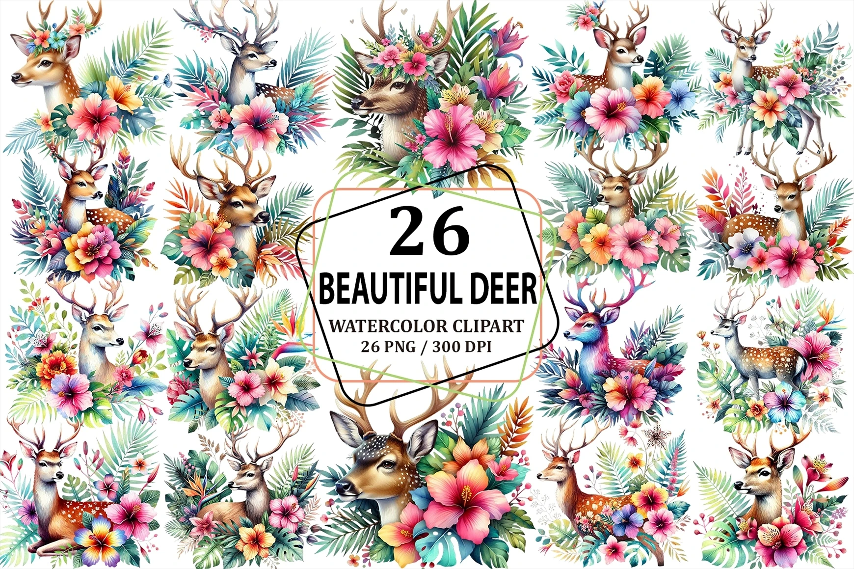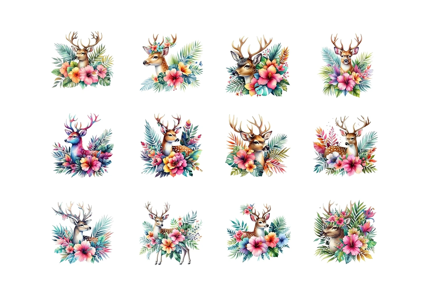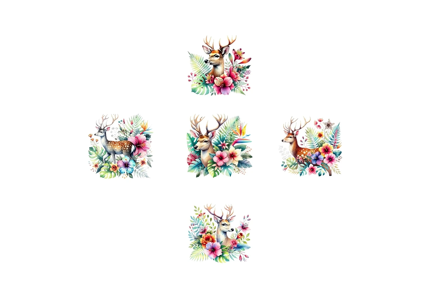 Watercolor Beautiful Deer with Tropical Floral Clipart (AI-generated).