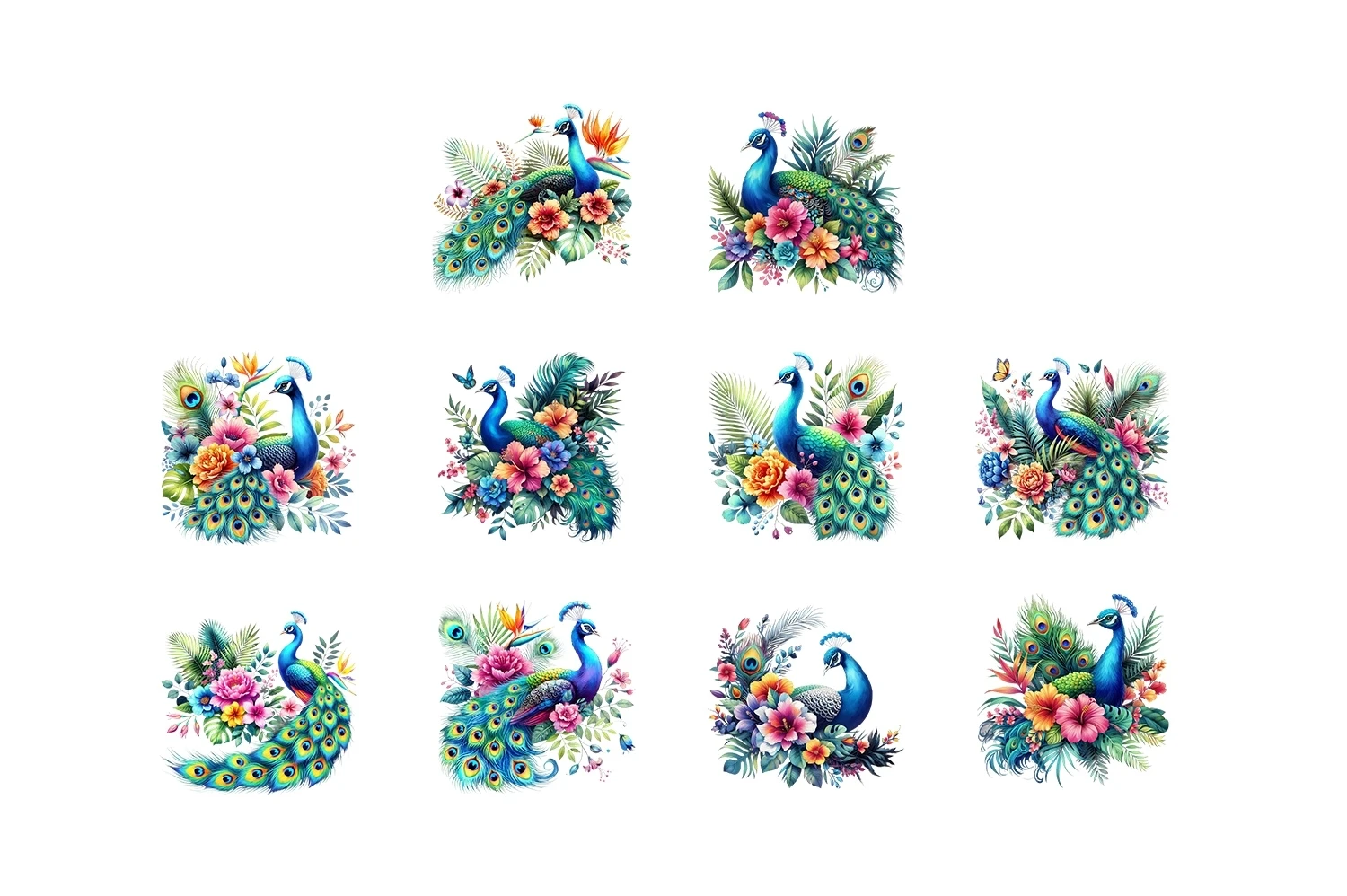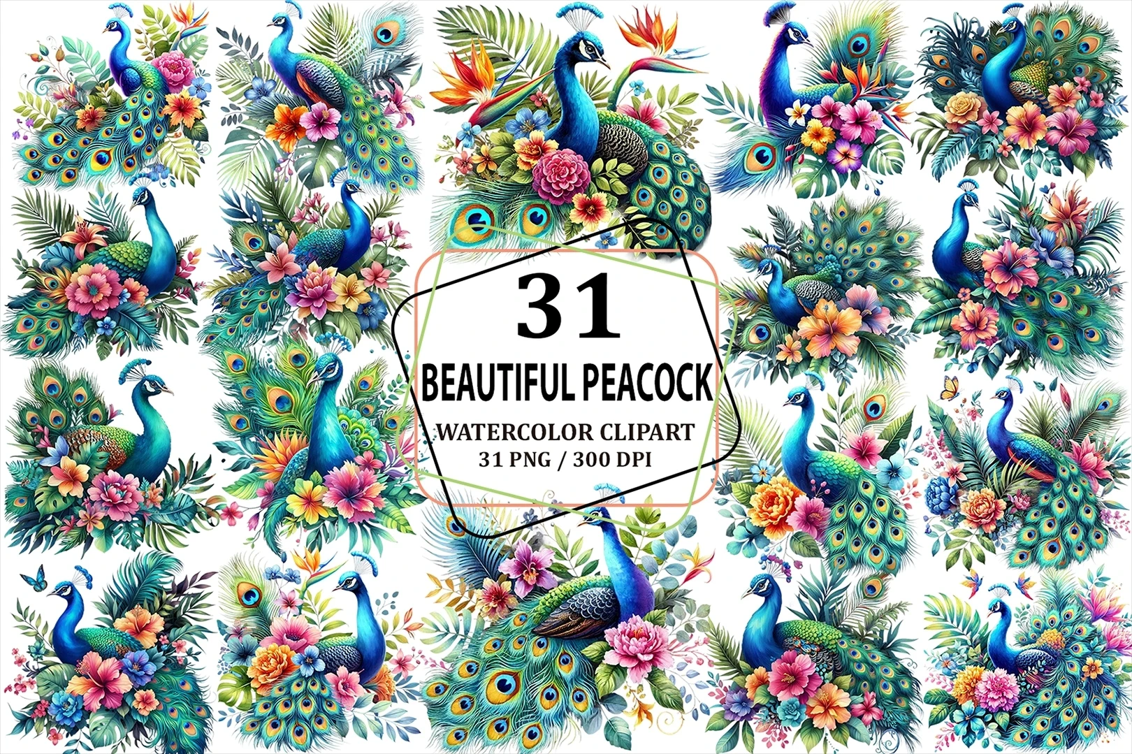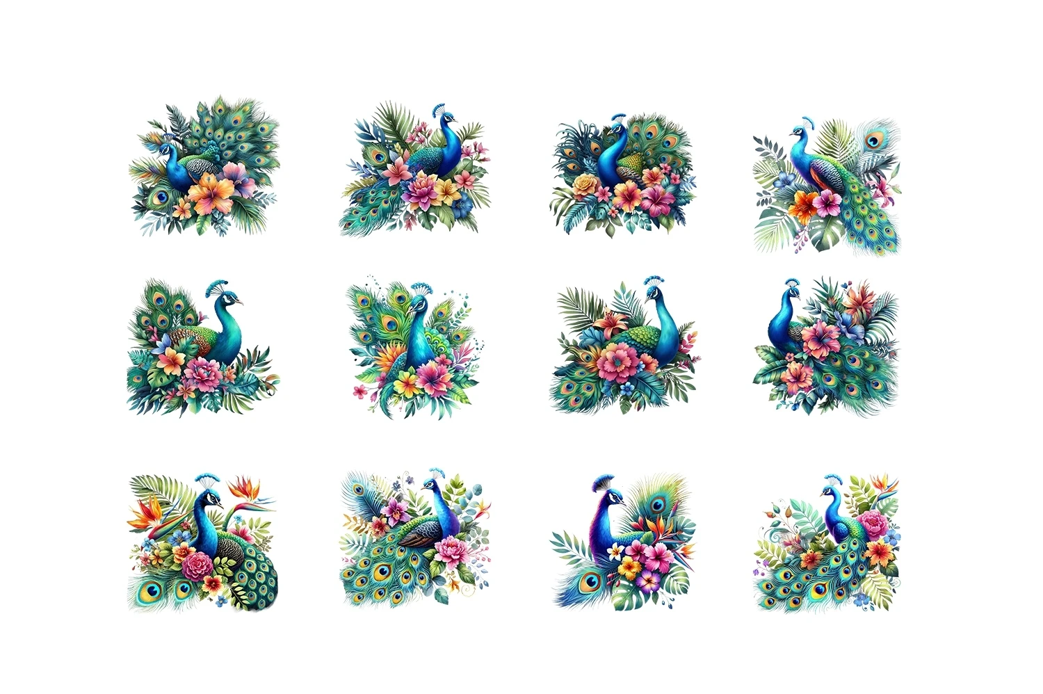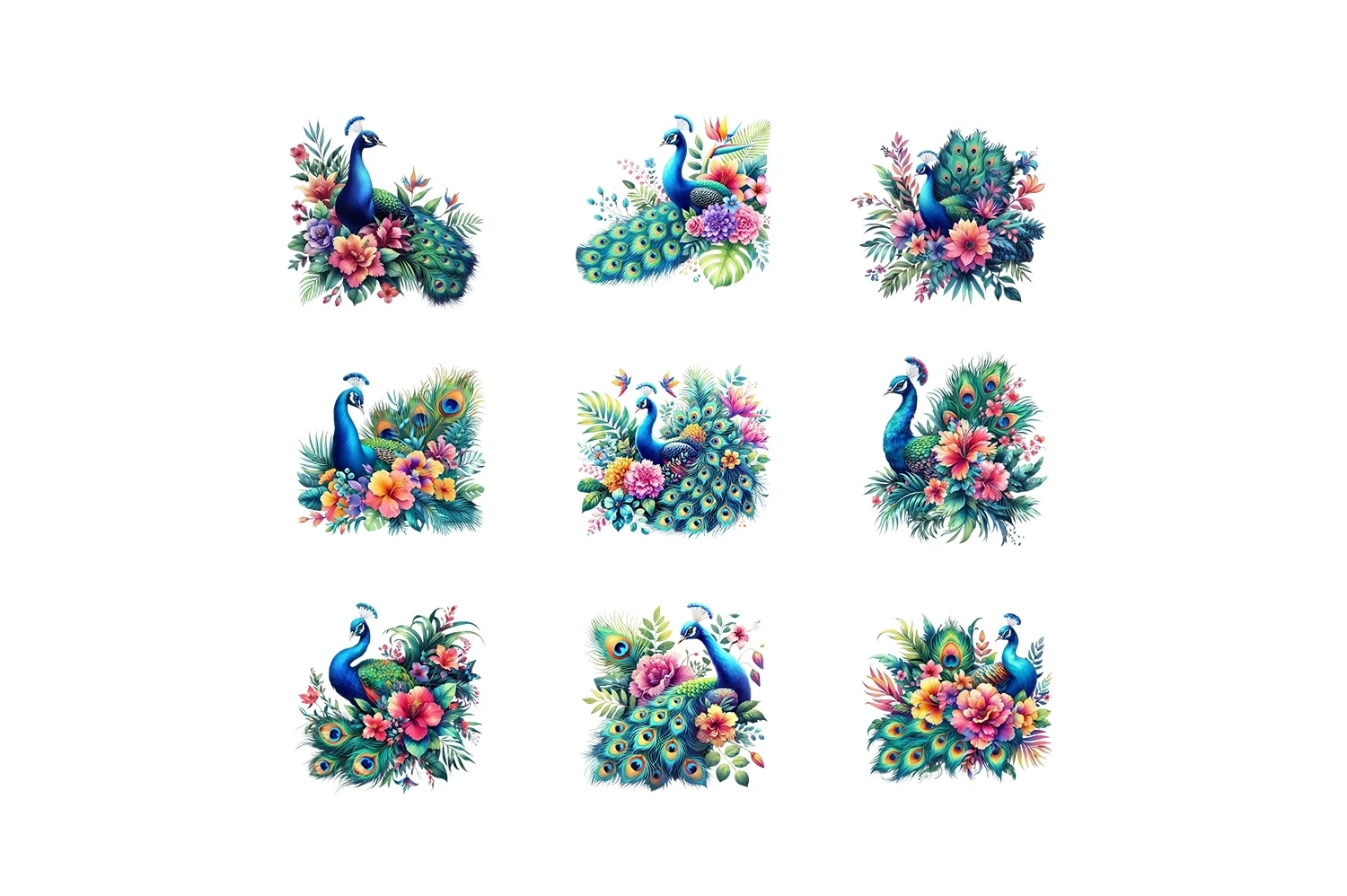 Watercolor Beautiful Peacock with Tropical Floral Clipart (AI-generated).
