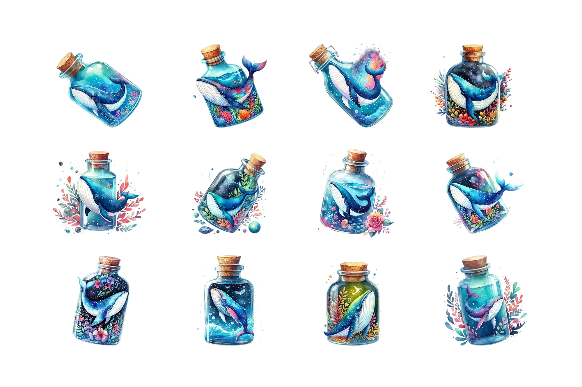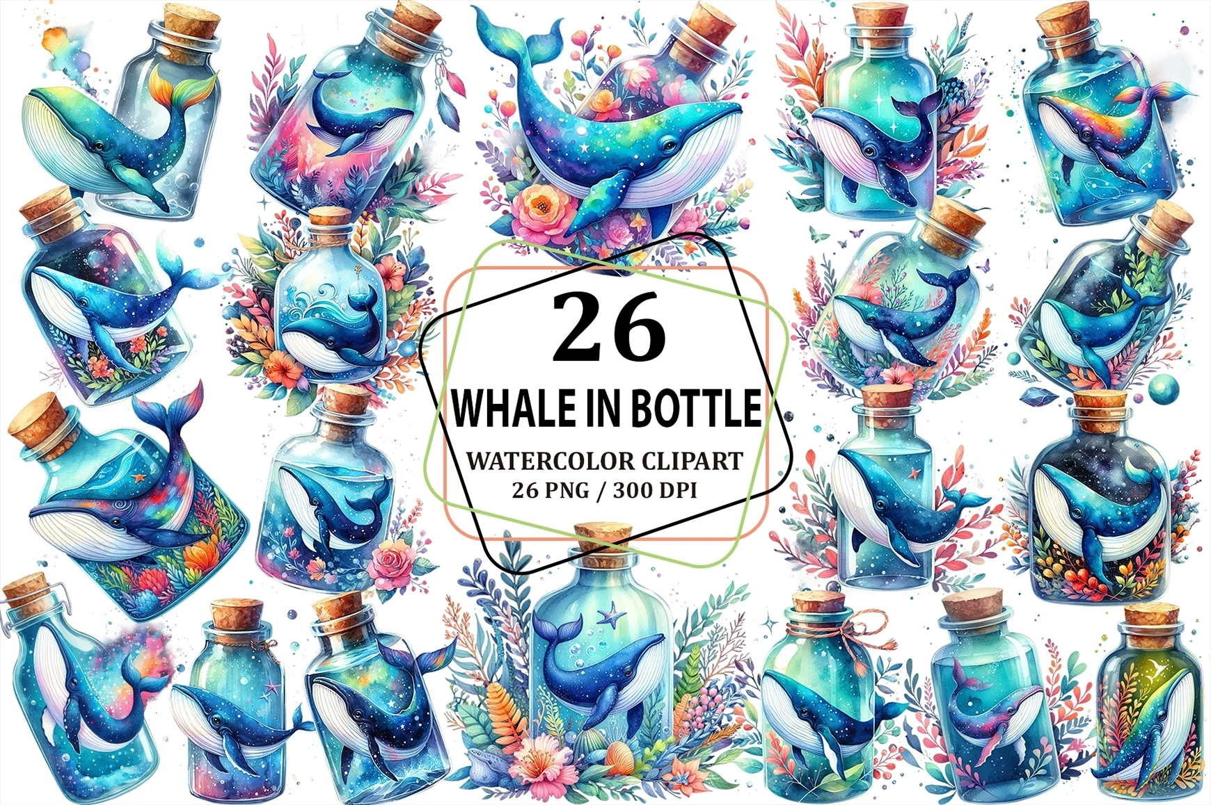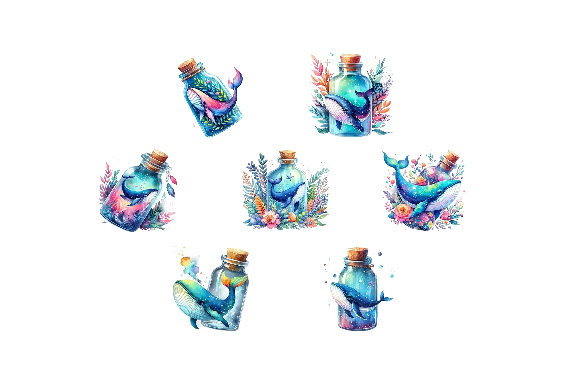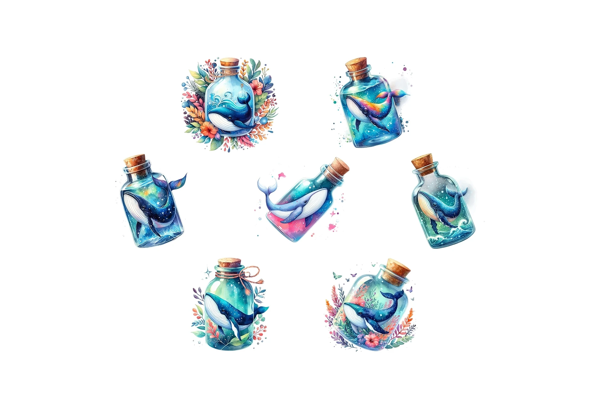 Watercolor Beautiful Whale in Bottle Clipart Sublimation (AI-generated).