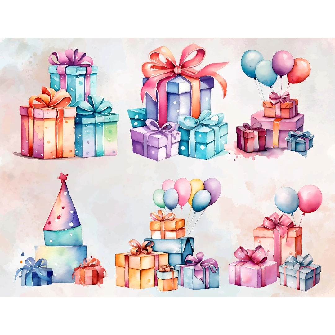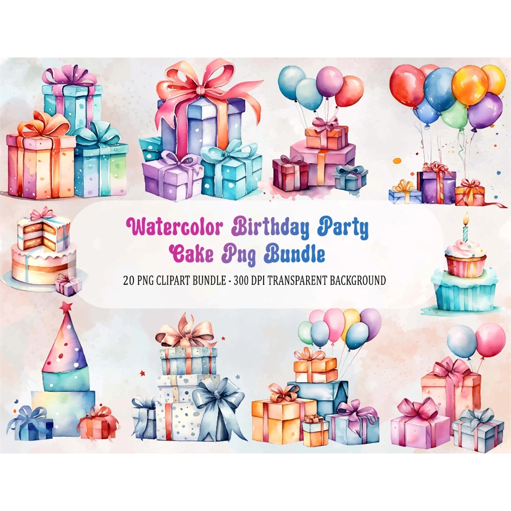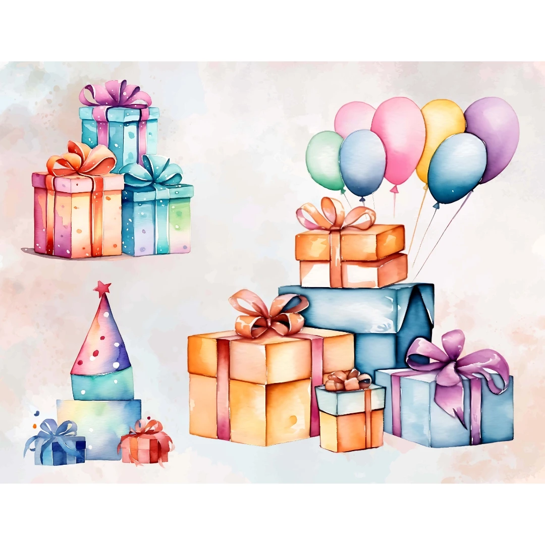 Watercolor Birthday Party Cake Present Balloons Clipart