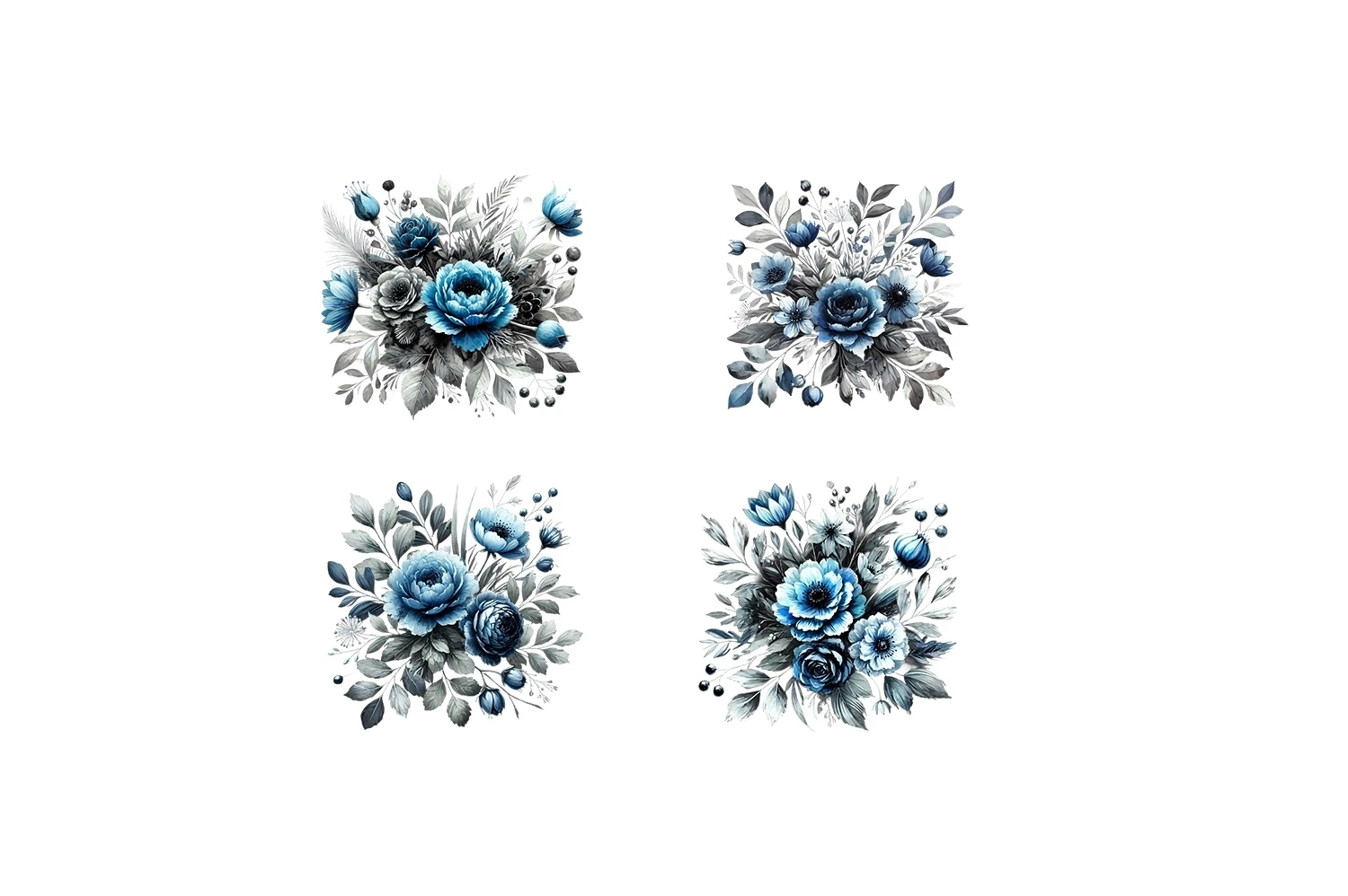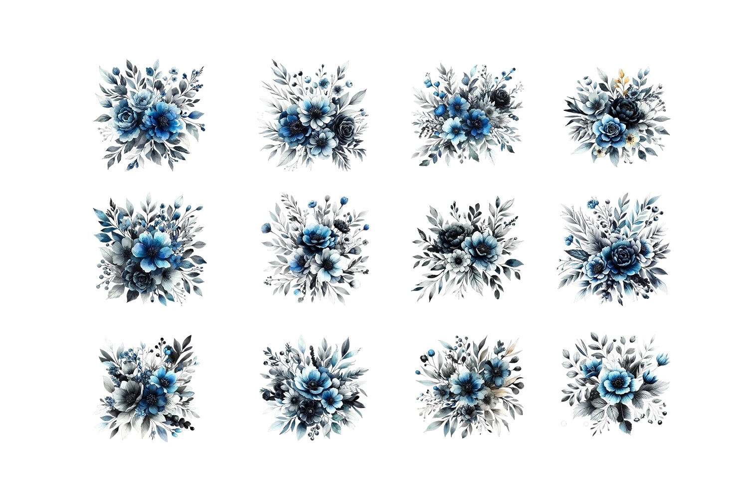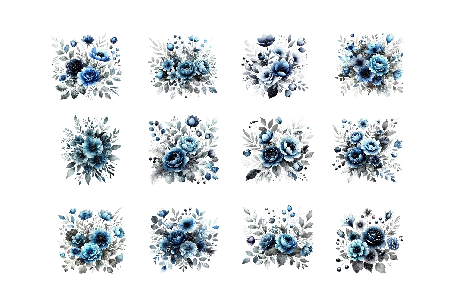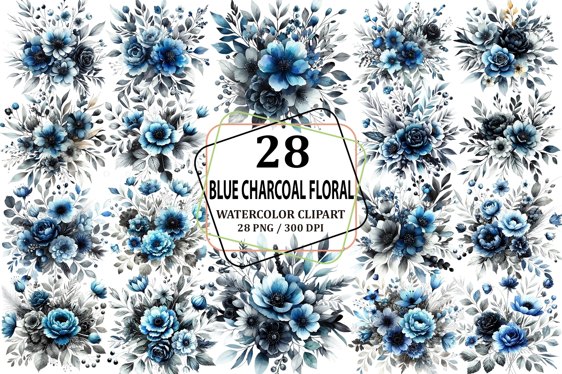 Watercolor Blue Charcoal Floral Clipart Sublimation PNG (AI-generated).