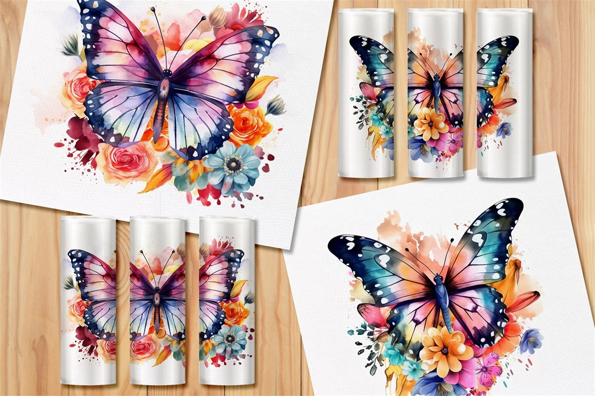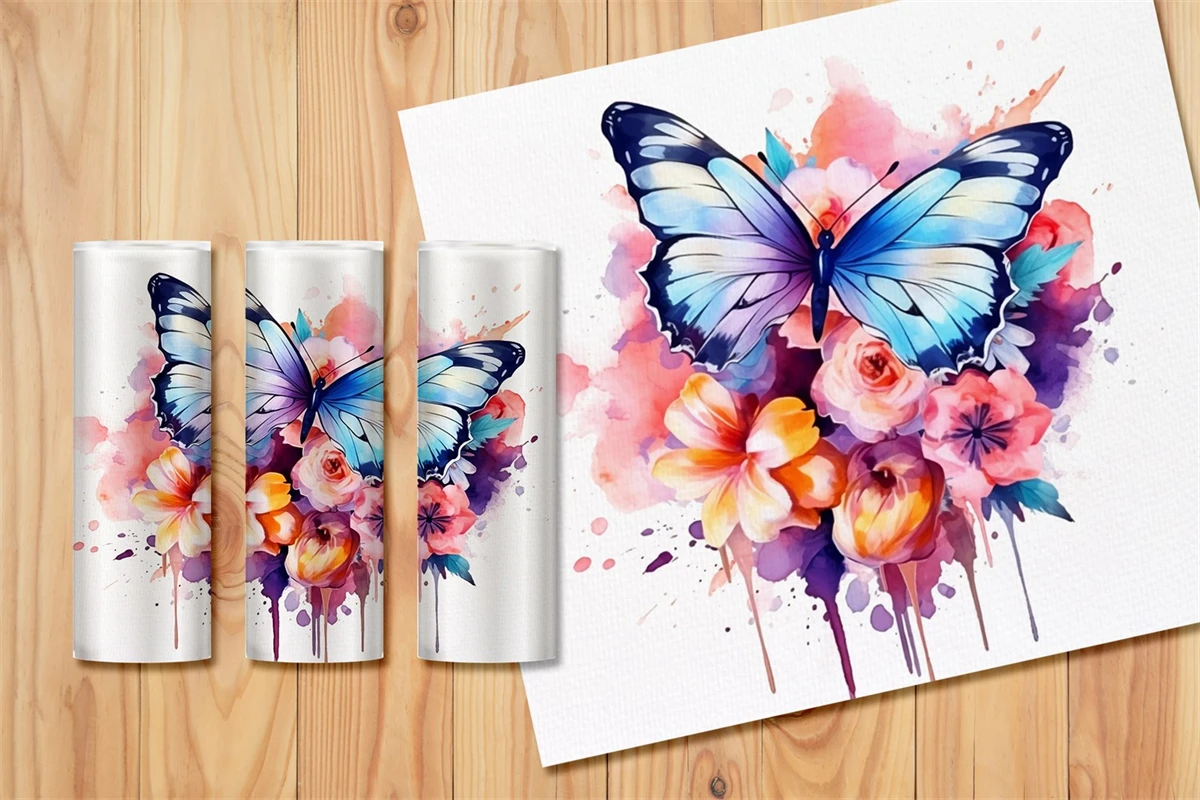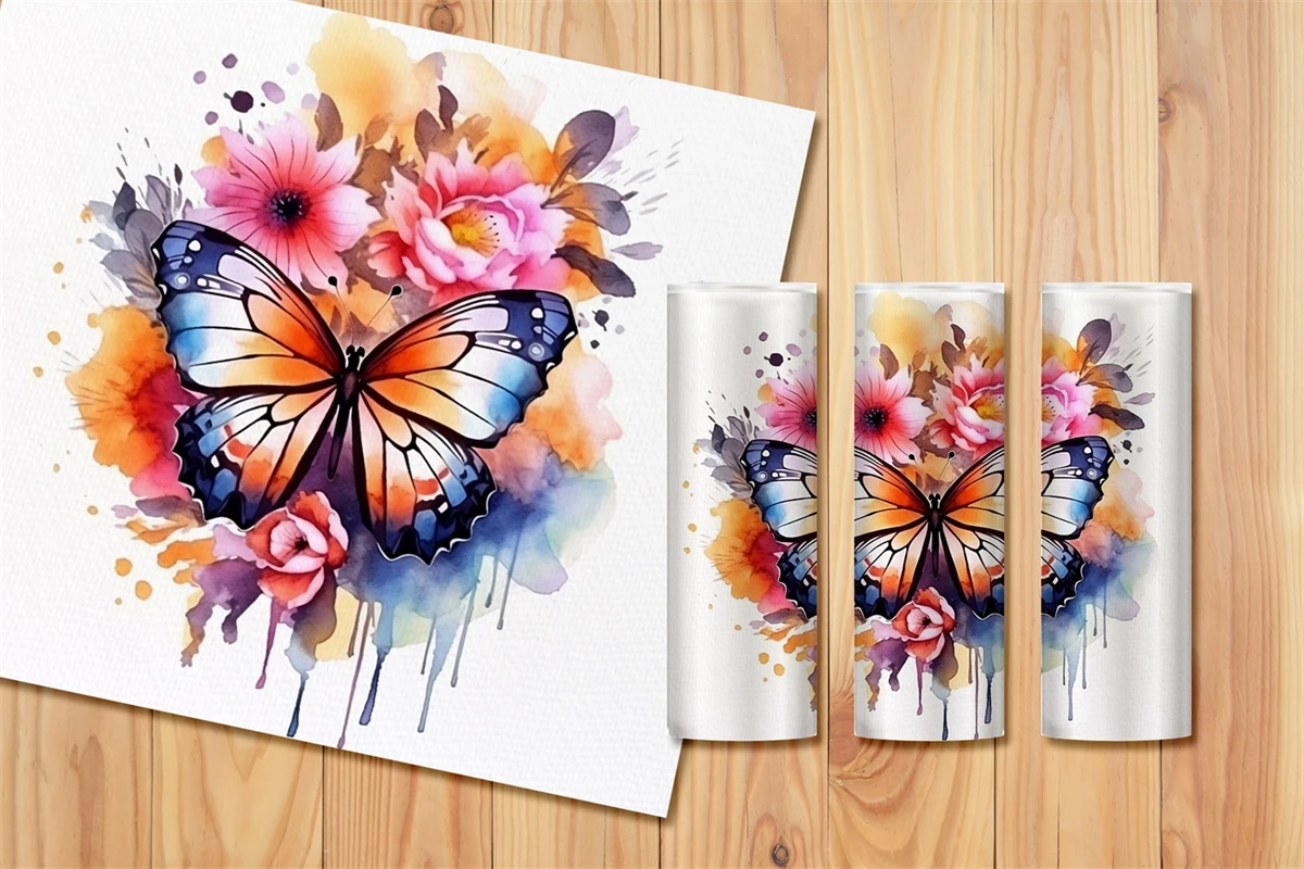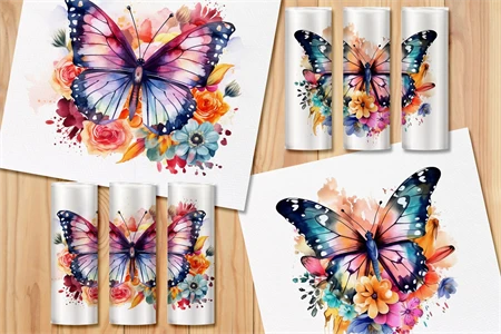 10 designs of gorgeous tumbler wrap sublimation with watercolor butterflies and flowers in different bright colors for straight skinny tumbler wrap. More realistic look with watercolor paper texture decorative design. Perfect for the sublimation of skinny 20oz tumblers.