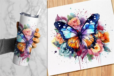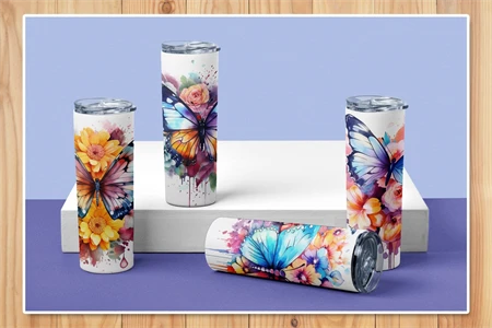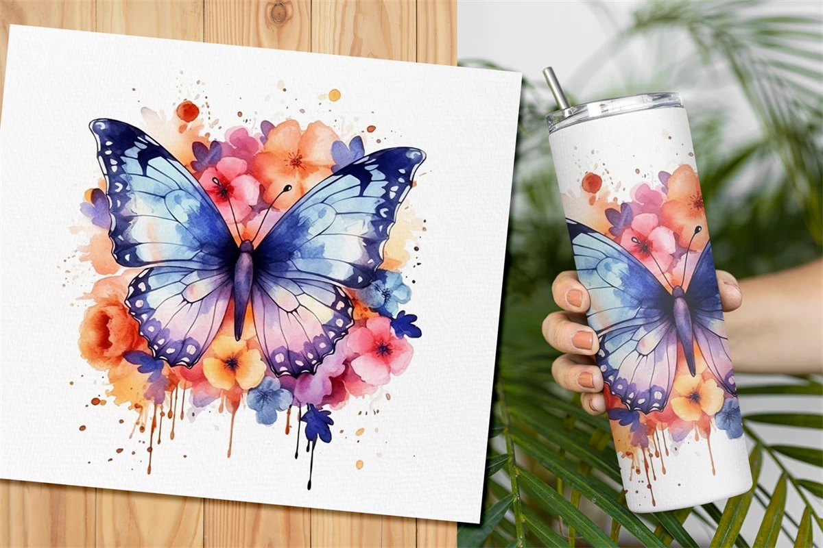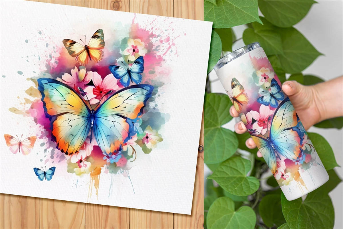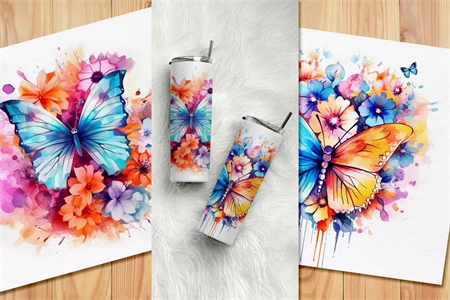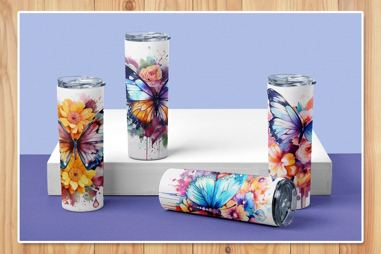 10 designs of gorgeous tumbler wrap sublimation with watercolor butterflies and flowers in different bright colors for straight skinny tumbler wrap. More realistic look with watercolor paper texture decorative design. Perfect for the sublimation of skinny 20oz tumblers.