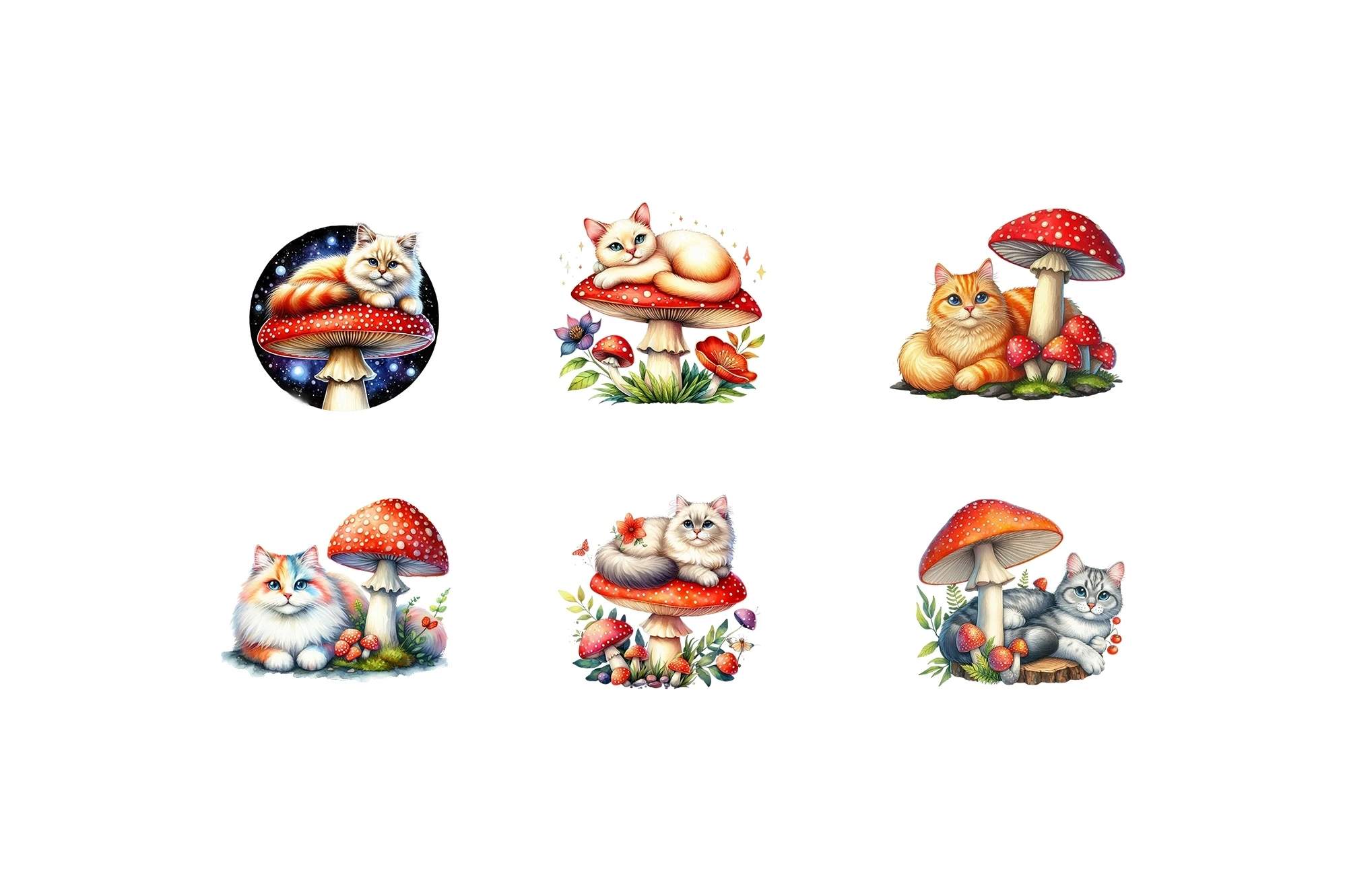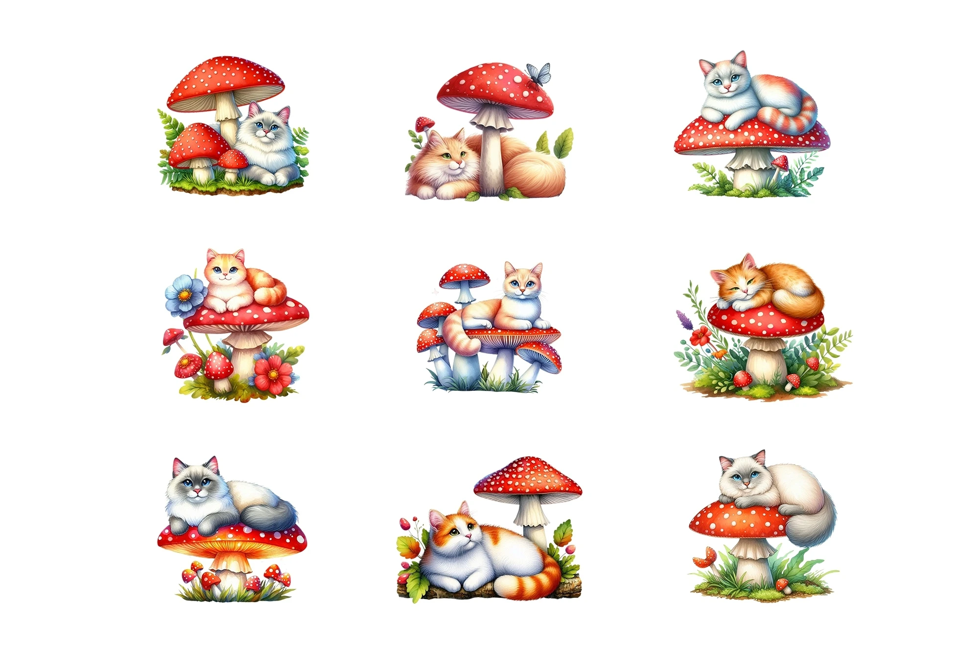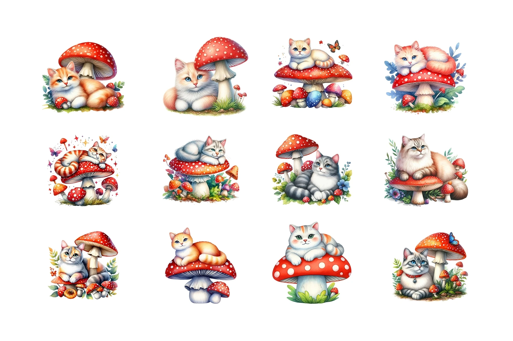 Watercolor Cat Lying on a Toadstool Clipart Sublimation PNG (AI-generated).