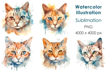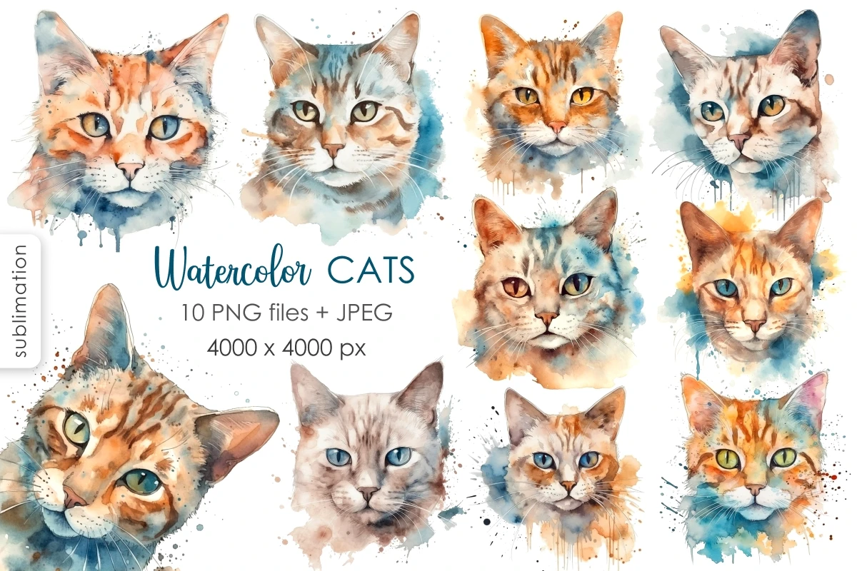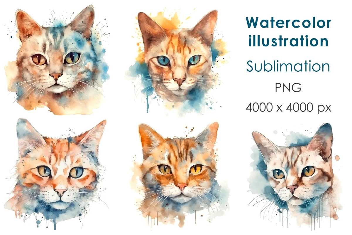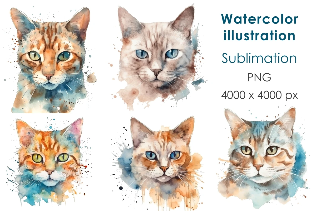 Collection of watercolor cats. Cute hand draw illustrations with cats for creating prints, sublimations, stickers, covers, avatars. Use these images to print on t-shirts, mugs, bags, paintings, posters.