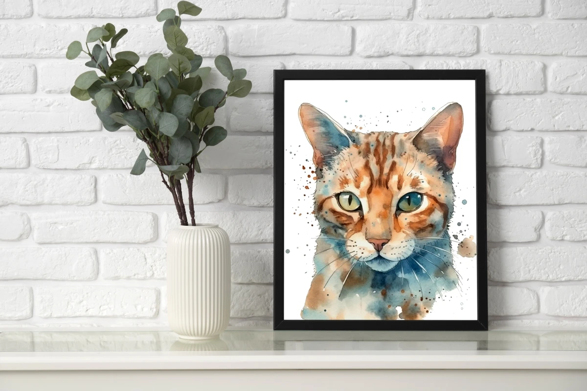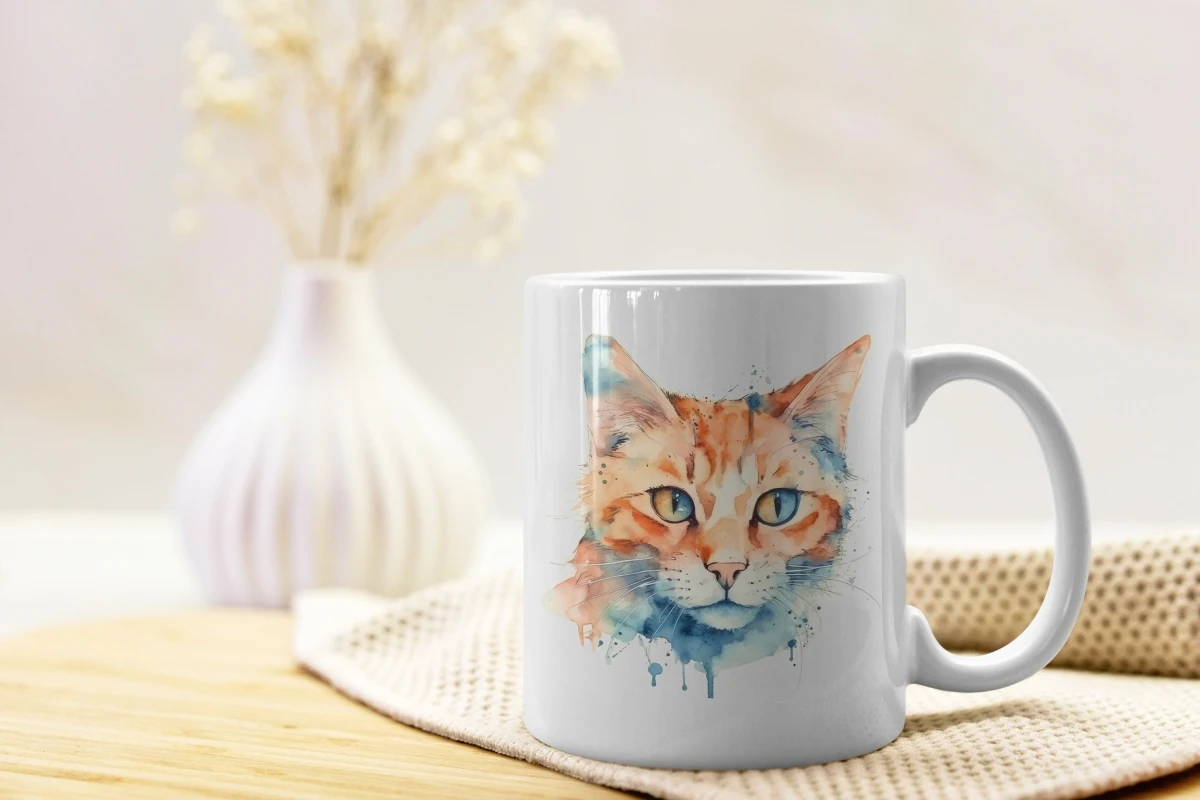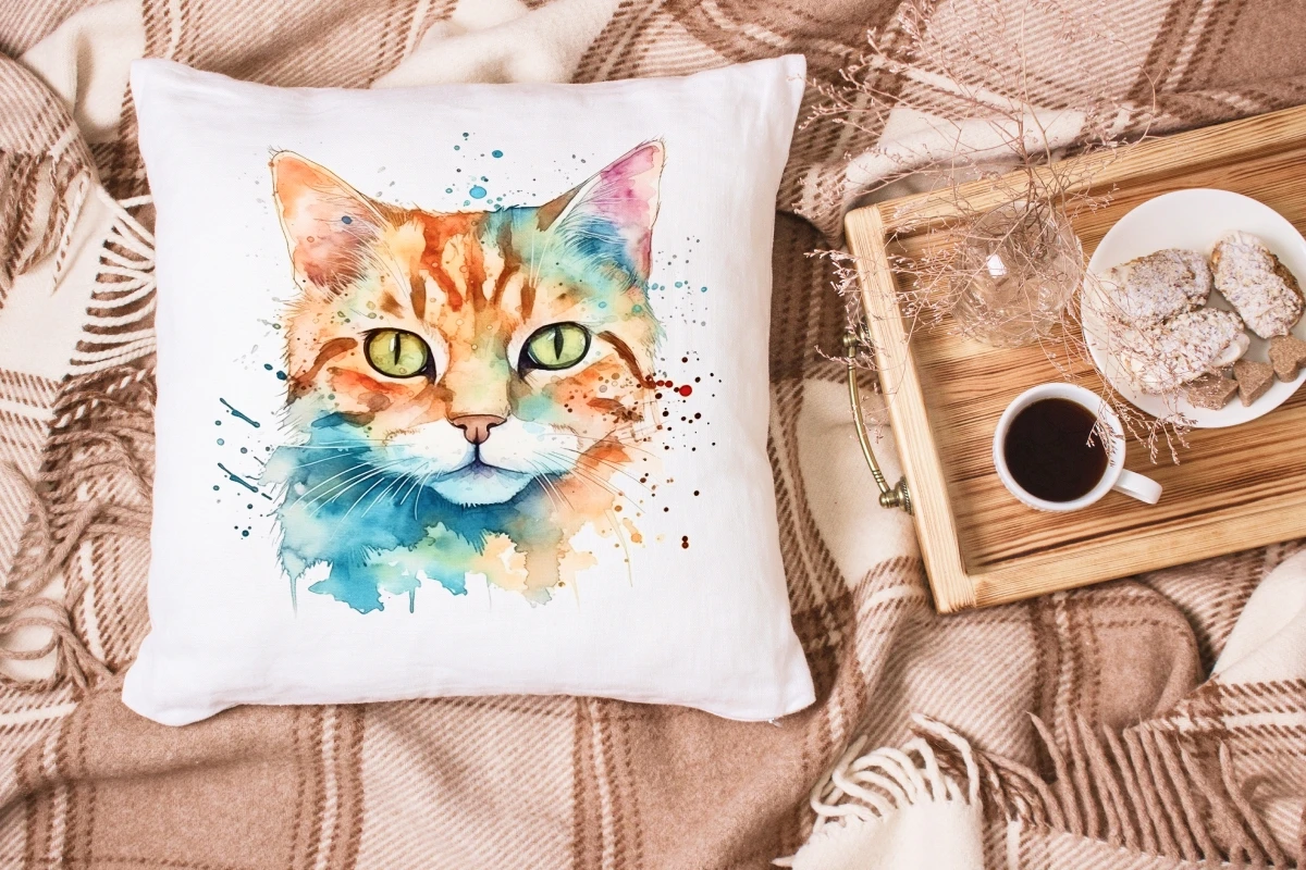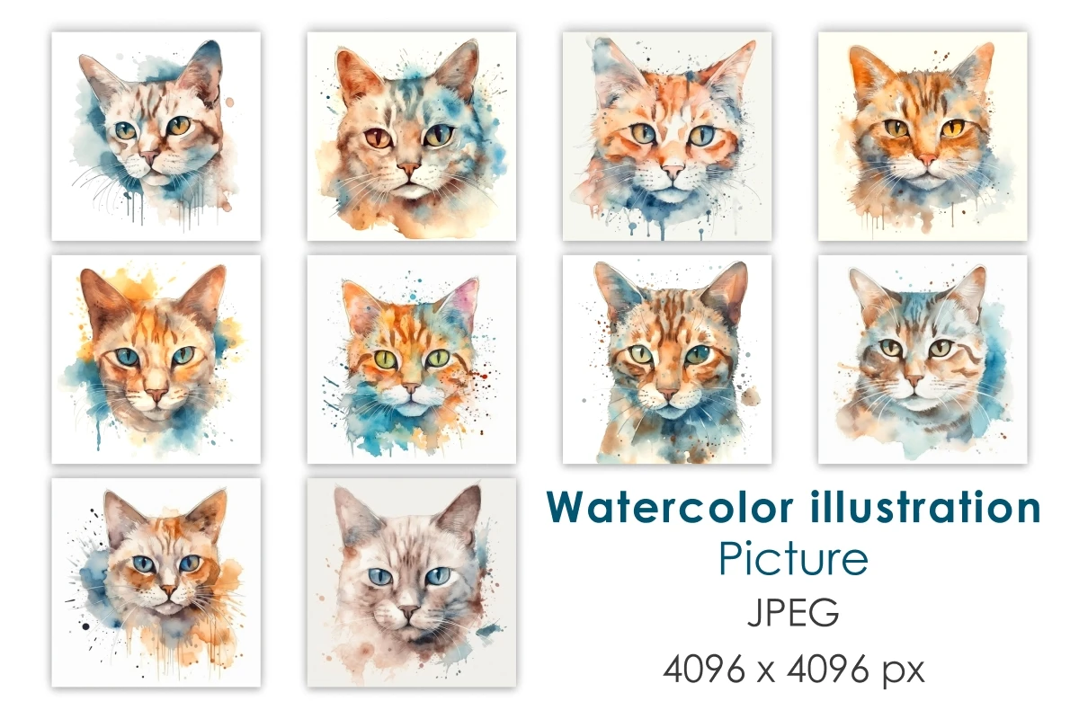 Collection of watercolor cats. Cute hand draw illustrations with cats for creating prints, sublimations, stickers, covers, avatars. Use these images to print on t-shirts, mugs, bags, paintings, posters.