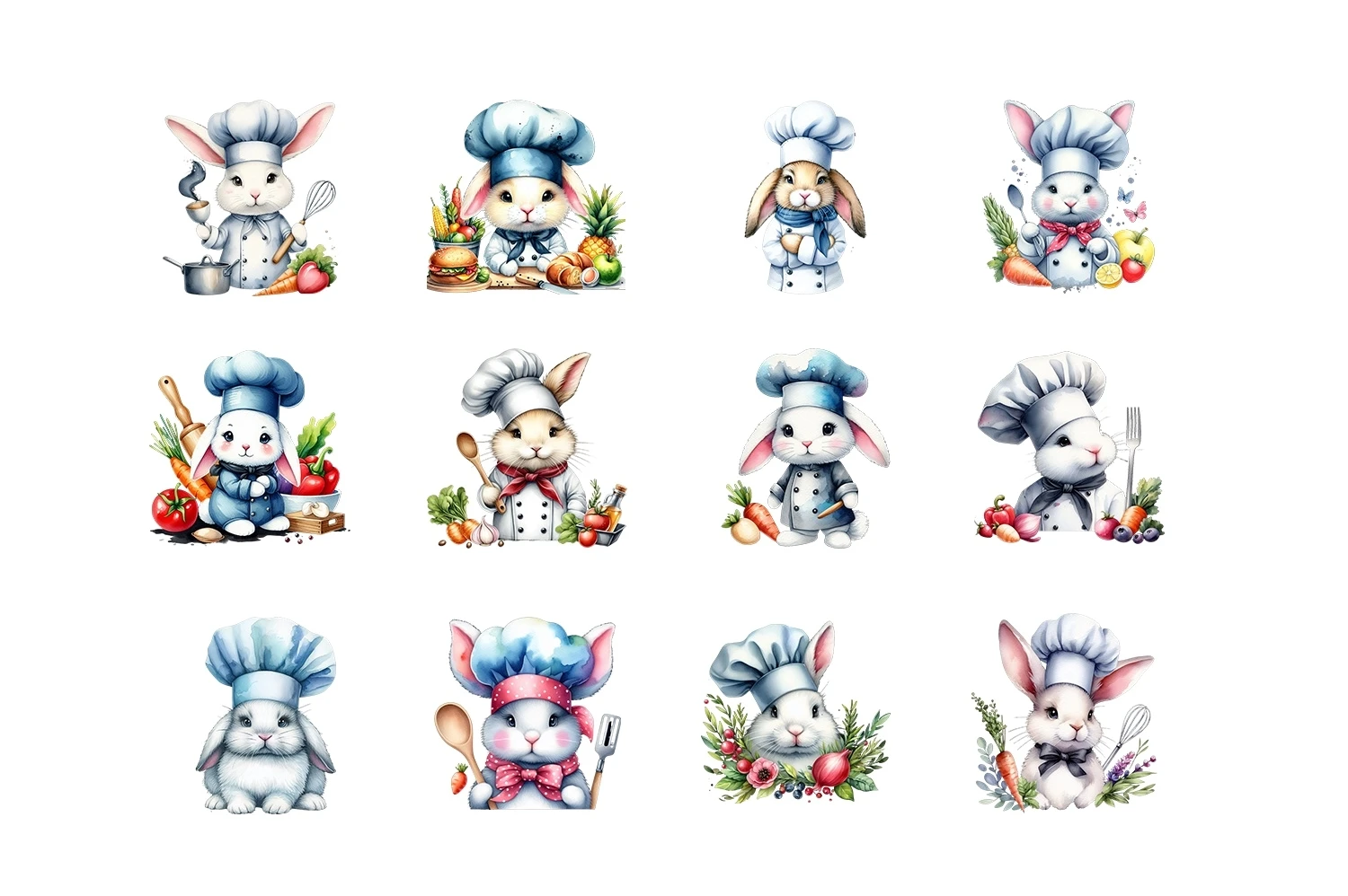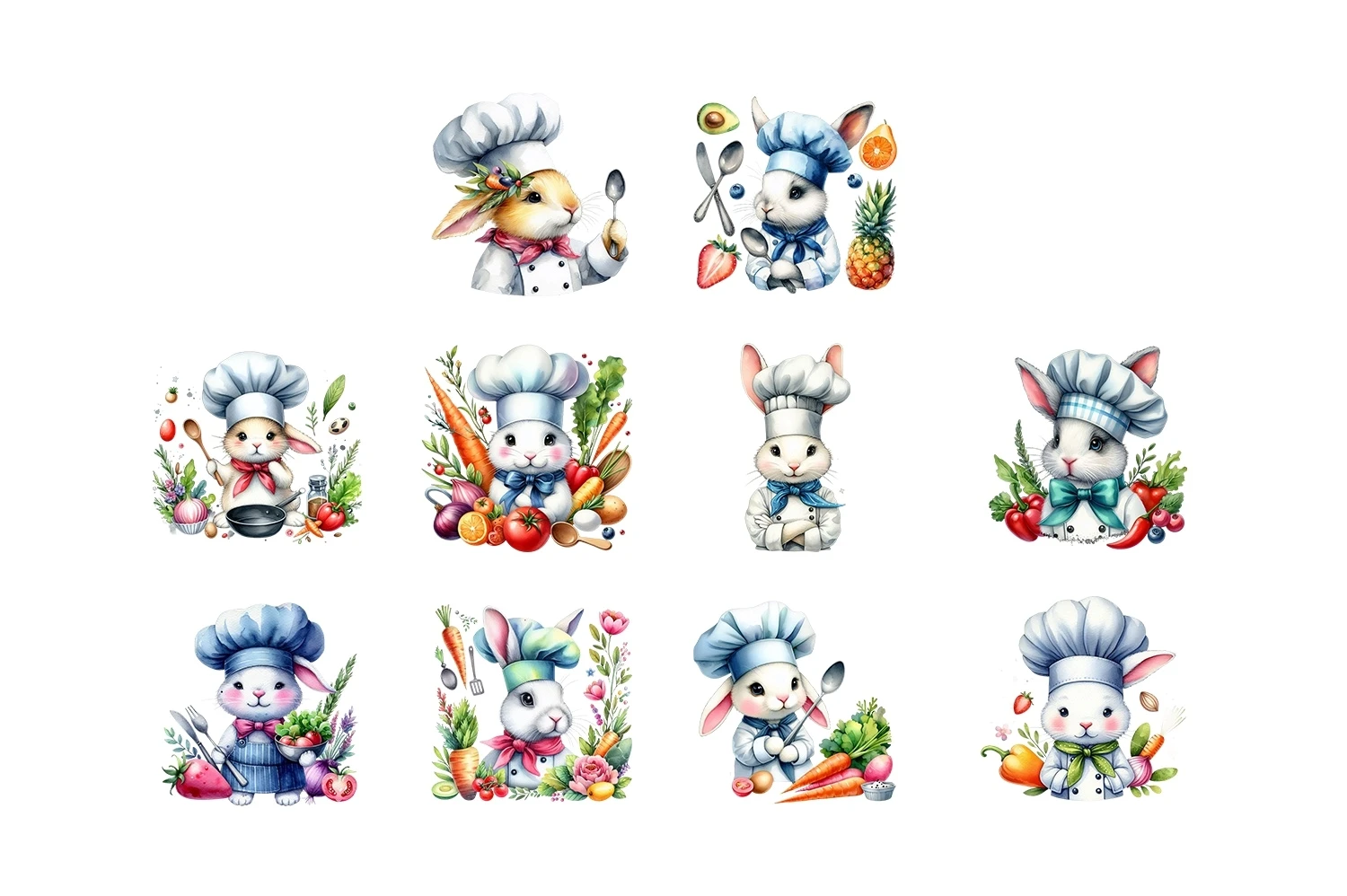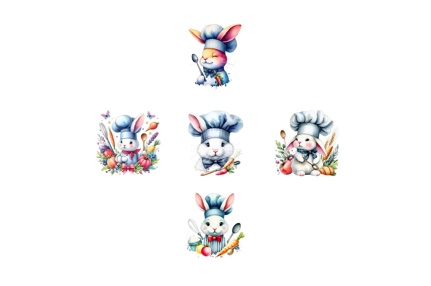 Watercolor Chef Bunny Clipart Bundle PNG (AI-generated).