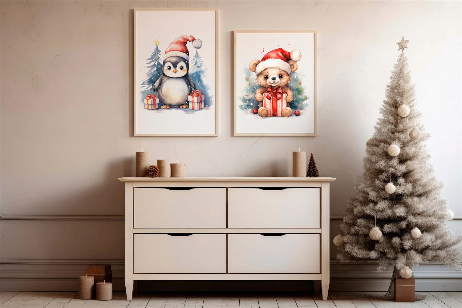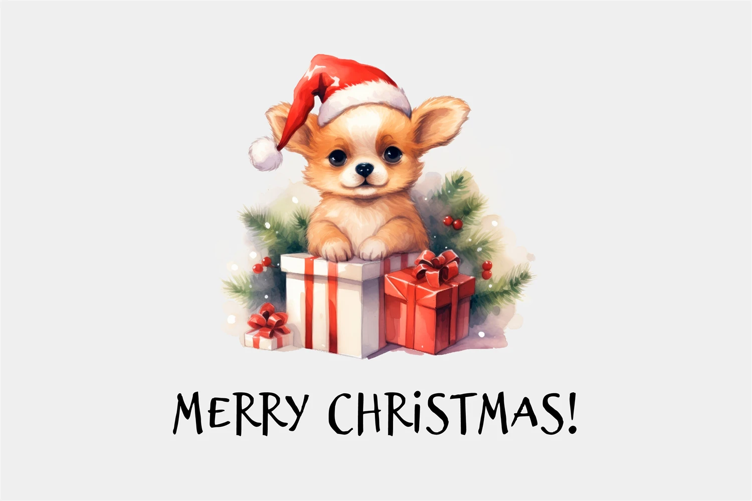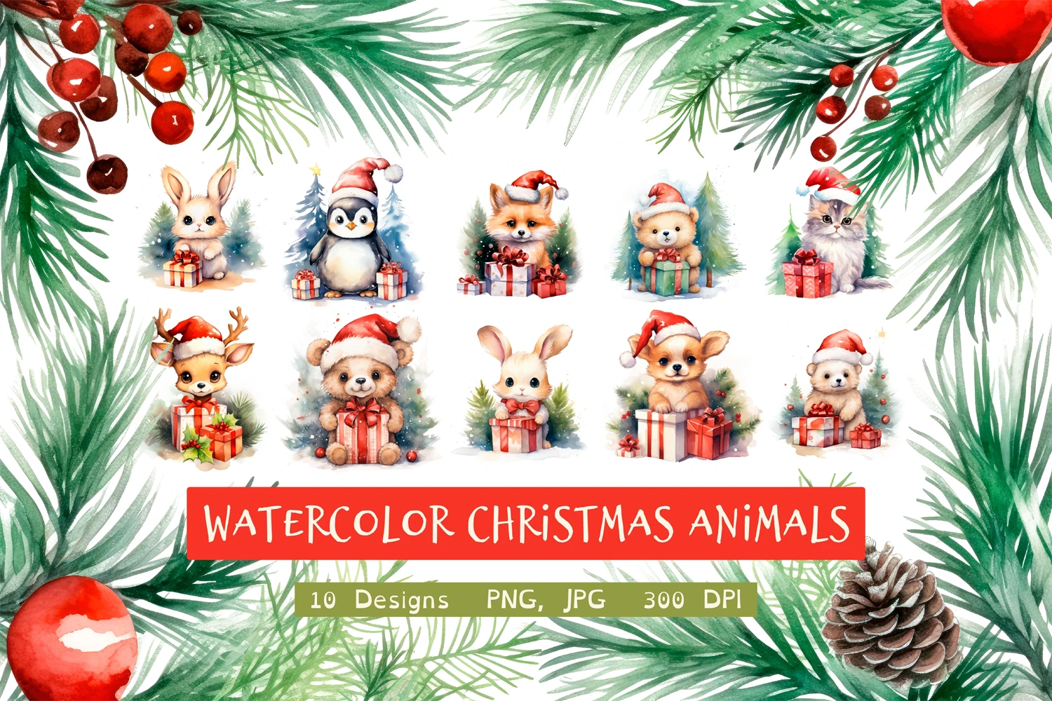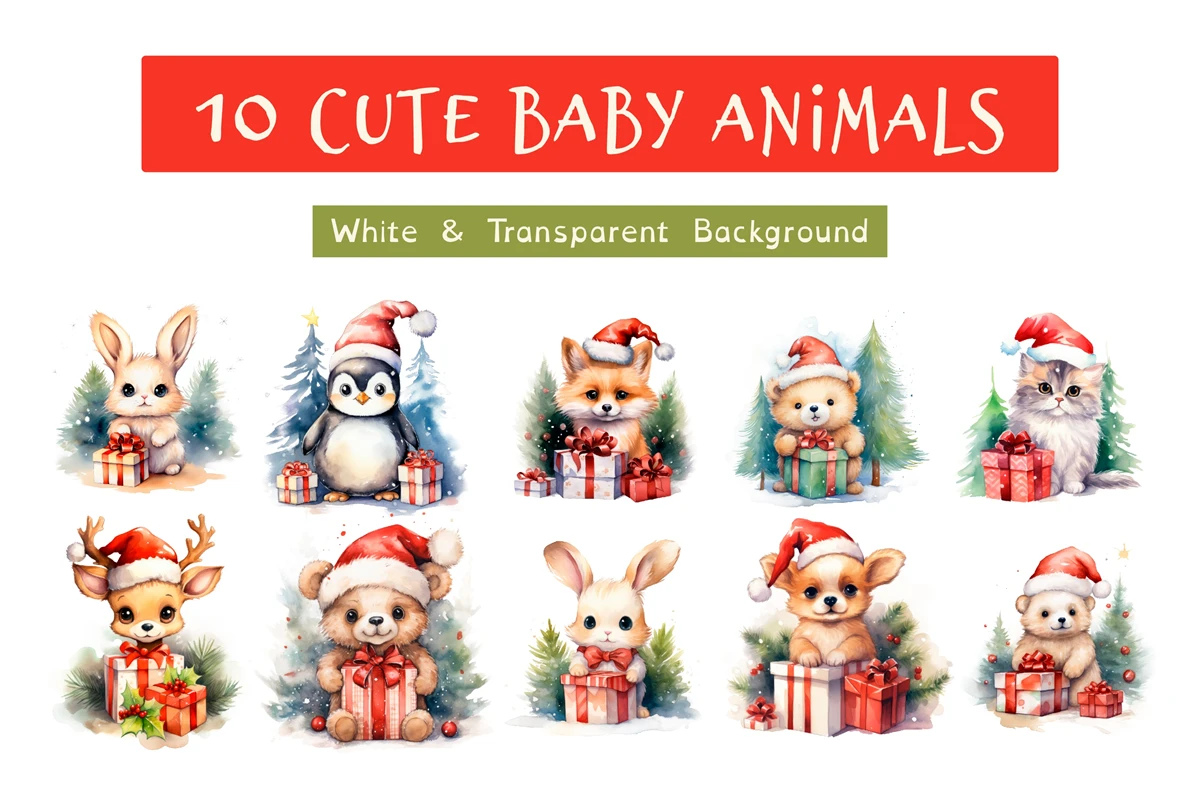 Cute 10 watercolor baby animals in Santa Claus hat with gift boxes and Christmas trees. Dog, bear, cat, penguin, reindeer, bunny, rabbit, fox. Perfect for Christmas cards, posters, sublimation, mug, tote bag, home design, kids, stickers, t-shirt design, etc.
