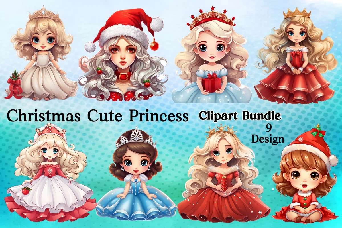 Watercolor Christmas Cute Princess Clipart PNG Bundle