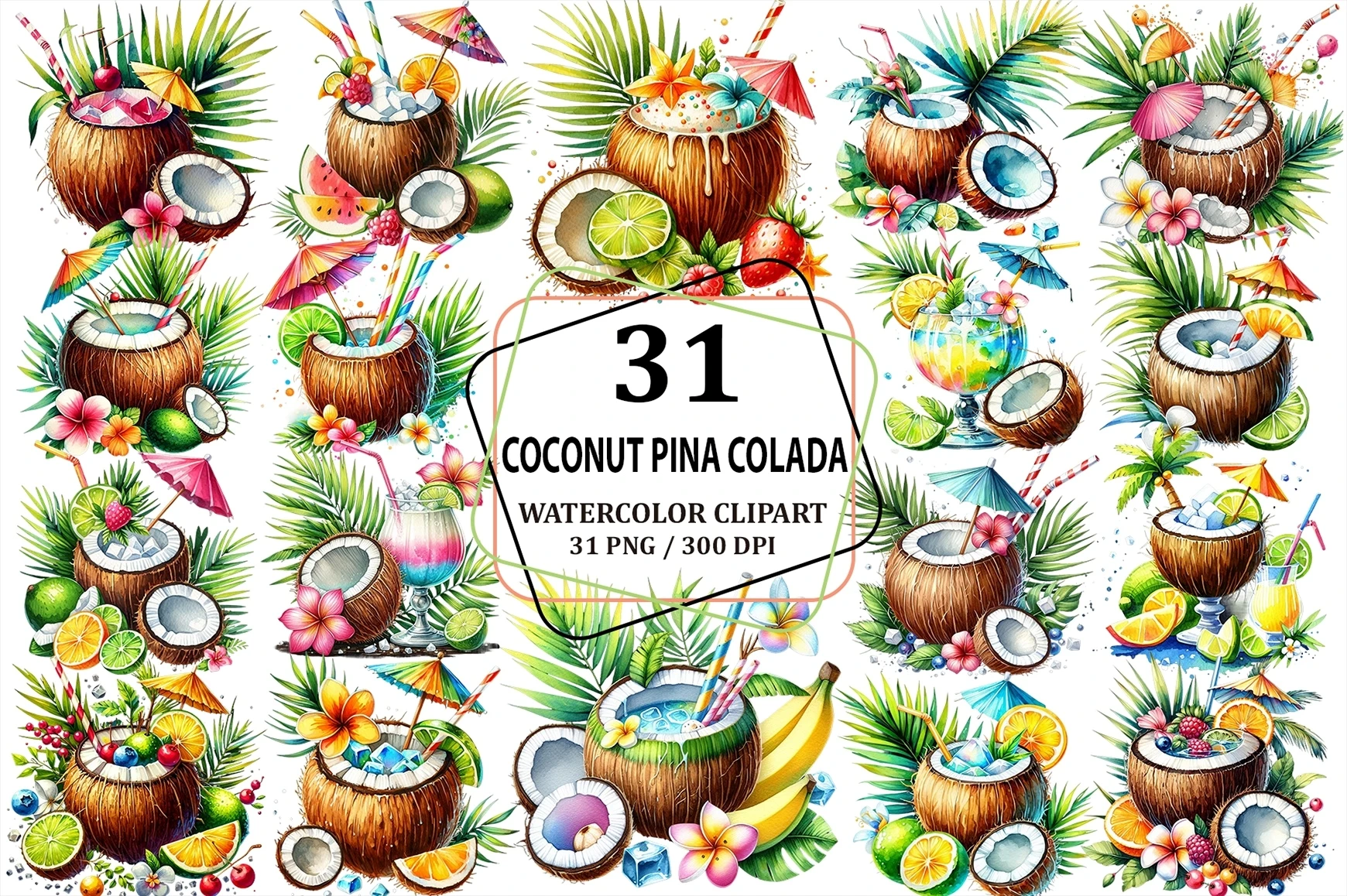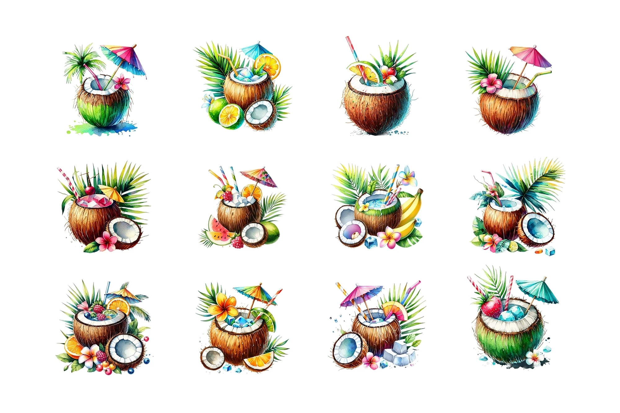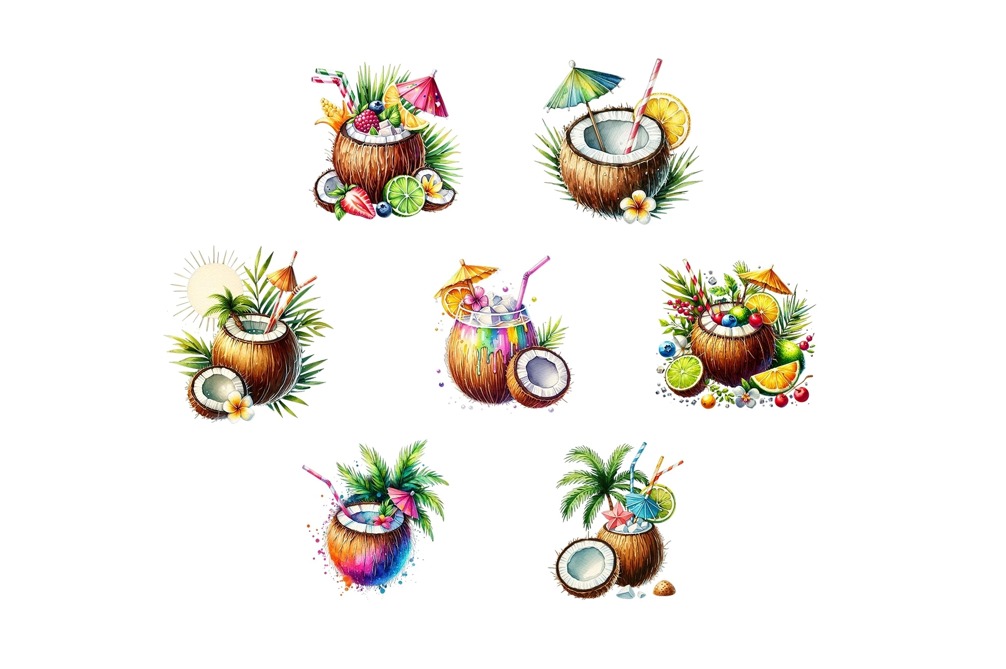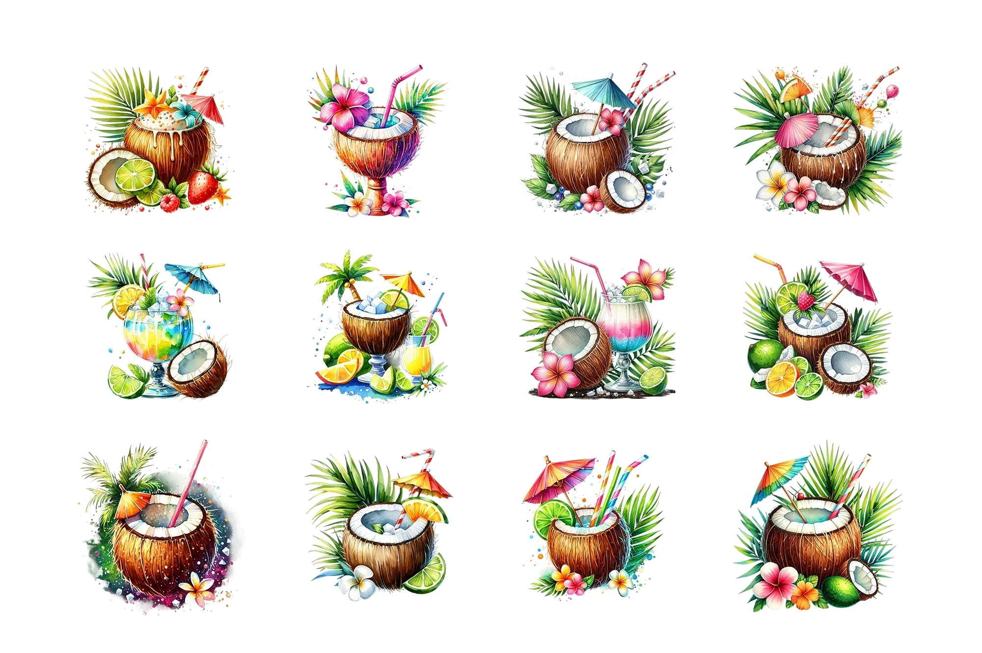 Watercolor Coconut Pina Colada Clipart Sublimation PNG (AI-generated).