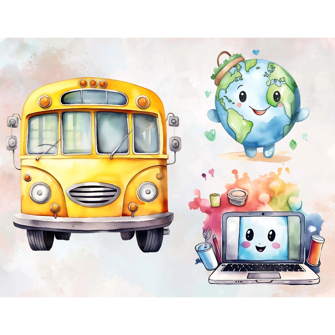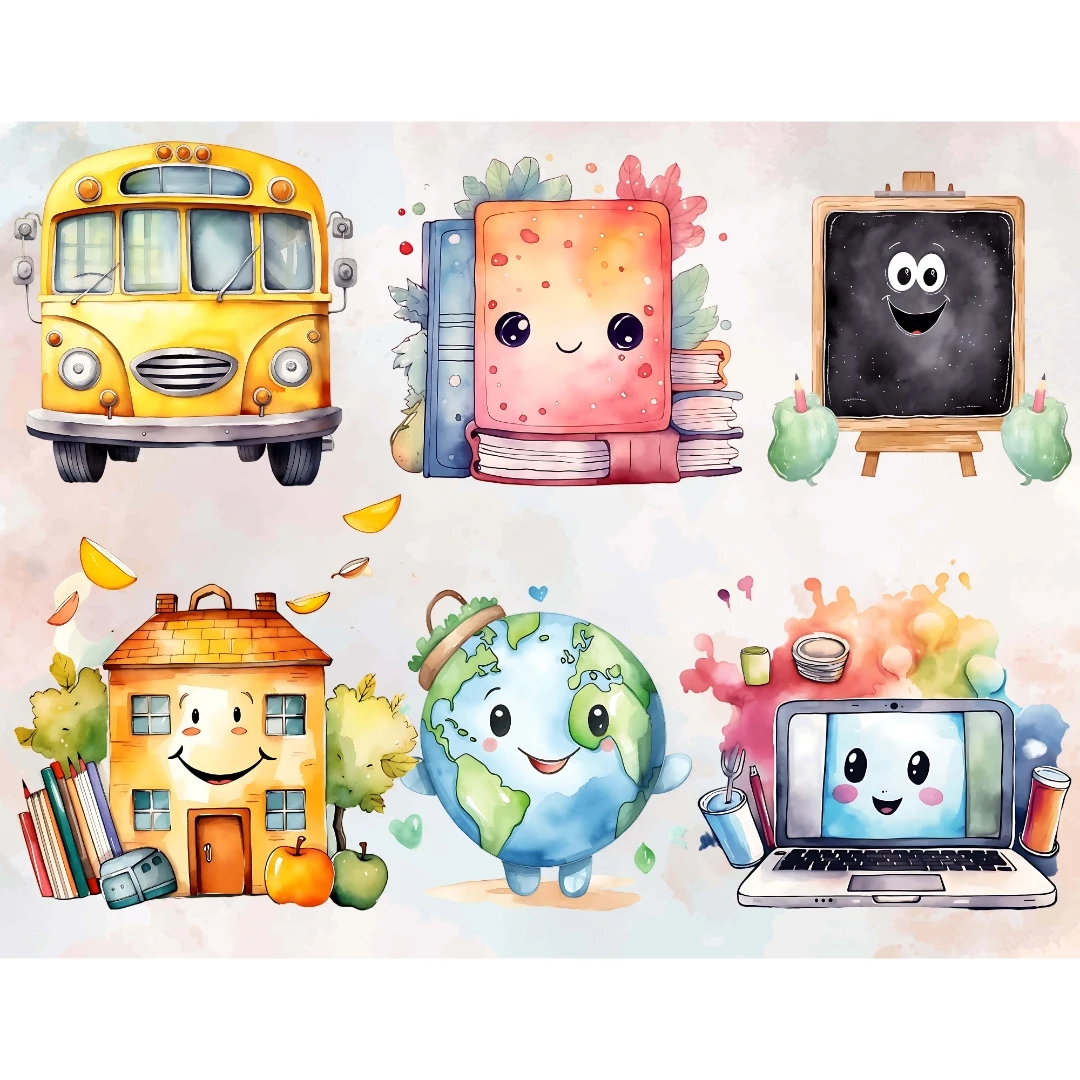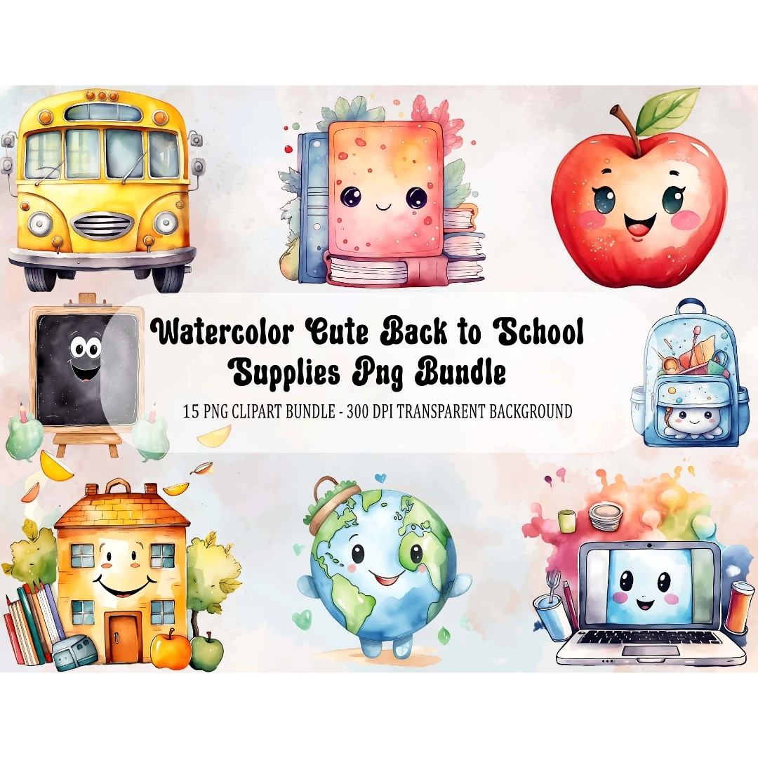 Watercolor Cute Back to School Supplies Clipart Bundle of 15