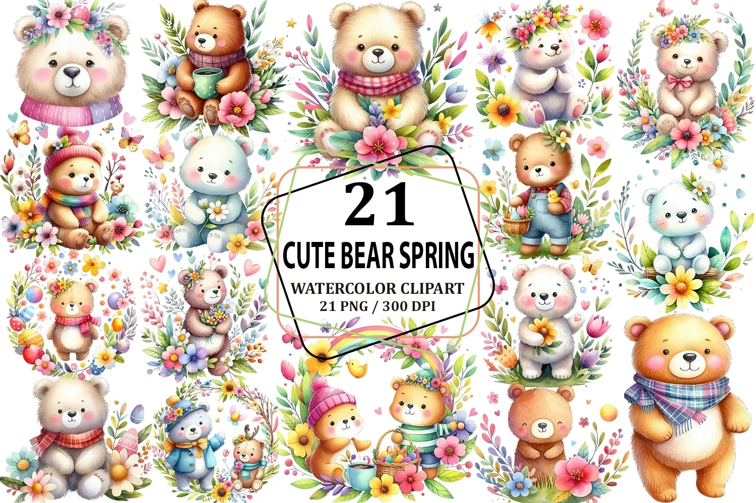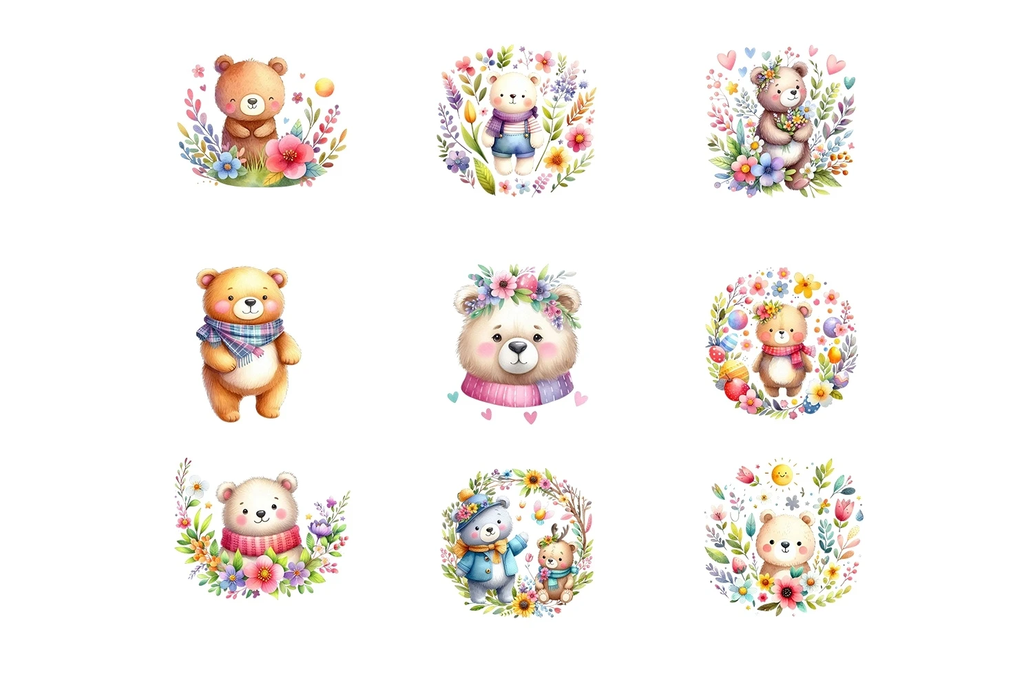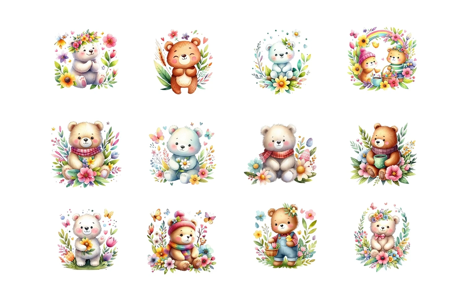 Watercolor Cute Bear Spring Clipart Sublimation PNG (AI-generated).