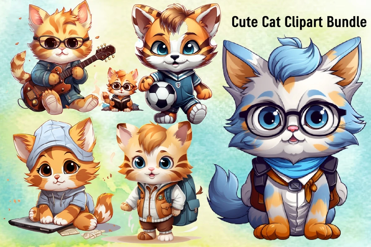 Watercolor Watercolor Cute Cat Clipart PNG Bundle