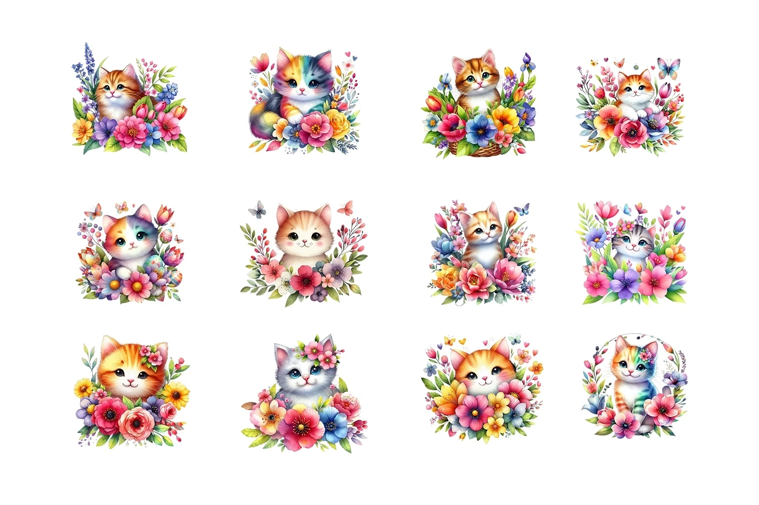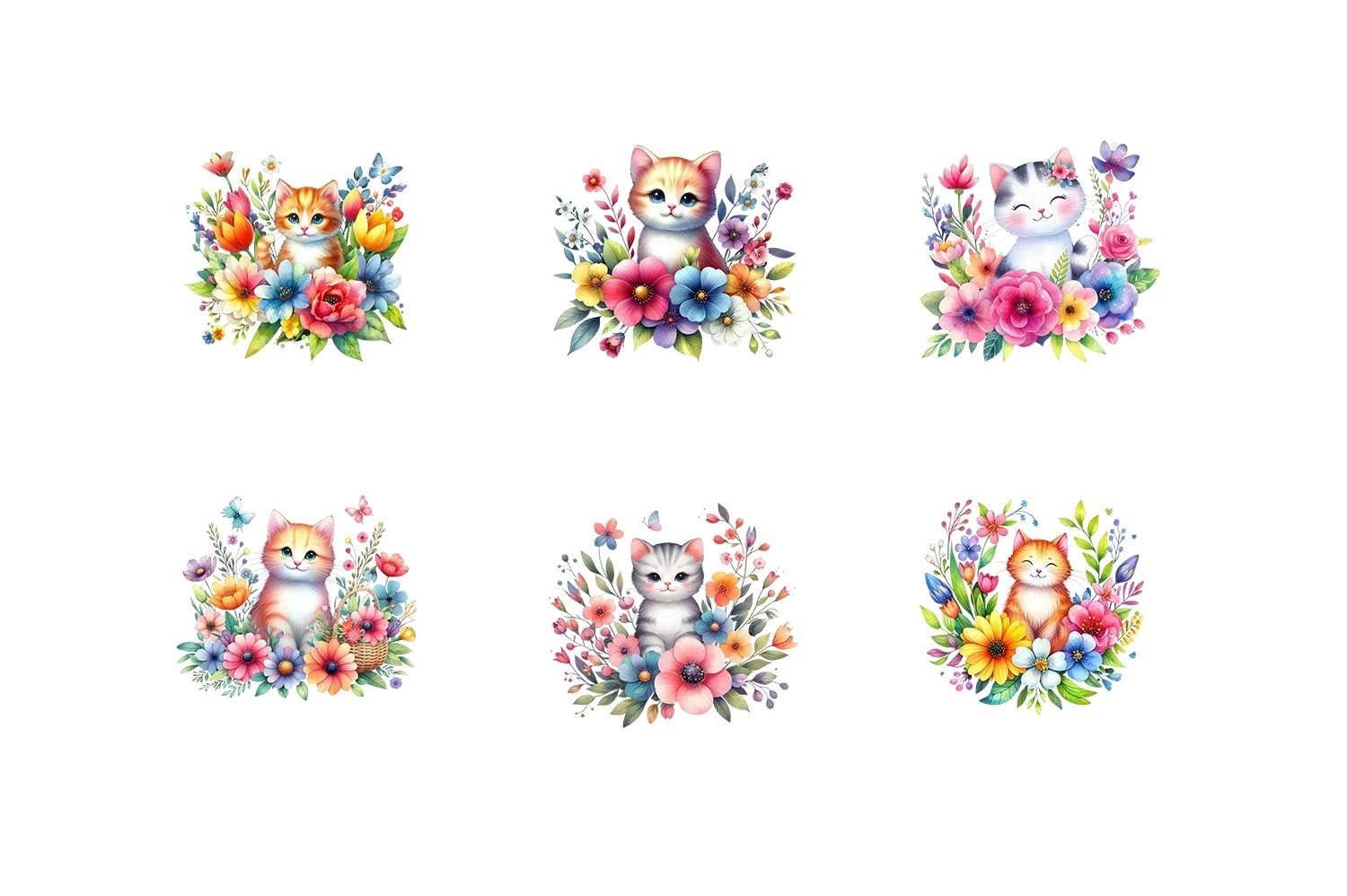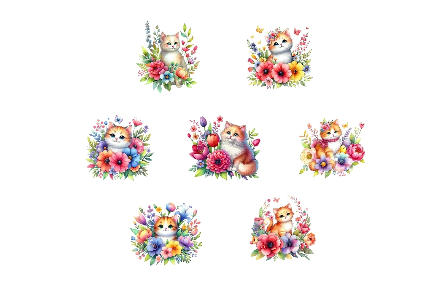 Watercolor Cute Cat Spring Flowers Clipart PNG (AI-generated).
