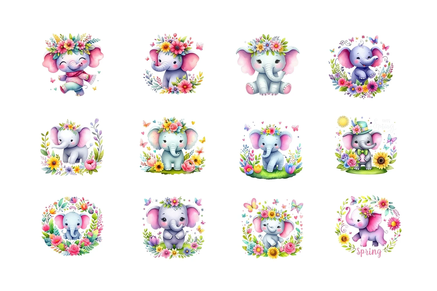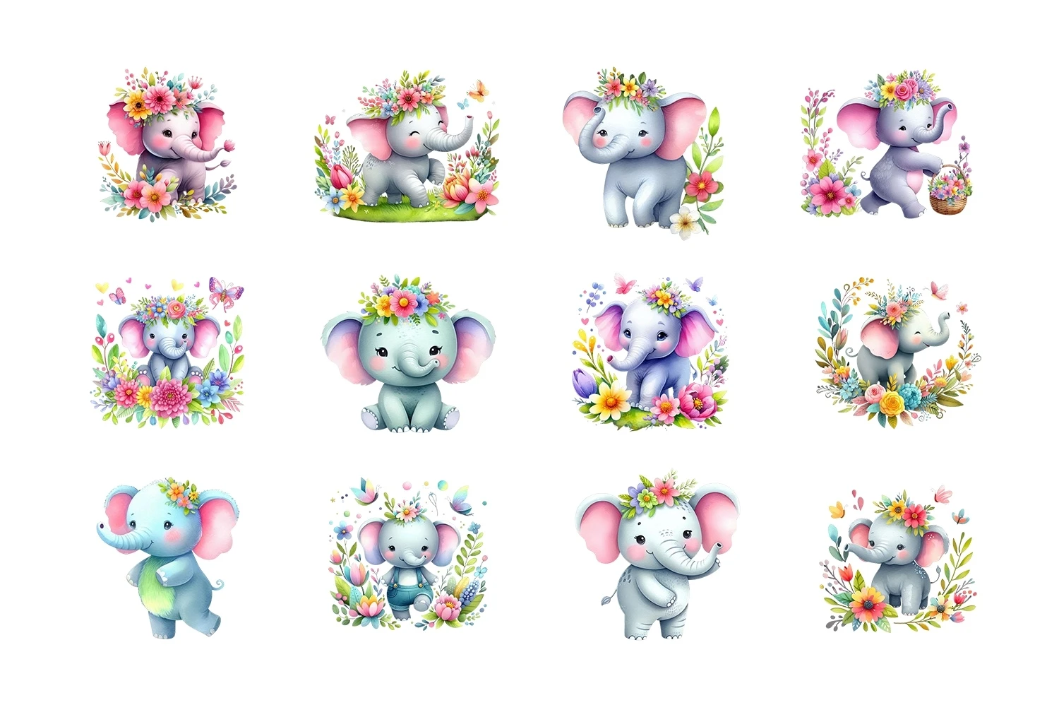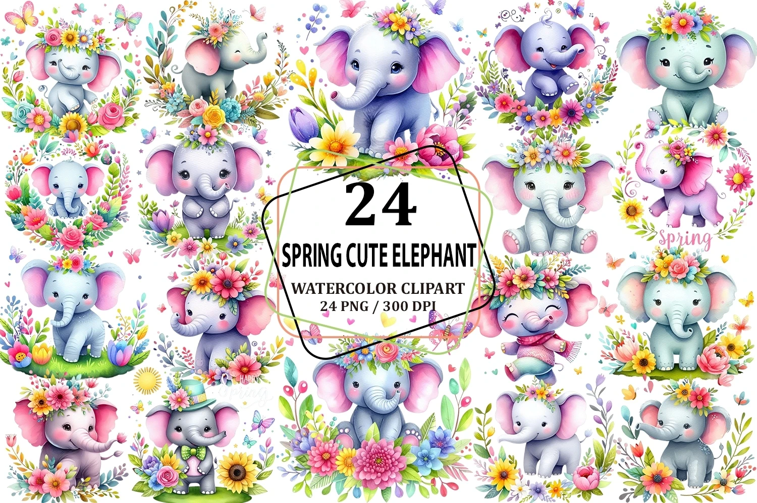 Watercolor Cute Elephant Spring Clipart Sublimation PNG (AI-generated).