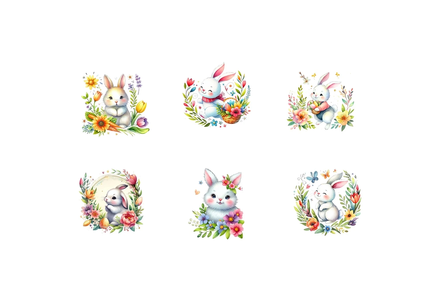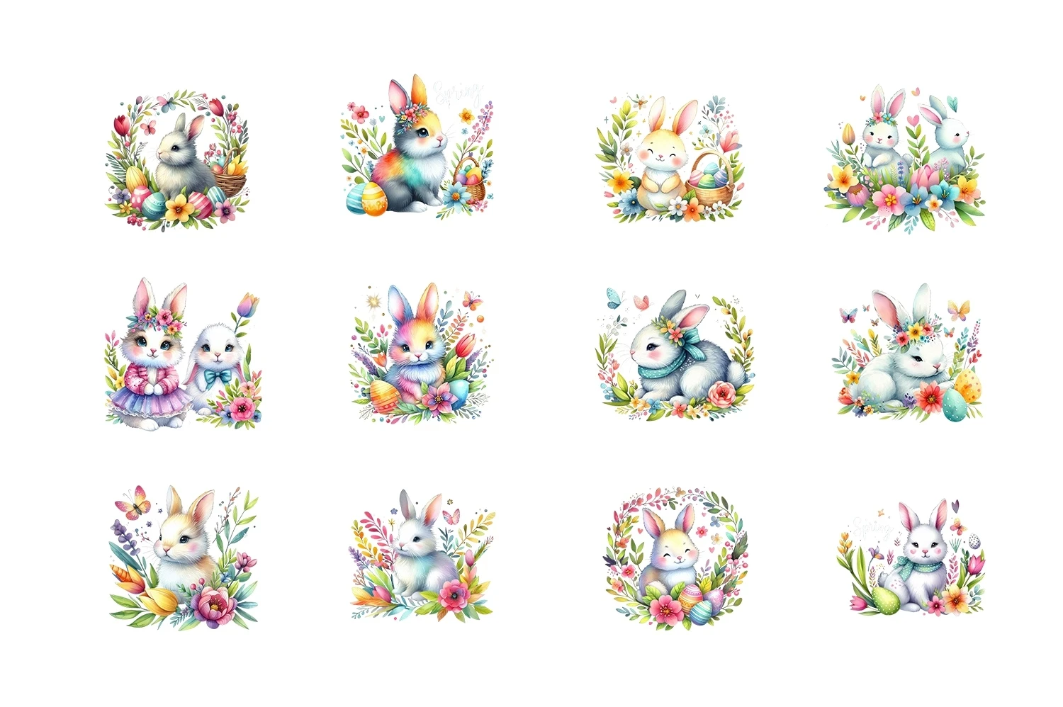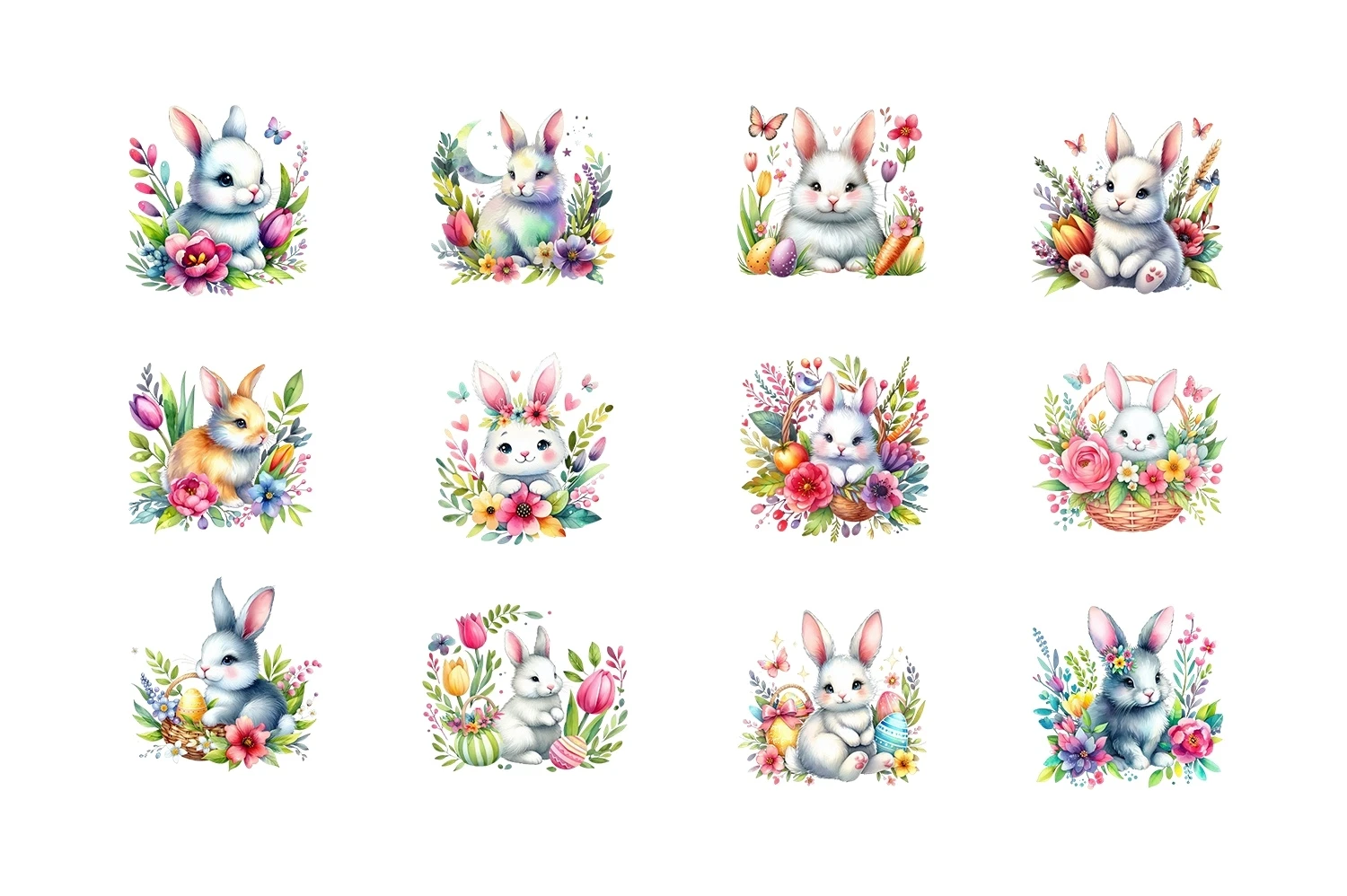Watercolor Cute Spring Bunnies Clipart Sublimation PNG (AI-generated).