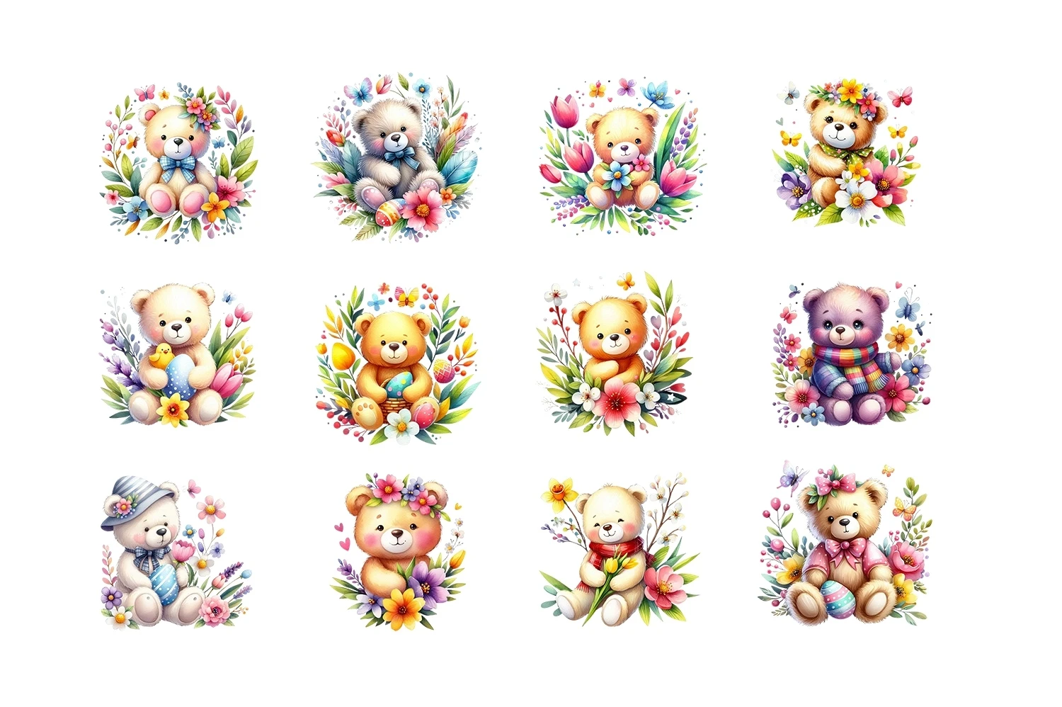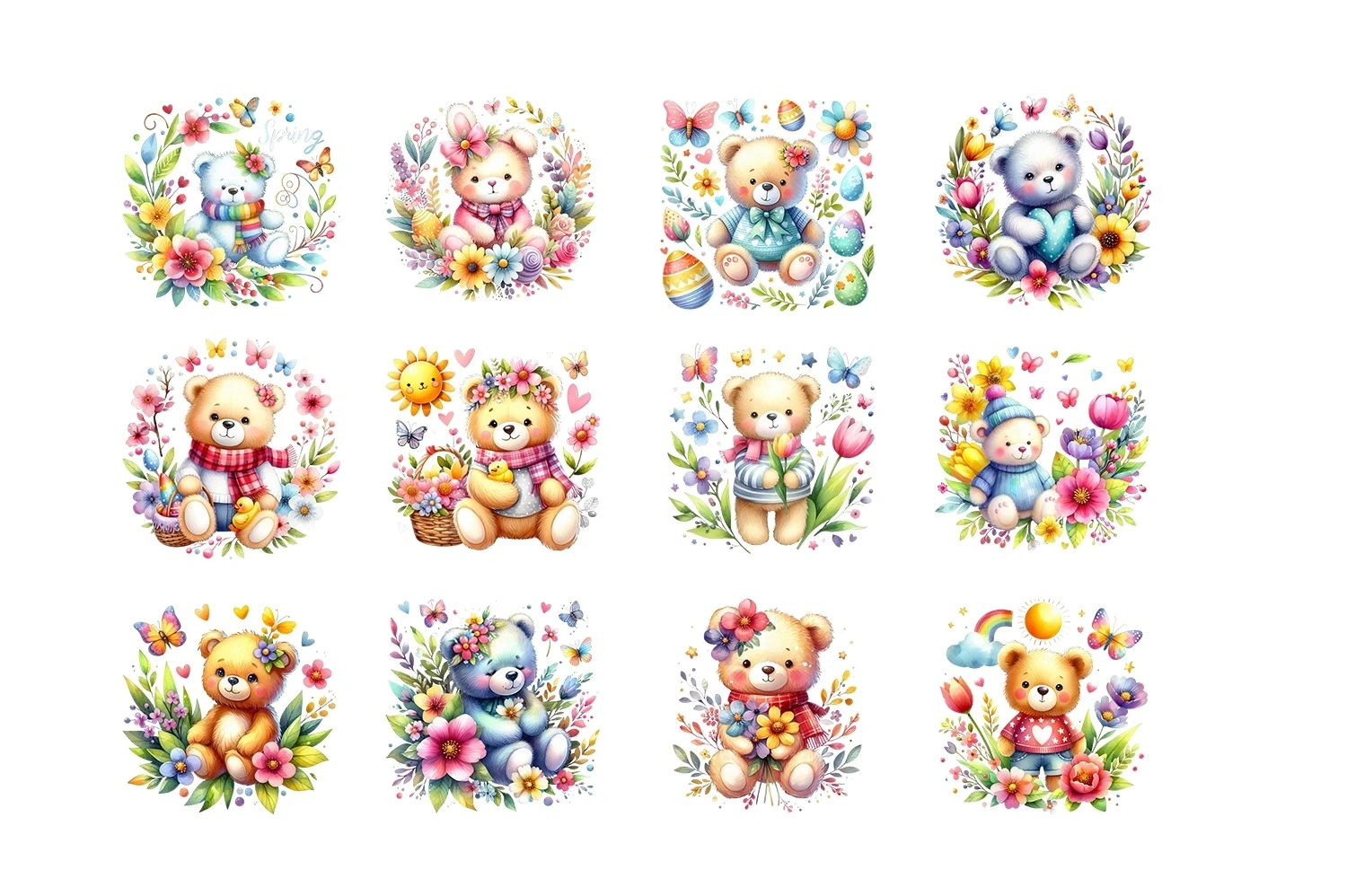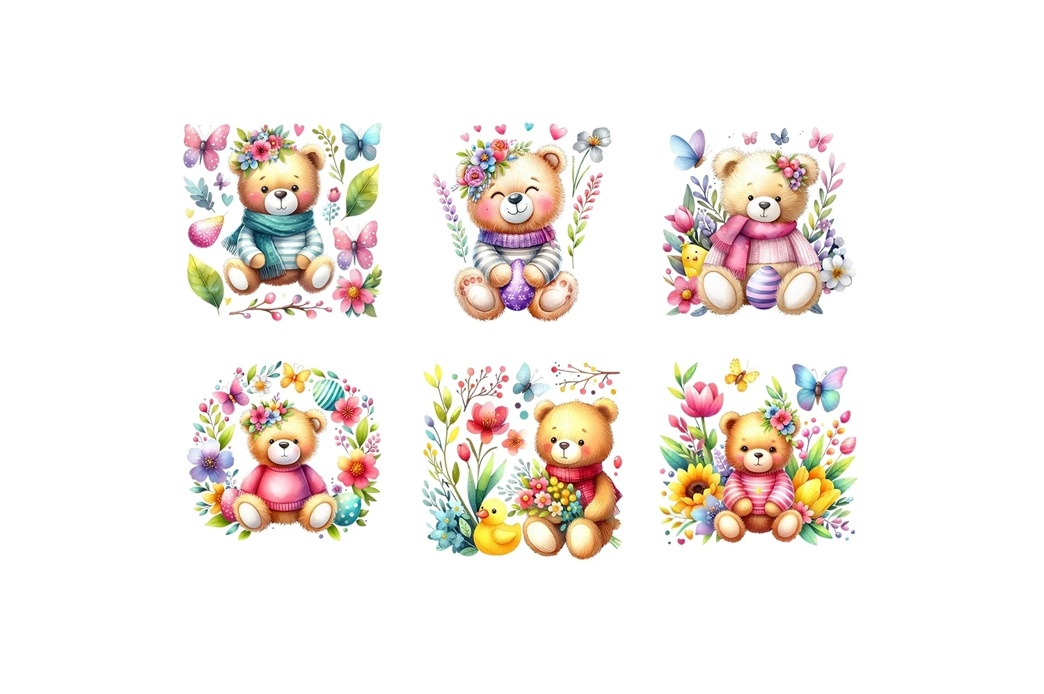 Watercolor Cute Teddy Bear Spring Clipart PNG Sublimation (AI-generated).