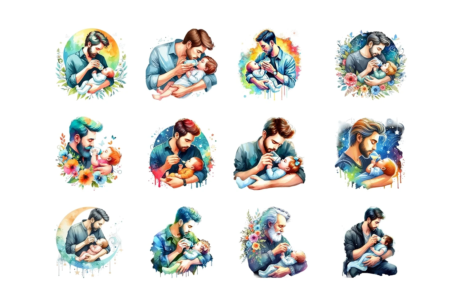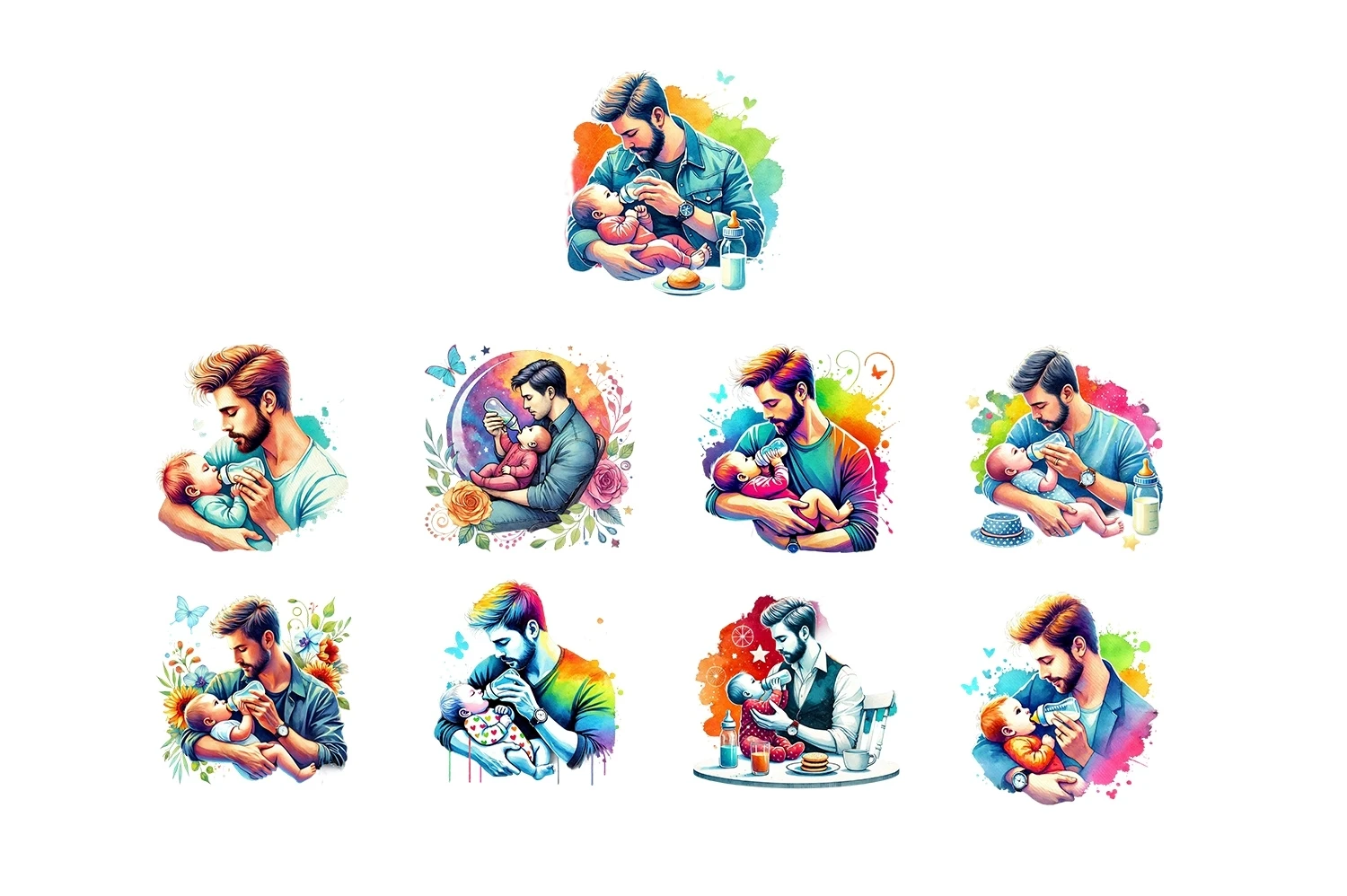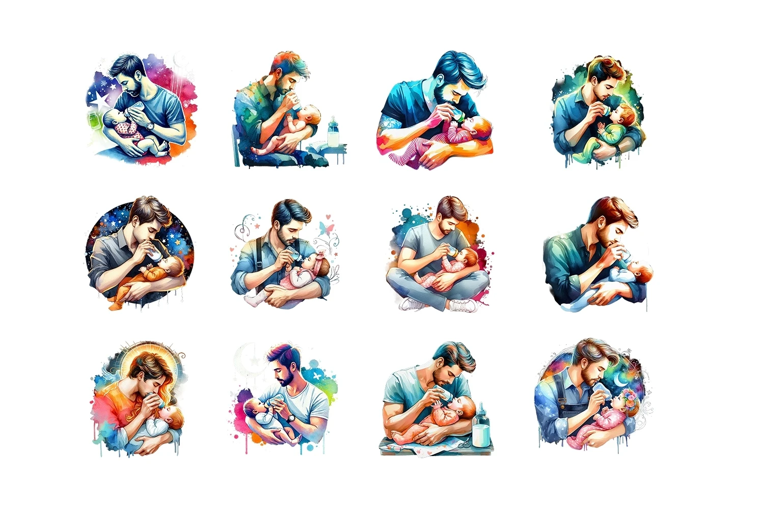 Watercolor Dad Baby Feeding Fathers Day Clipart Sublimation (AI-generated).