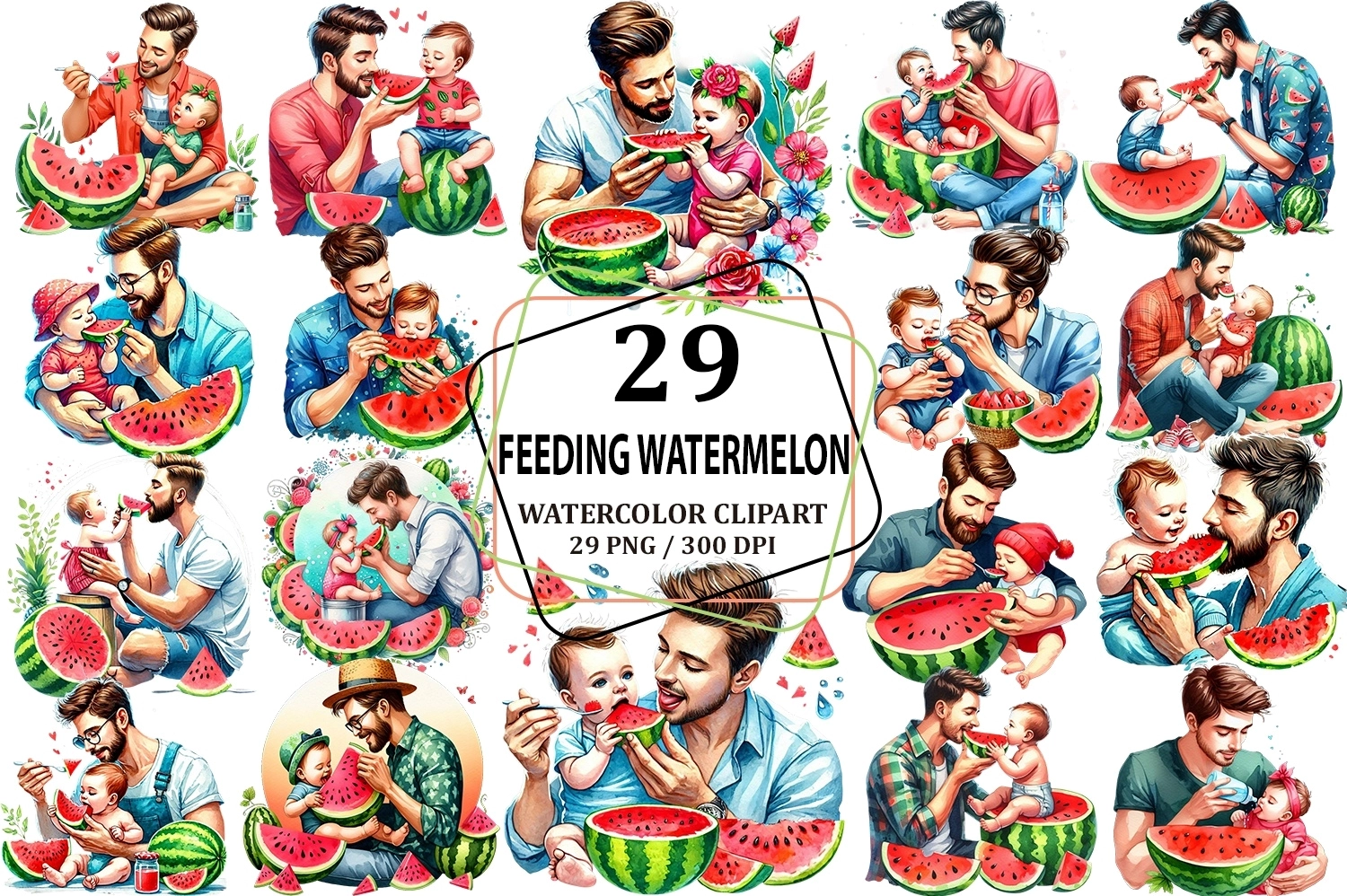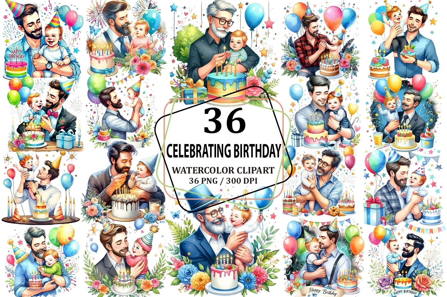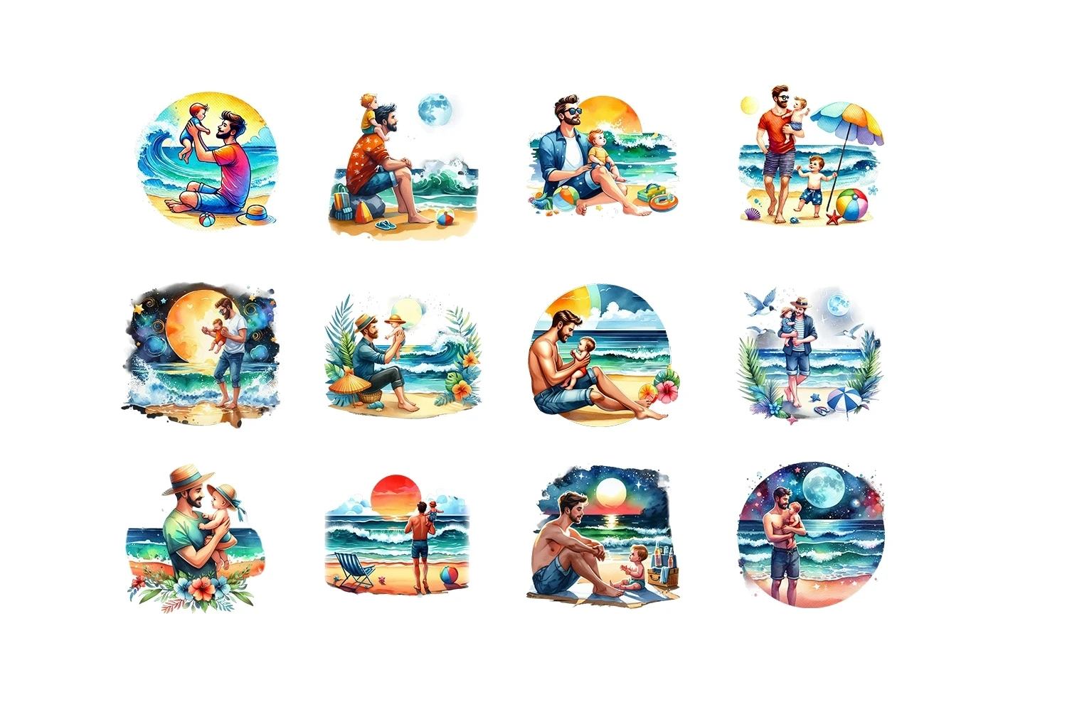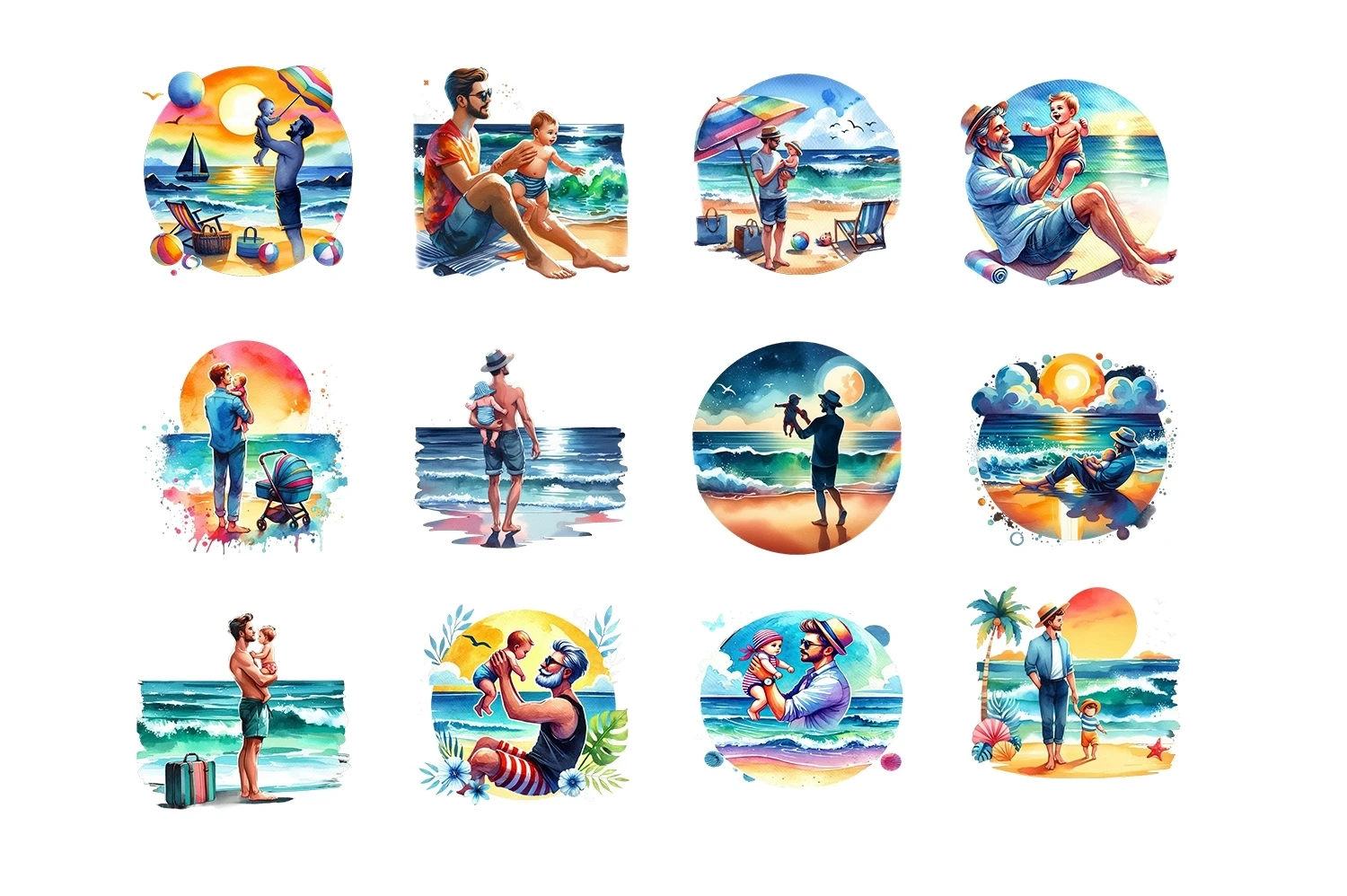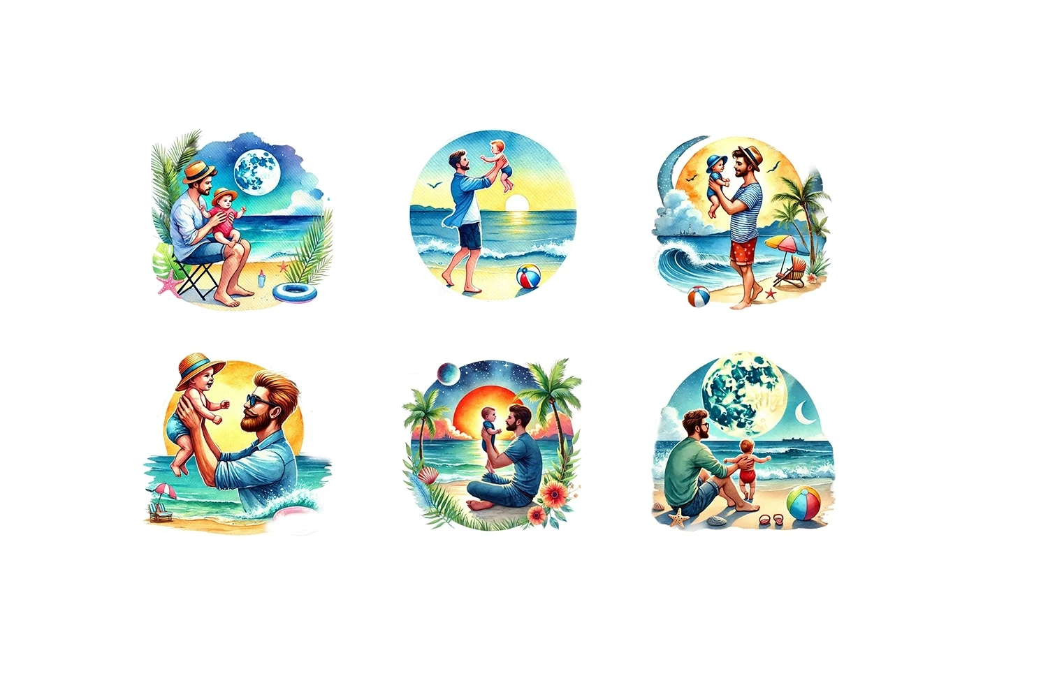 Watercolor Dad & Baby on the Beach Fathers Day Clipart PNG (AI-generated).
