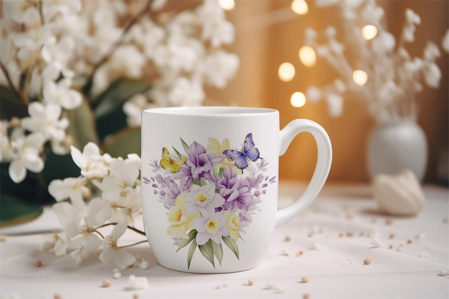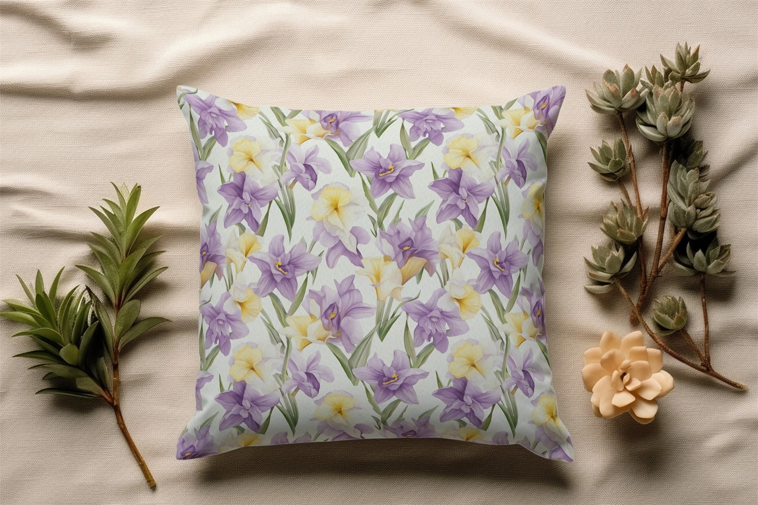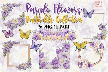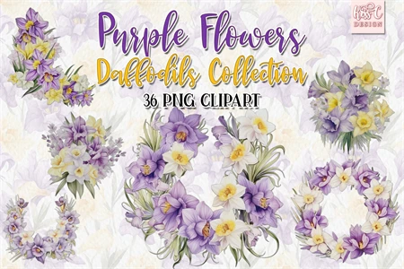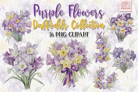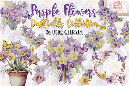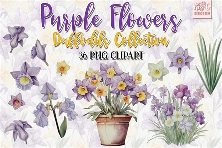Watercolor Daffodils Purple Flowers Illustration Clipart.