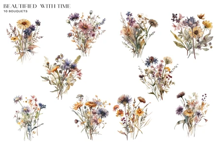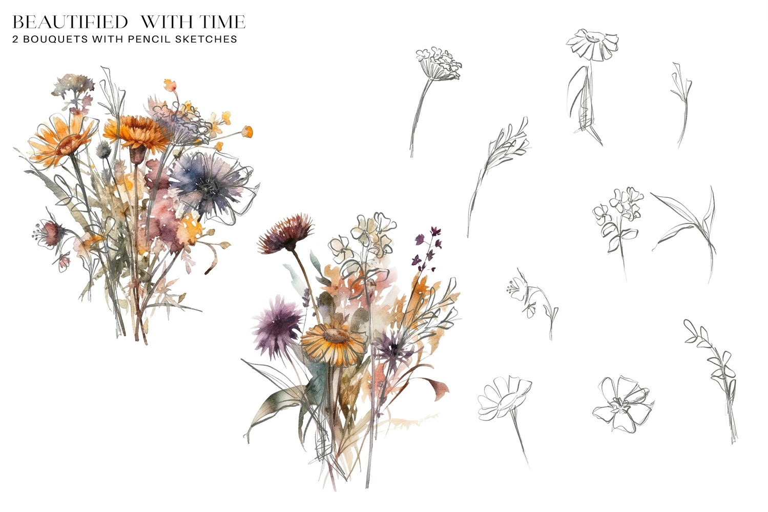 Elevate your wedding stationery and decorations with our watercolor dried wildflowers digital clipart collection. These beautifully crafted dried wild flowers and minimalist flowers illustrations are perfect for adding a rustic yet elegant touch to your special day. Incorporate the charm of a dried meadow flowers theme with our pencil sketches in png format, making your wedding designs truly unique and captivating.