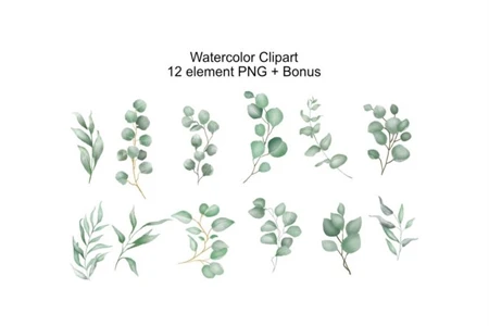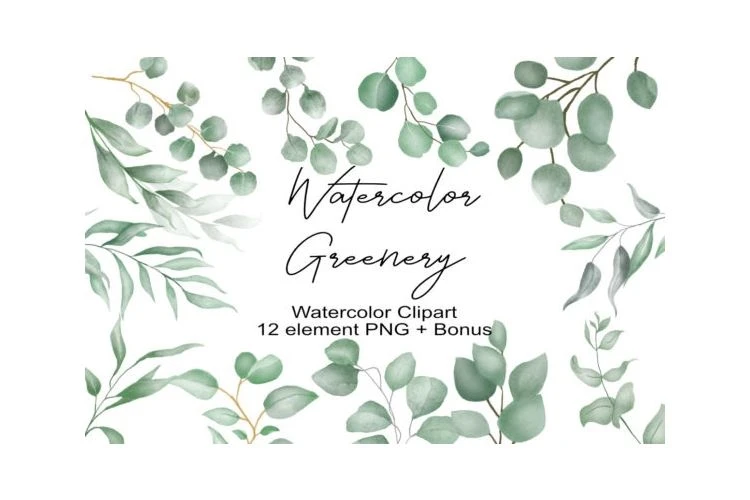 Watercolor Clipart Greenery Leaves Branches Foliage Green Bright Emerald Aquarelle Clip Art Seamless Pattern PNG