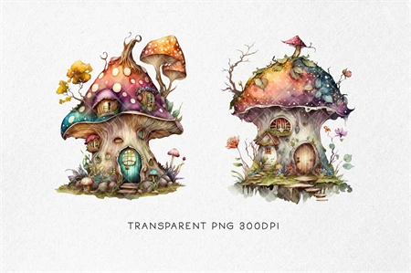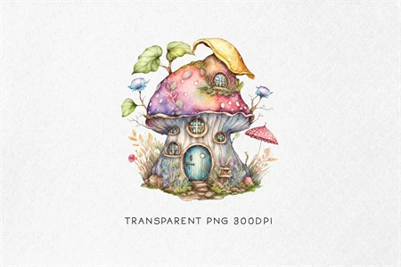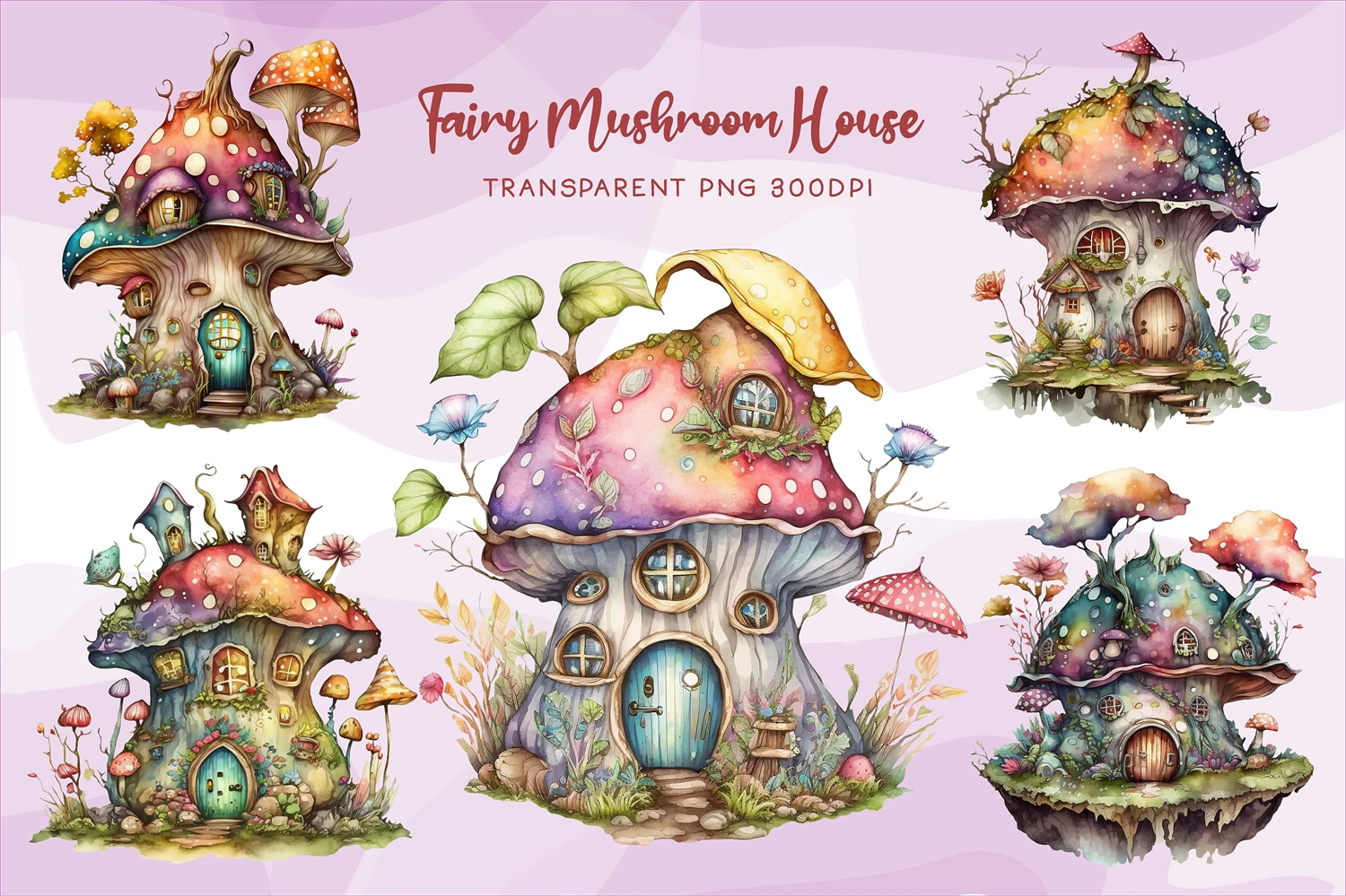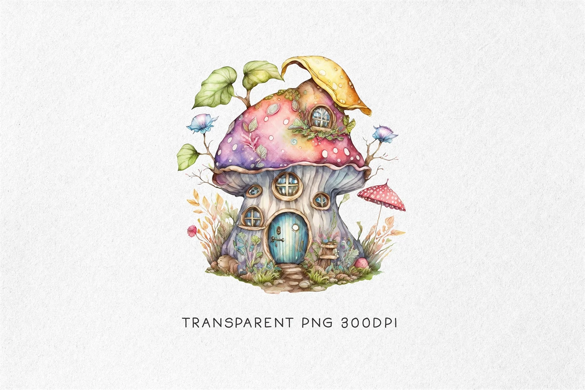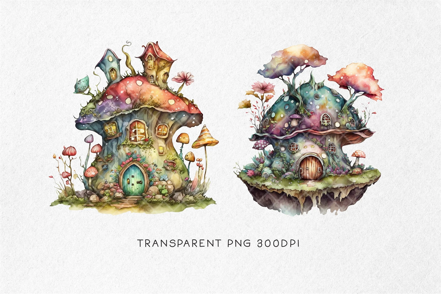 Watercolor Fairy Mushroom House Clipart, Fairy Tale, Fantasy Forest , Magic House. All elements are high-resolution (300dpi) PNG files with transparent backgrounds.
