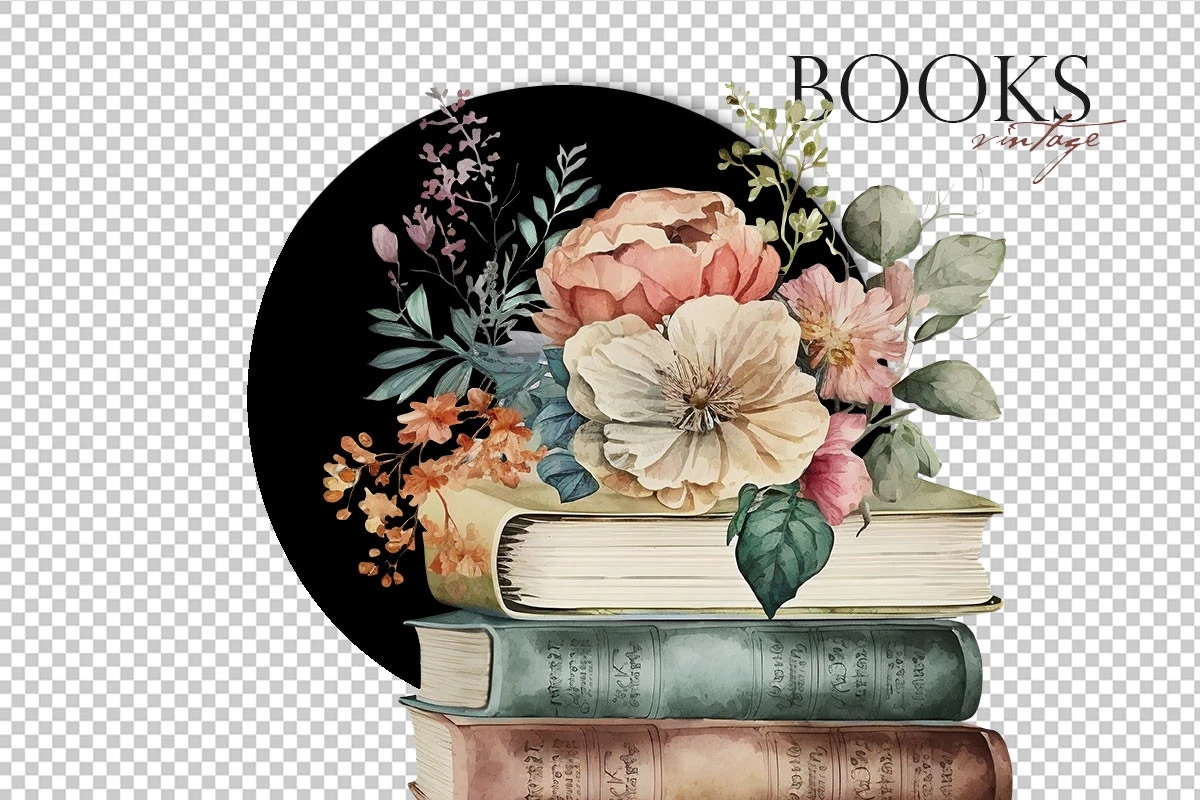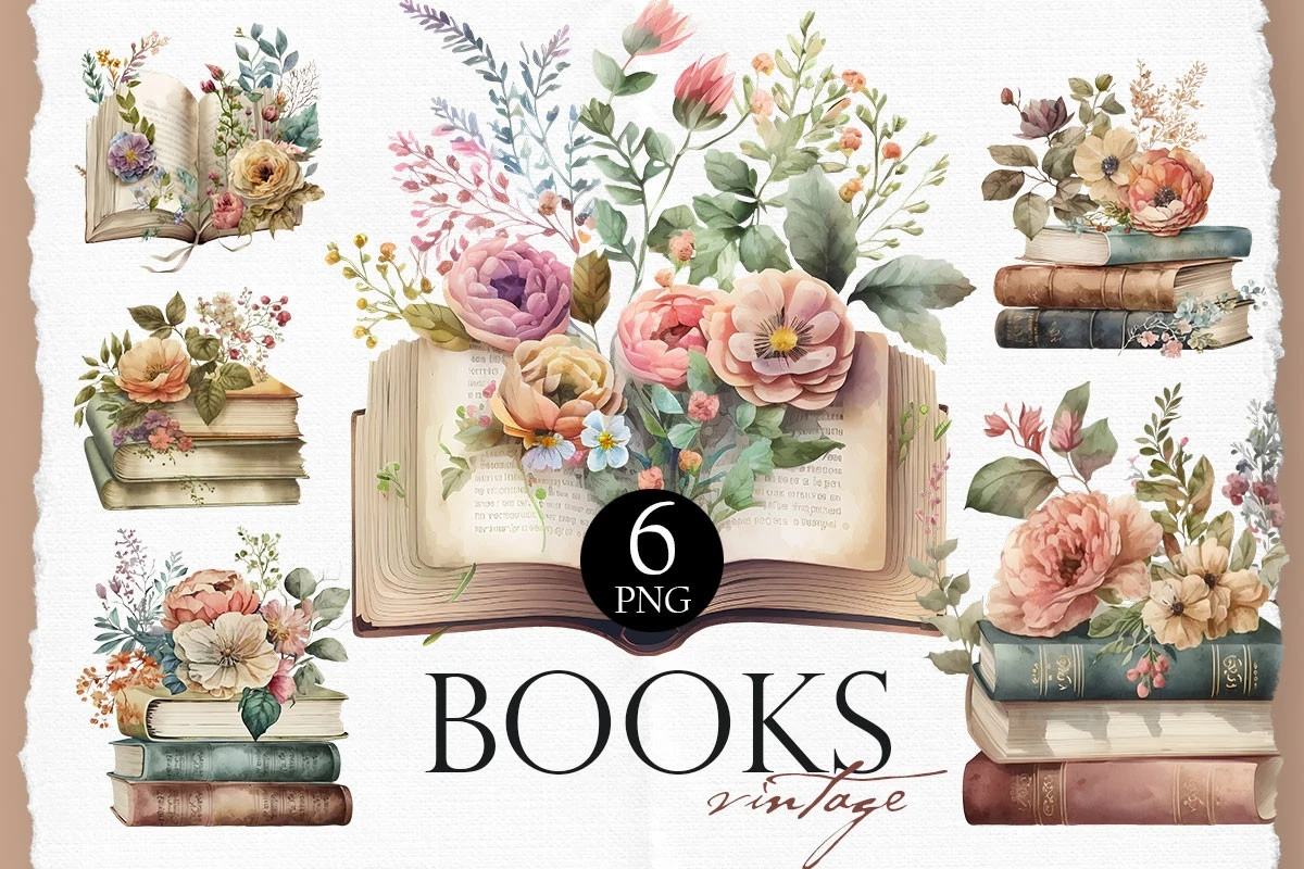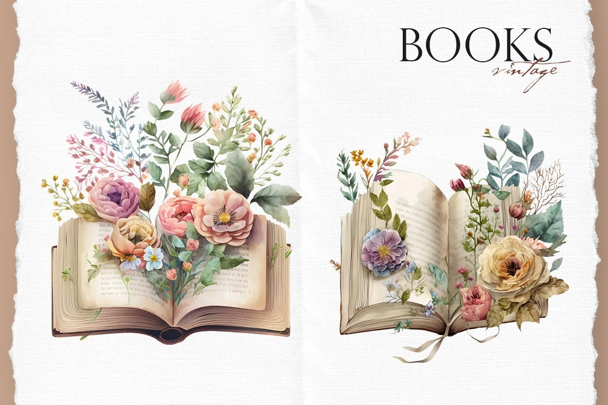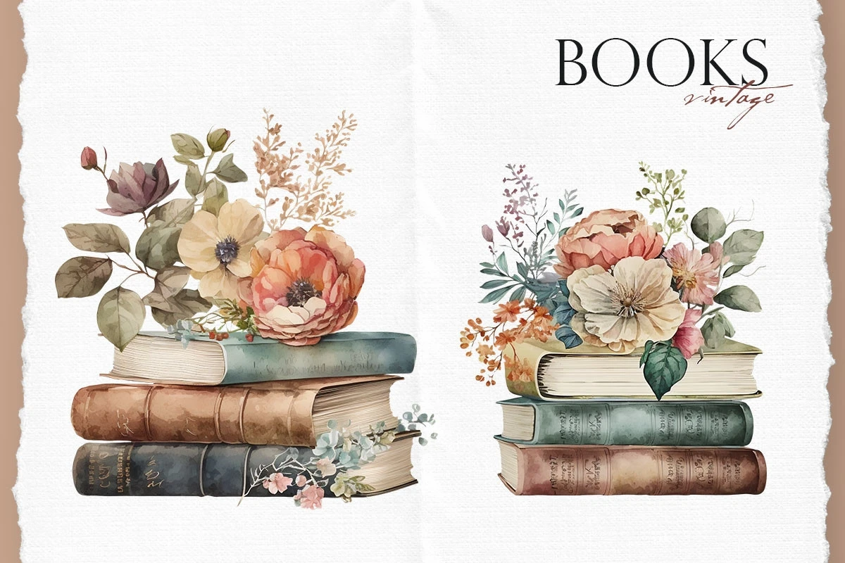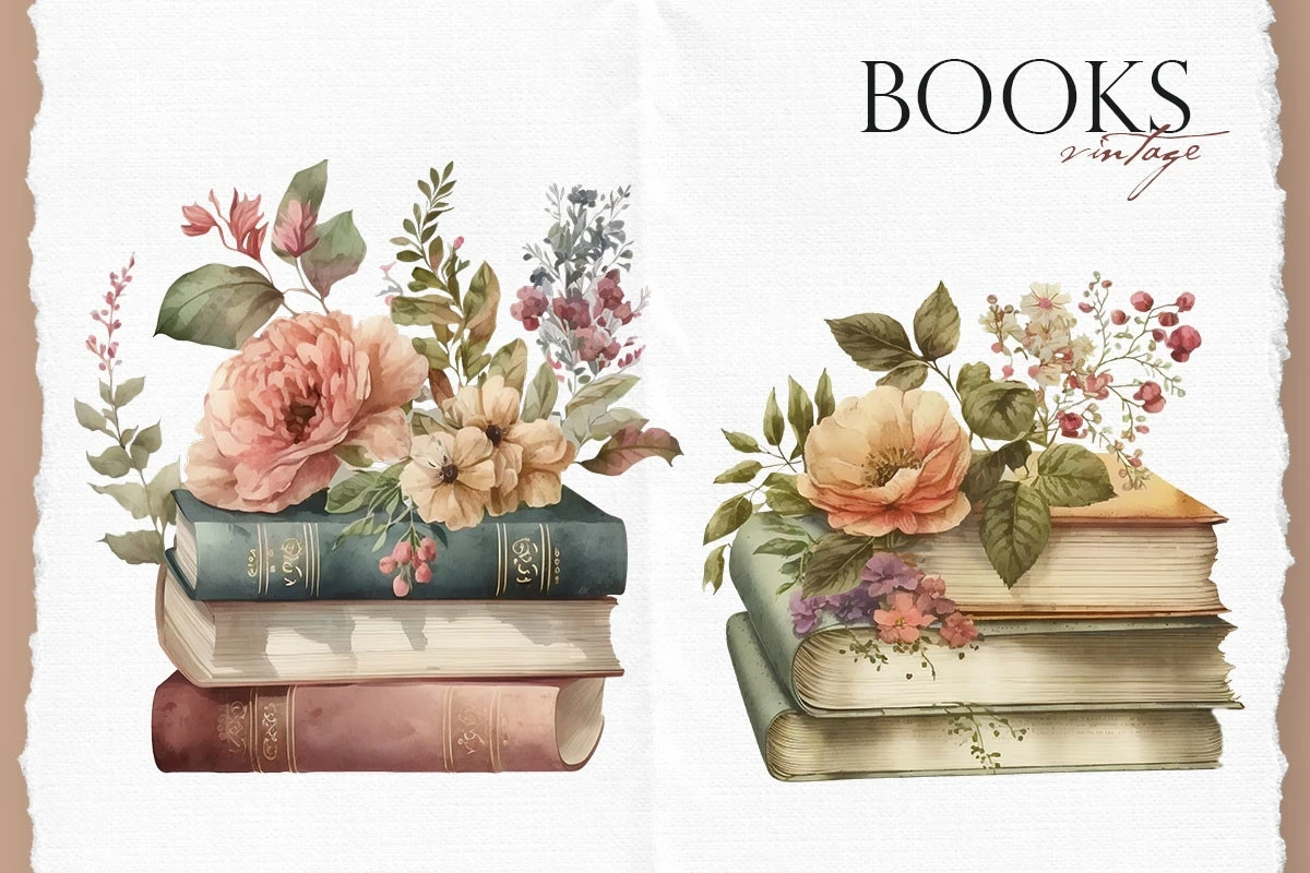 Watercolor aesthetic vintage books clipart with flowers.