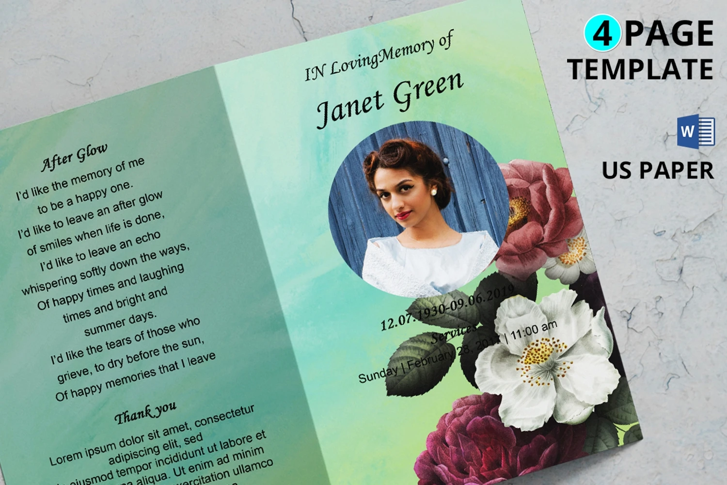 8.5x11 Inches Word, Publisher and CANVA Funeral Program Template.