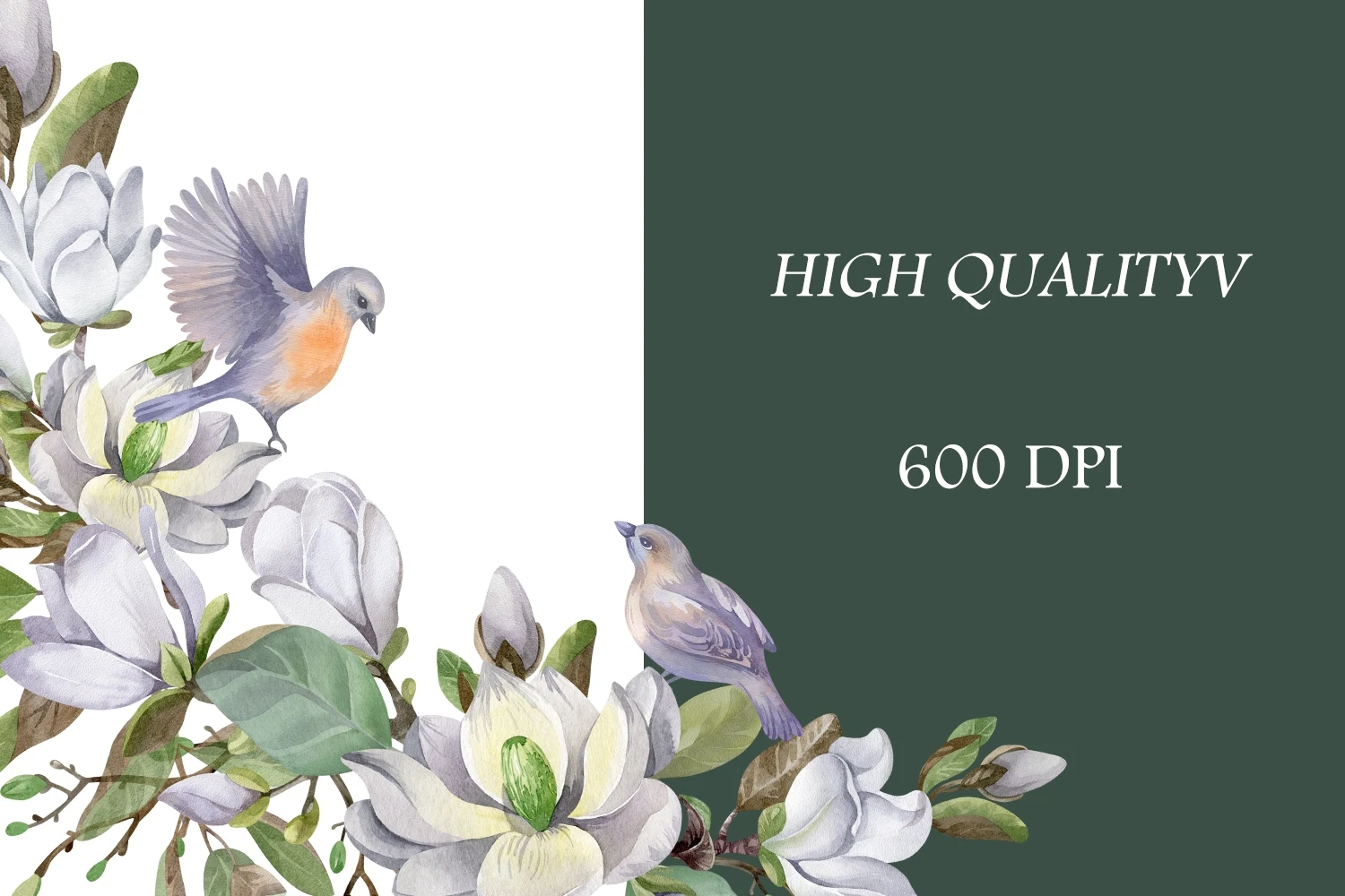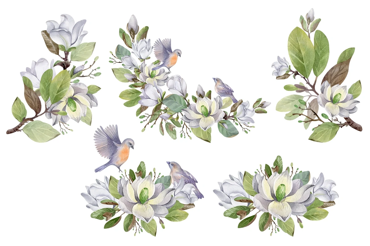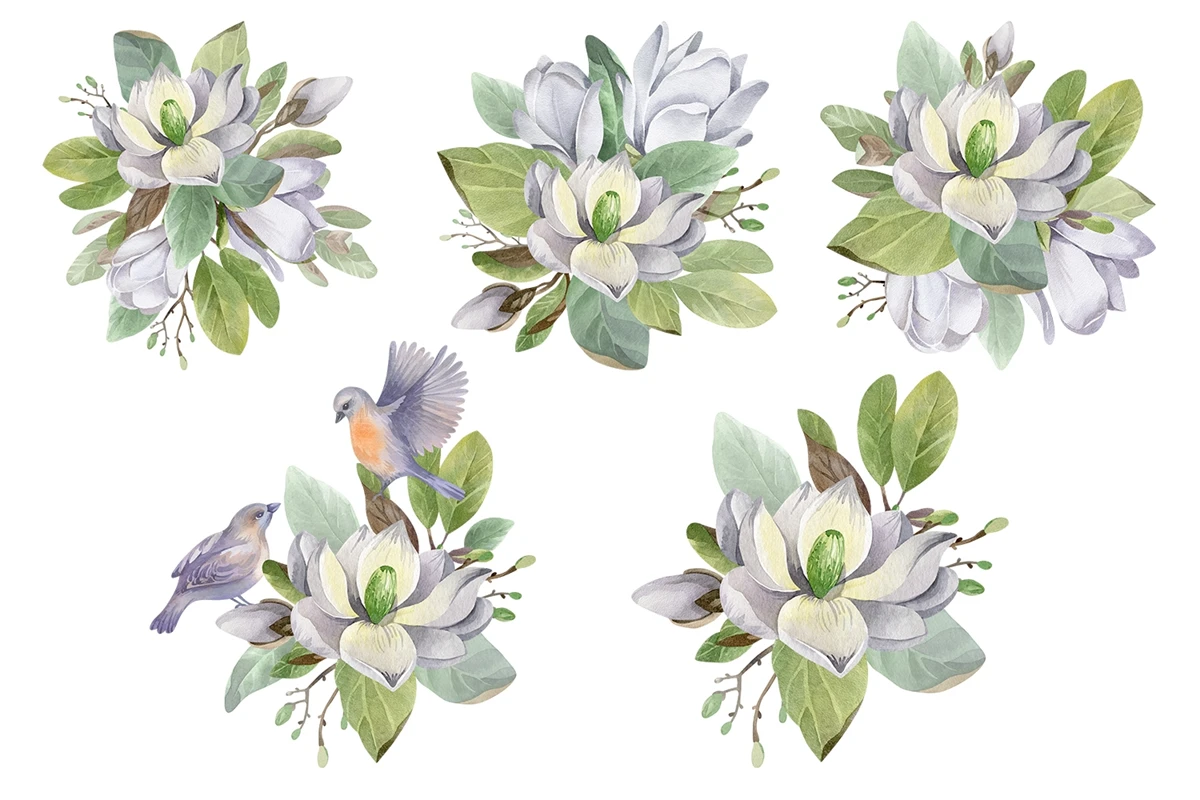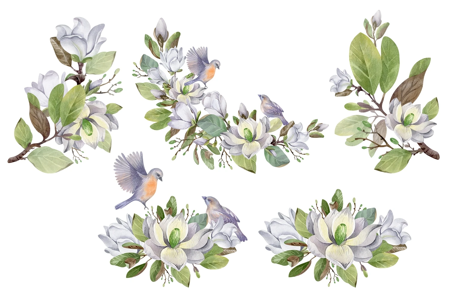 A set of watercolor white magnolias of exotic flowers, made in a watercolor technique. Perfect design for crafts, wedding invitations, greeting cards, apparel, blogs, posters, decor and more.