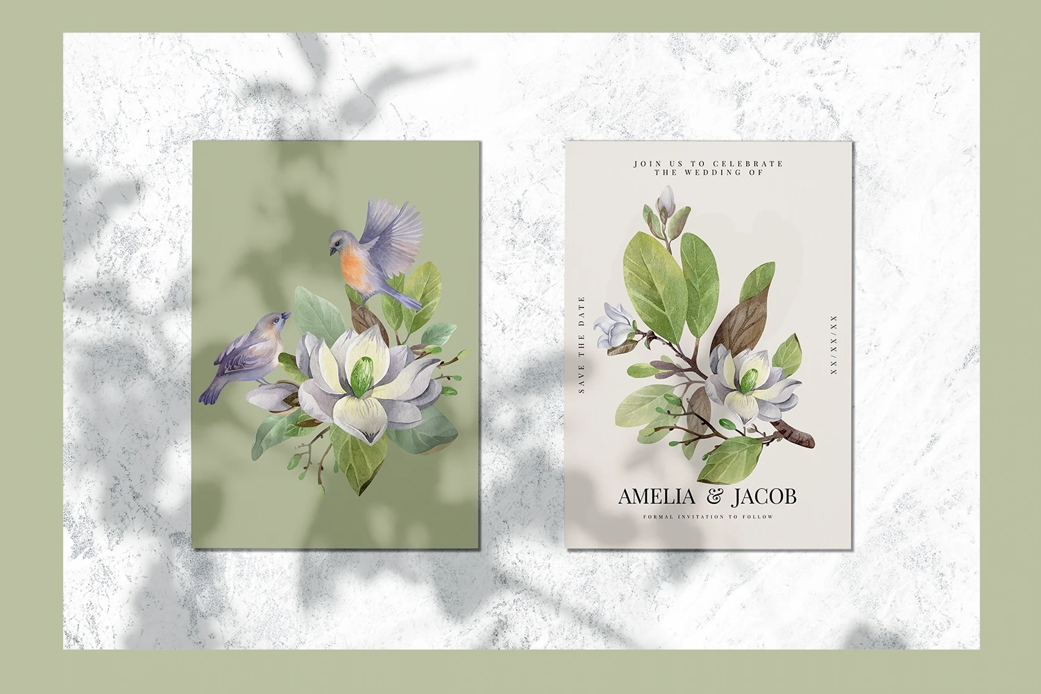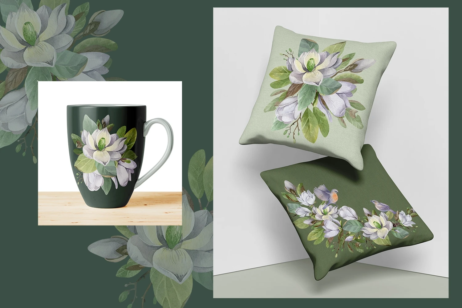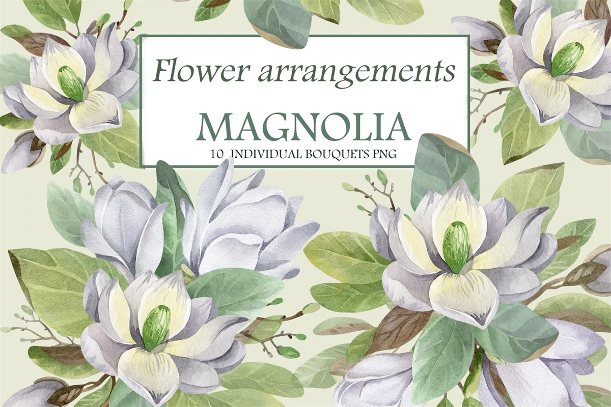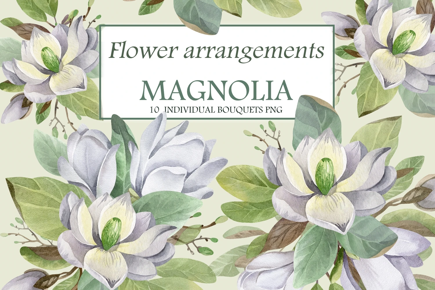 A set of watercolor white magnolias of exotic flowers, made in a watercolor technique. Perfect design for crafts, wedding invitations, greeting cards, apparel, blogs, posters, decor and more.