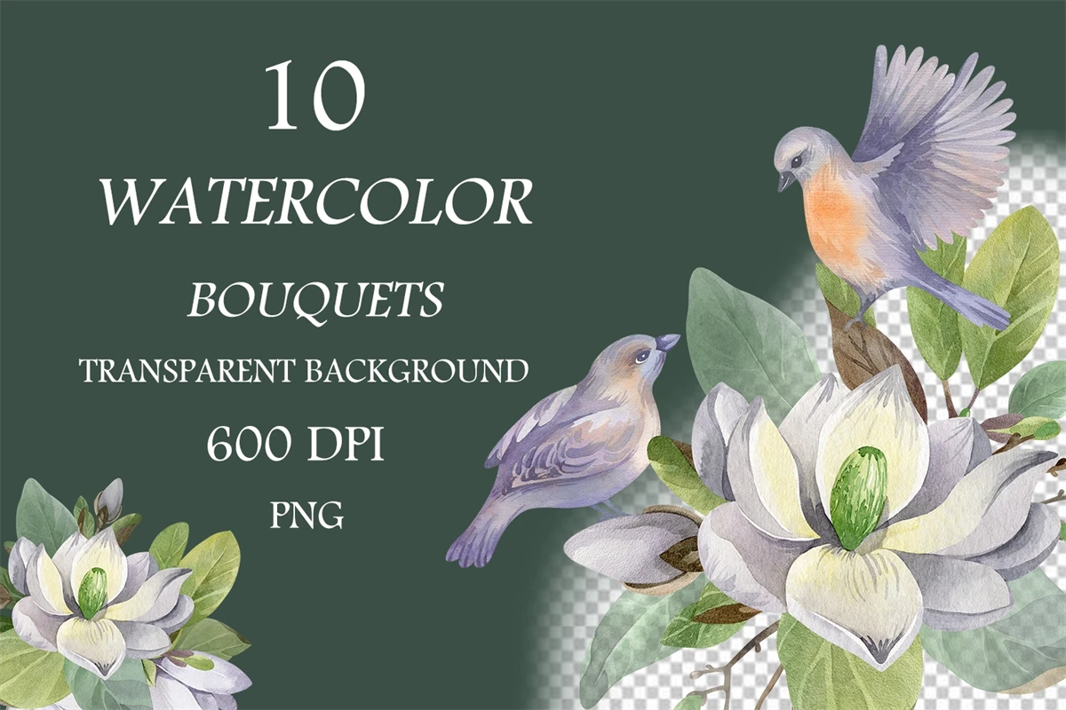 - 10 flower compositions (PNG, transparent background, 600 dpi)