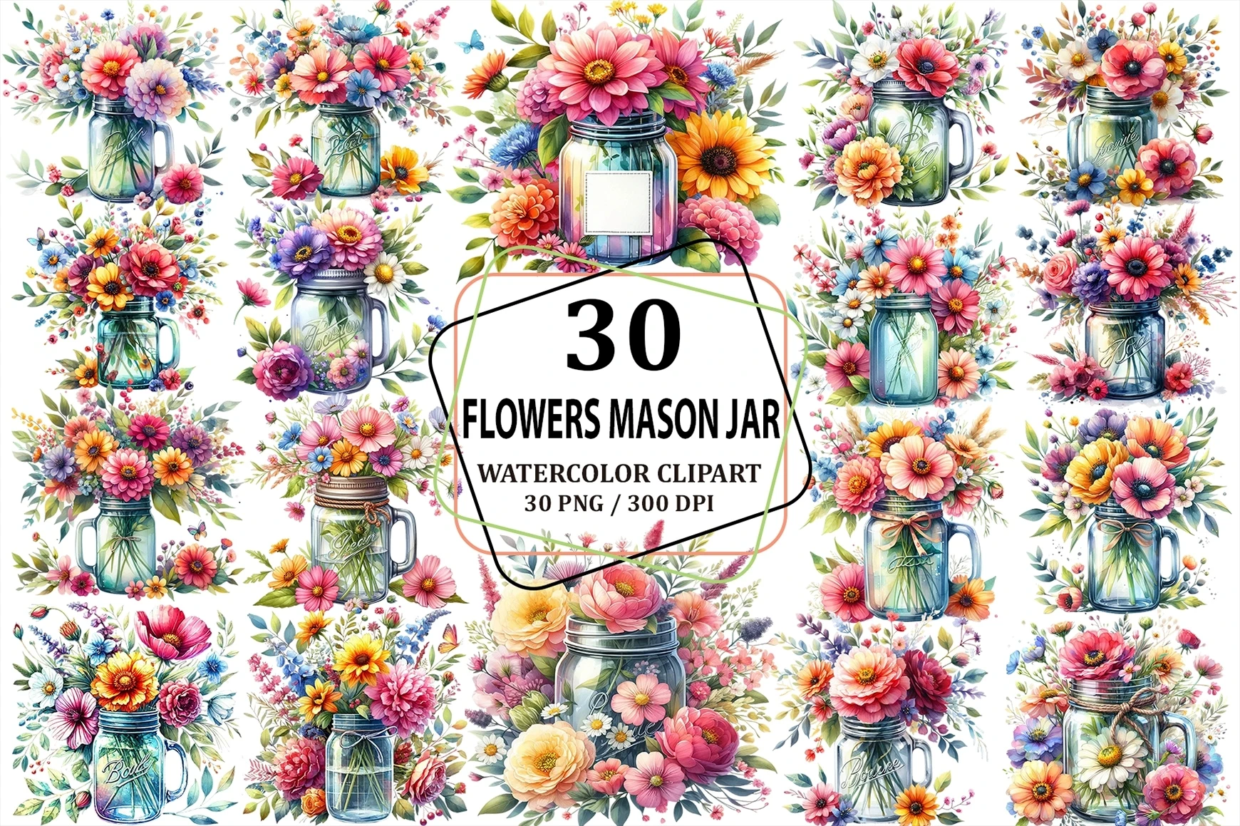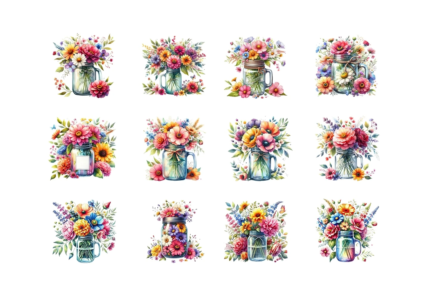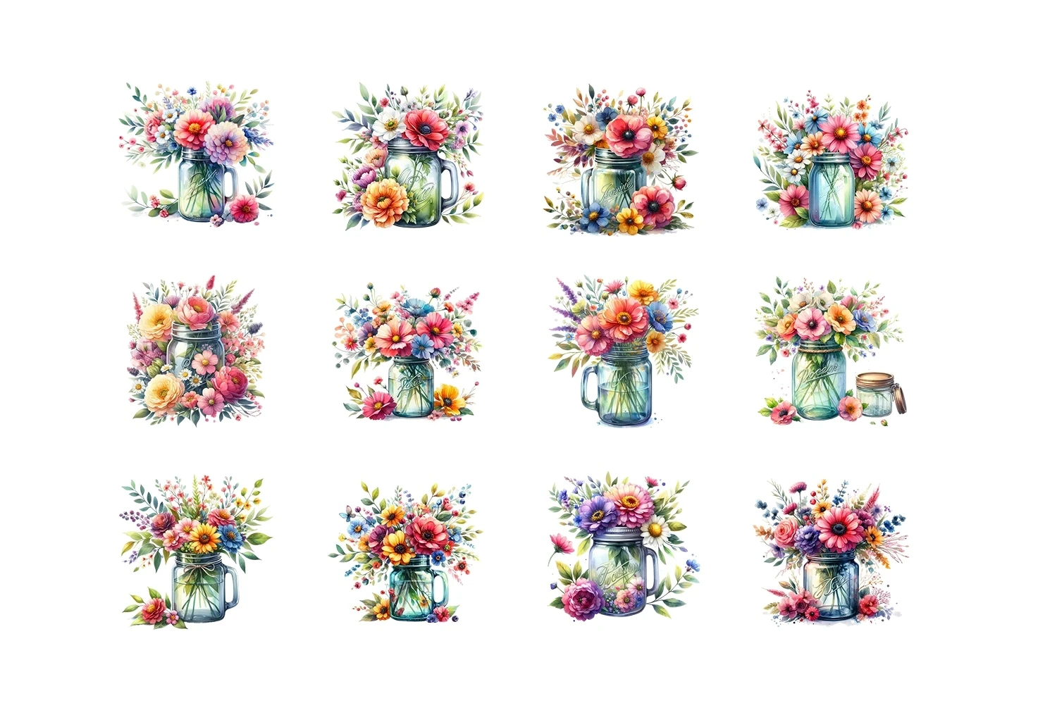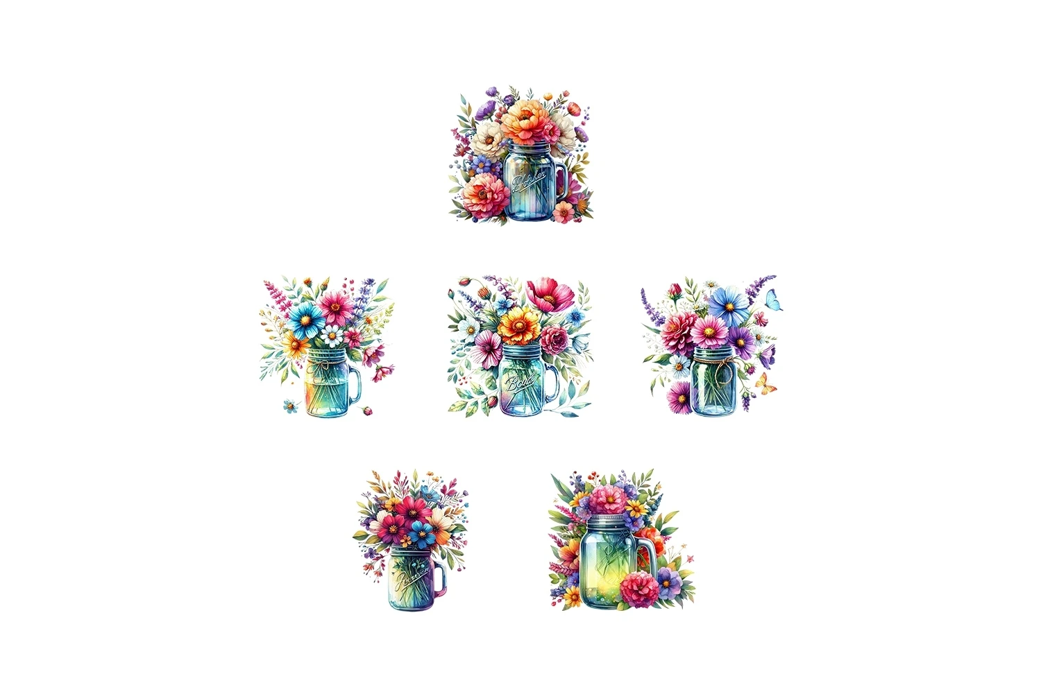 Watercolor Flowers Mason Jar Clipart Sublimation PNG (AI-generated).