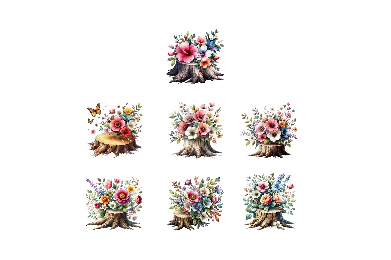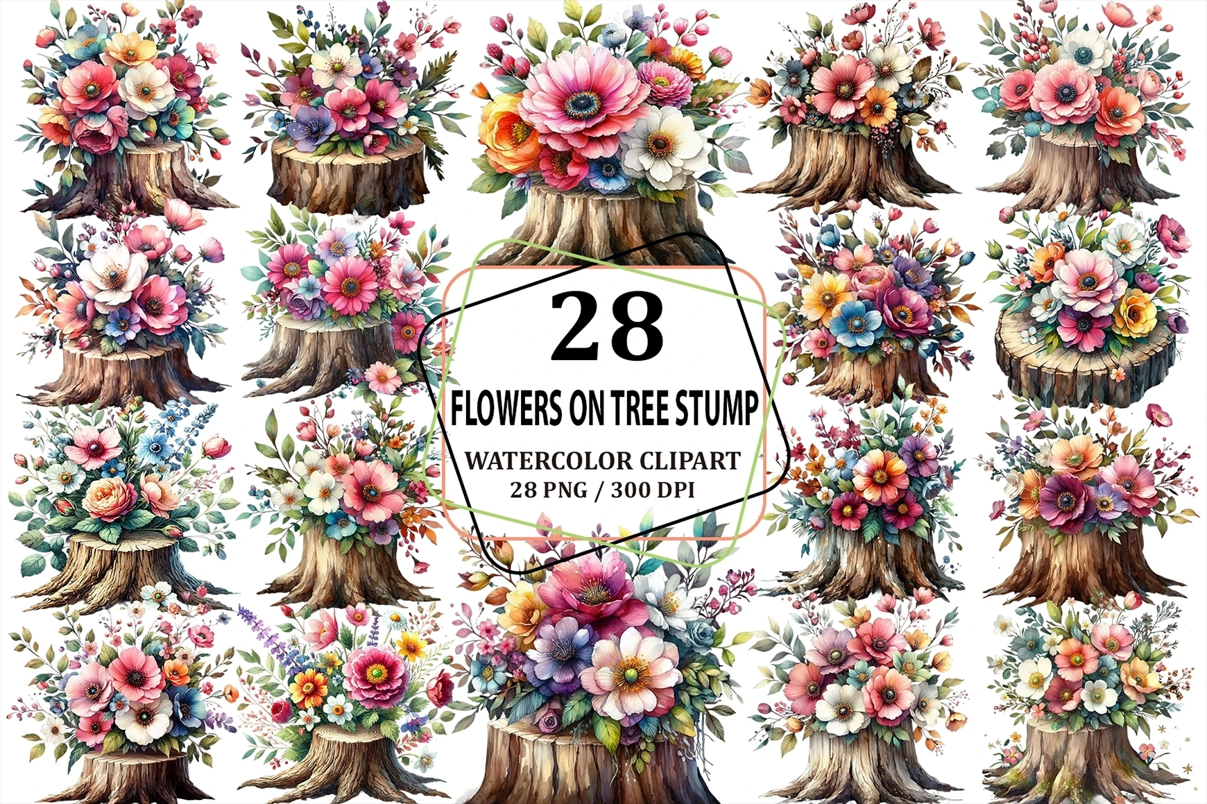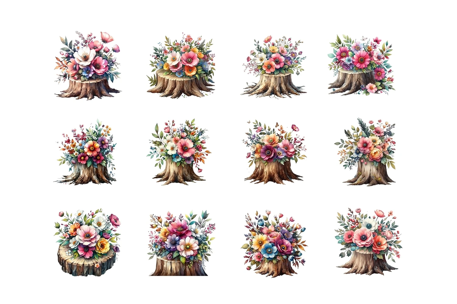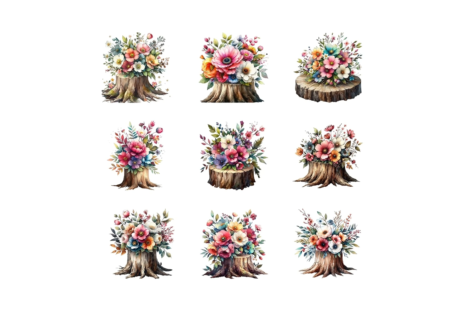 Watercolor Flowers on Tree Stump Clipart PNG (AI-generated).