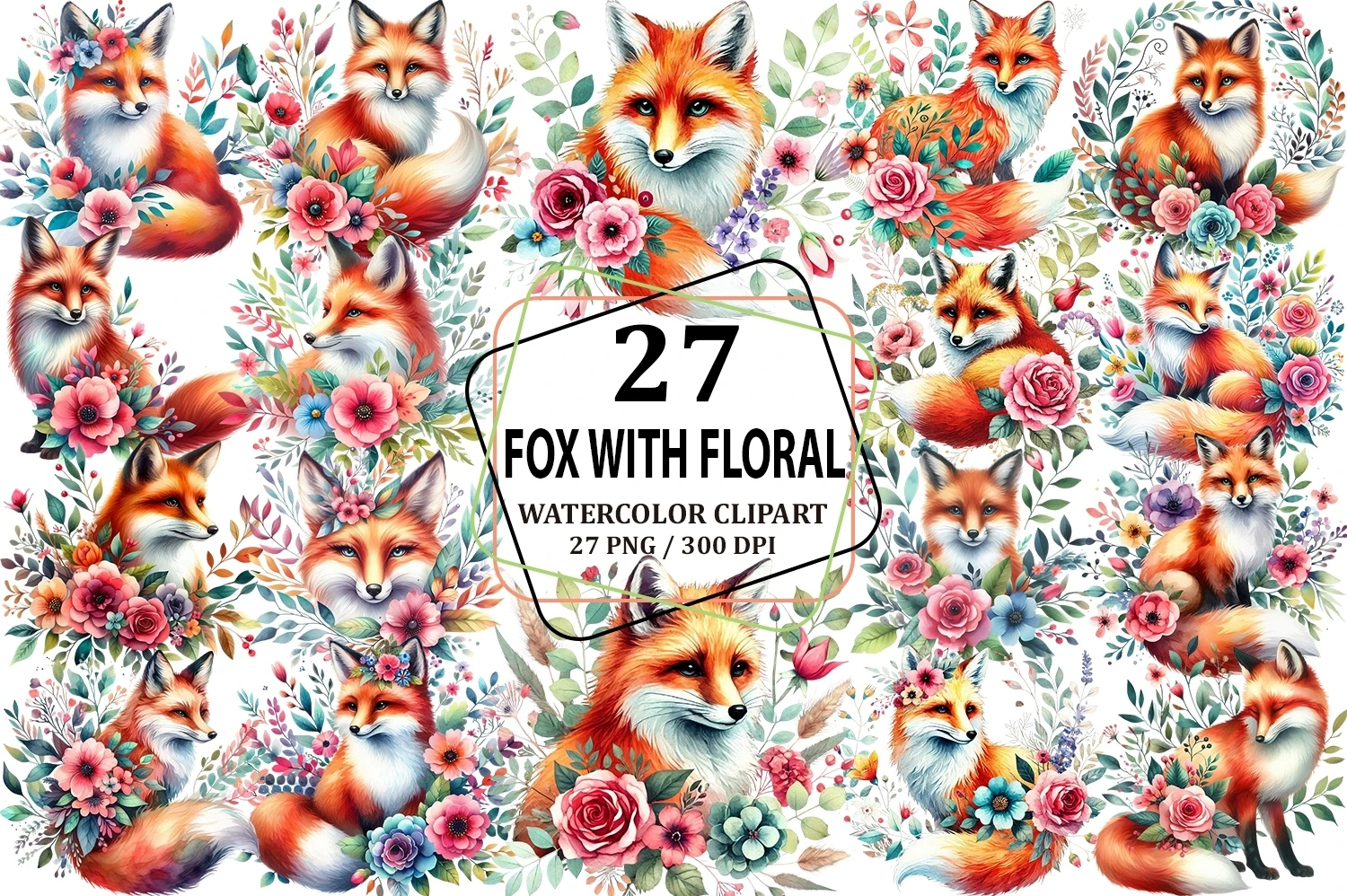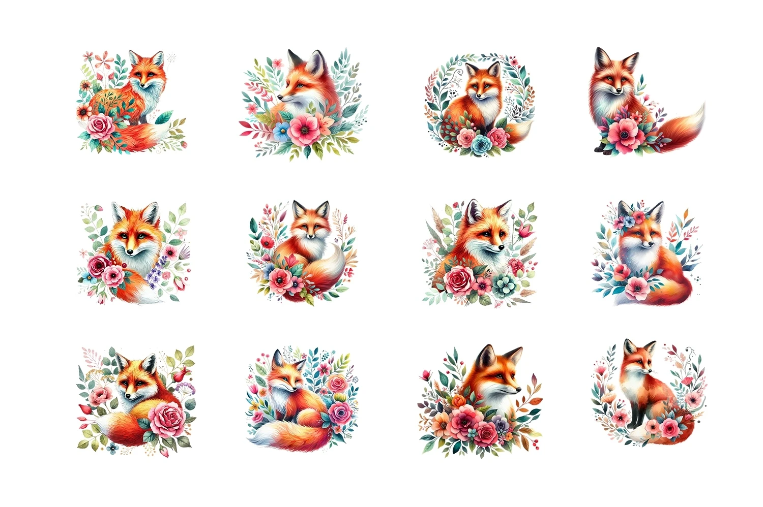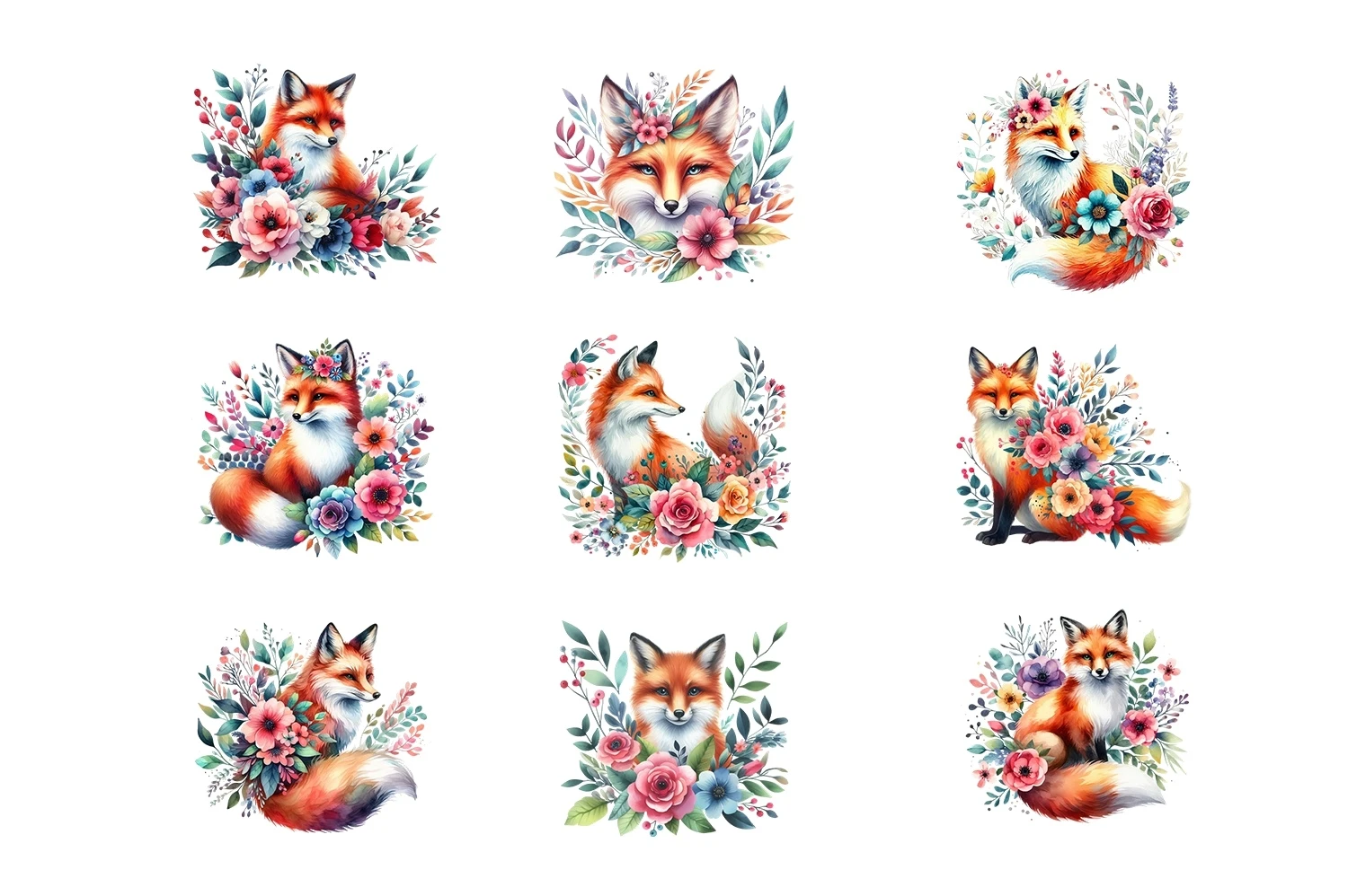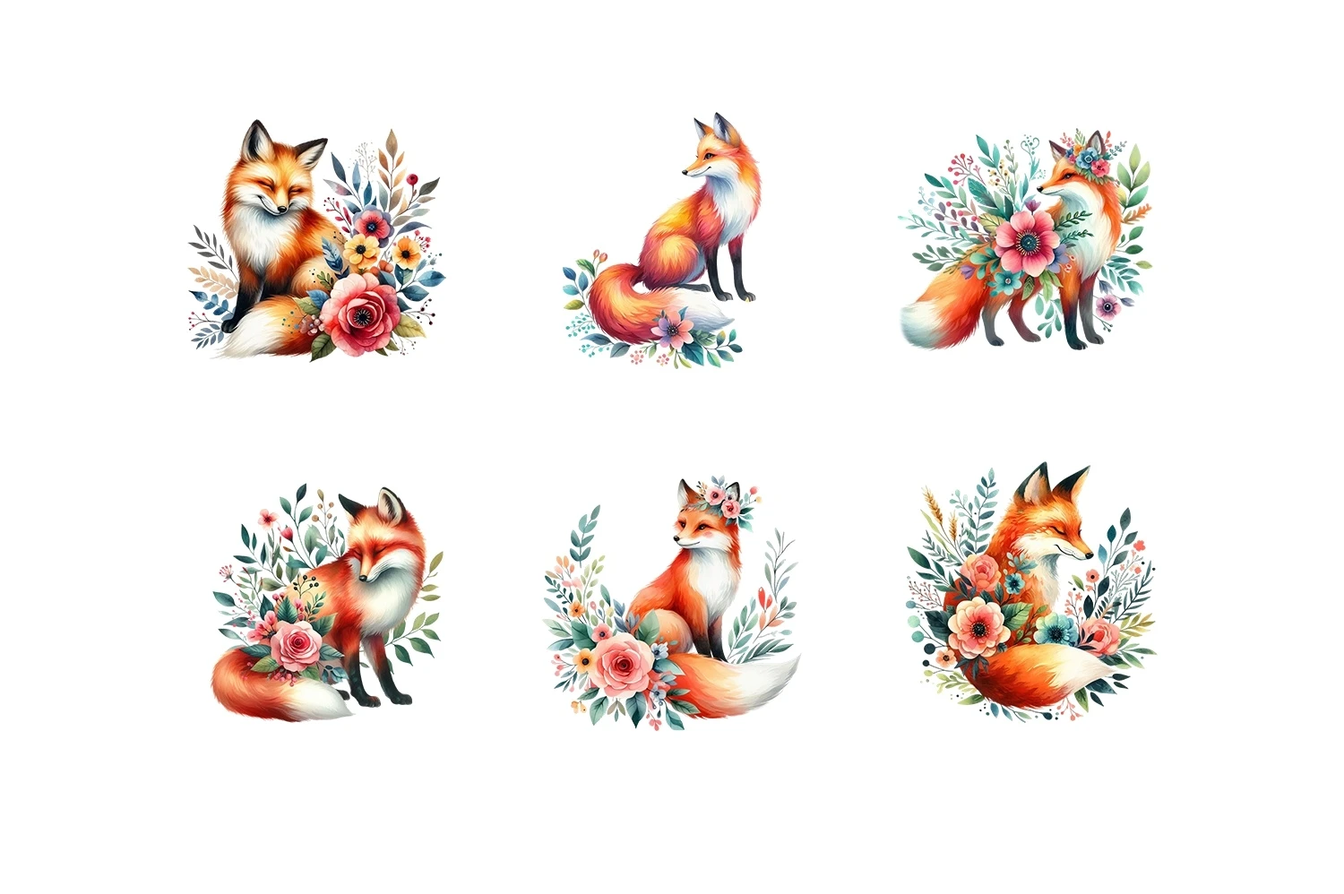 Watercolor Fox with Floral Clipart Sublimation PNG (AI-generated).