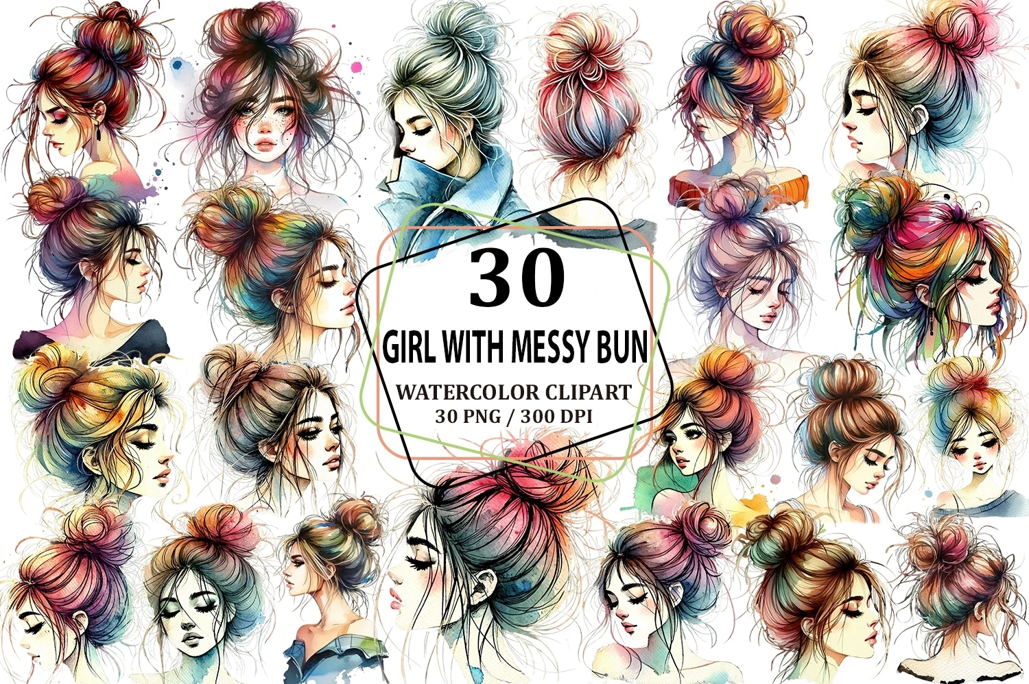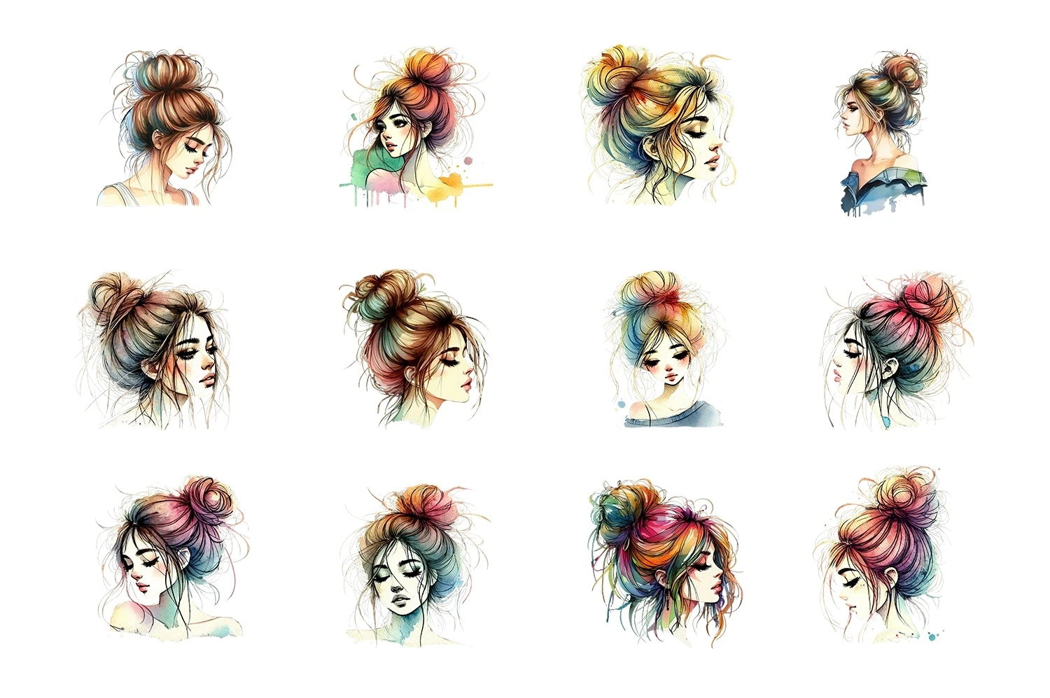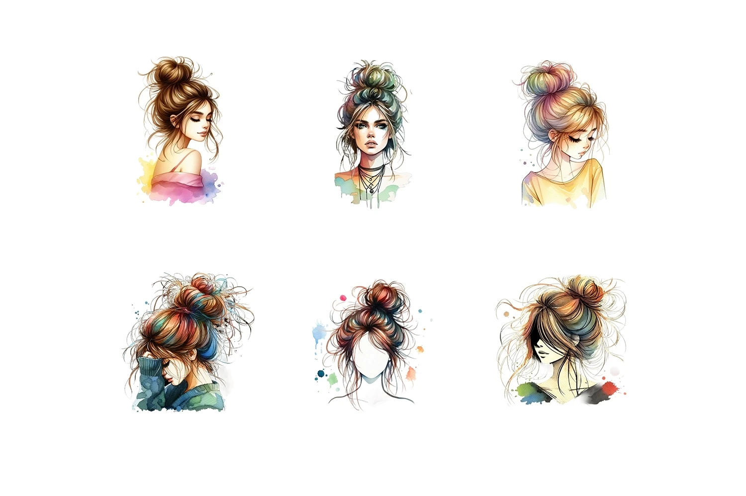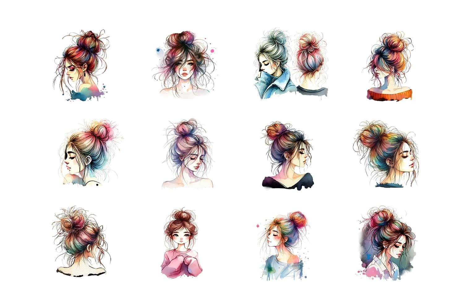Watercolor Girl with Messy Bun Clipart Sublimation PNG (AI-generated).