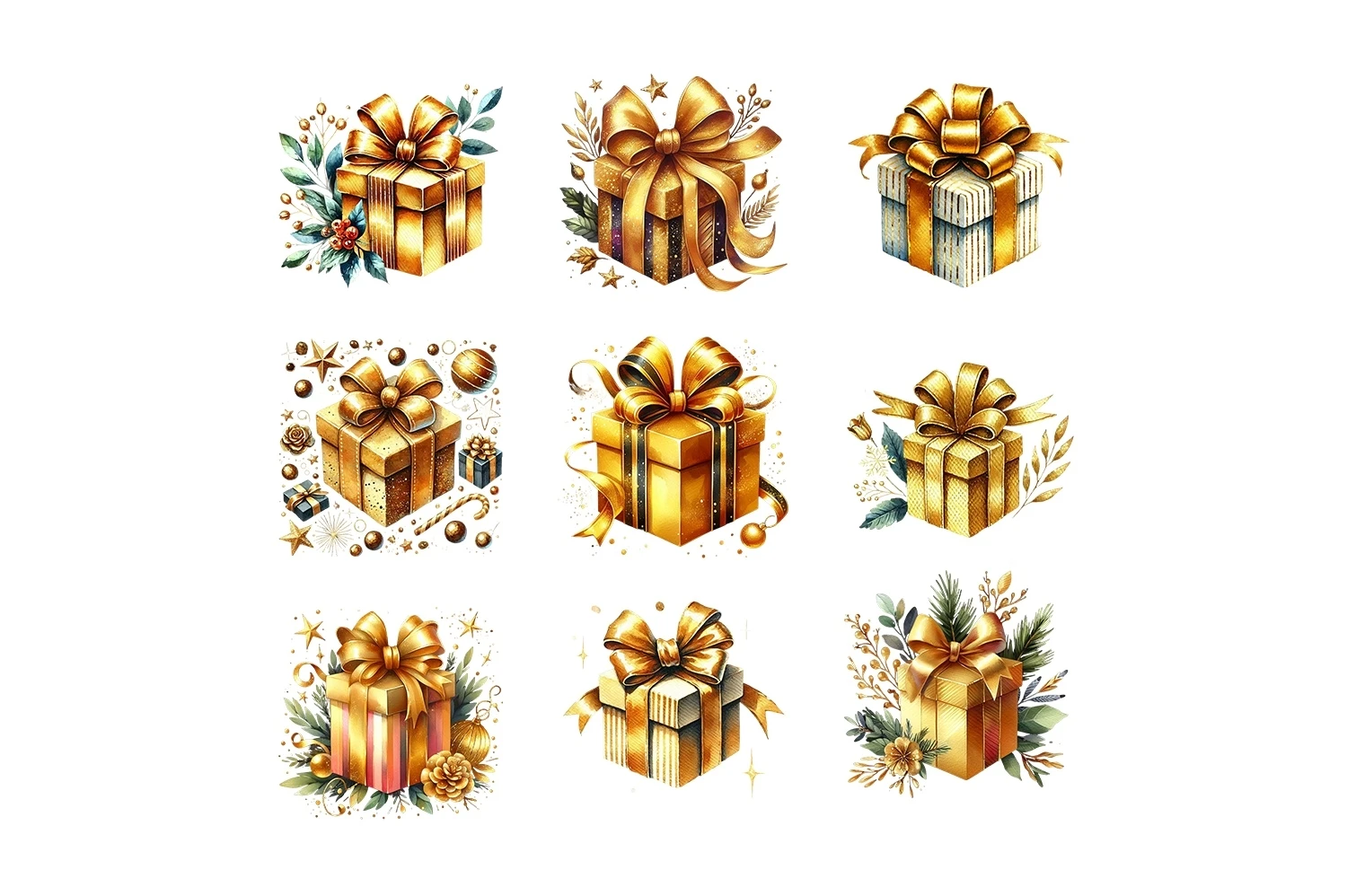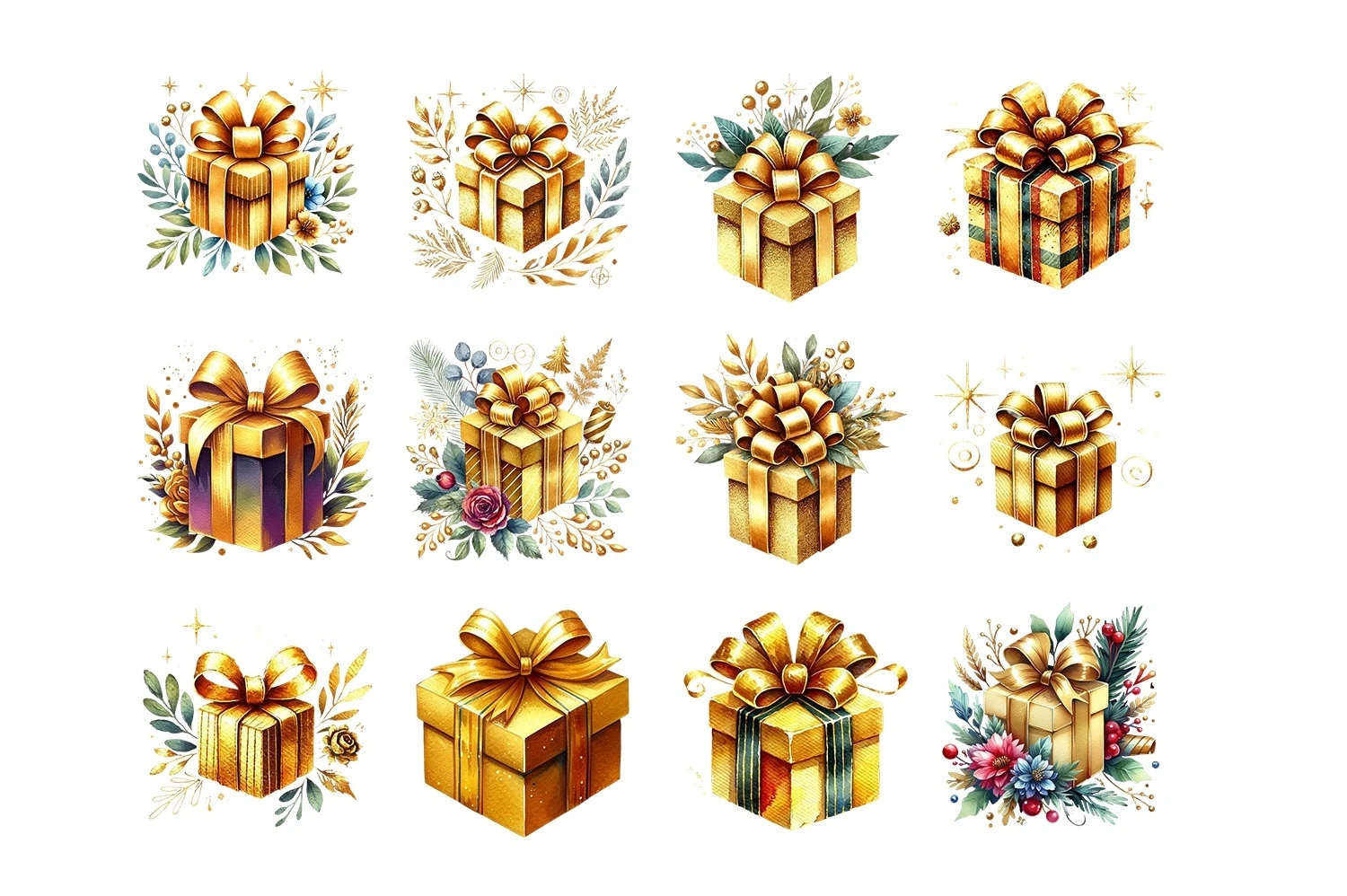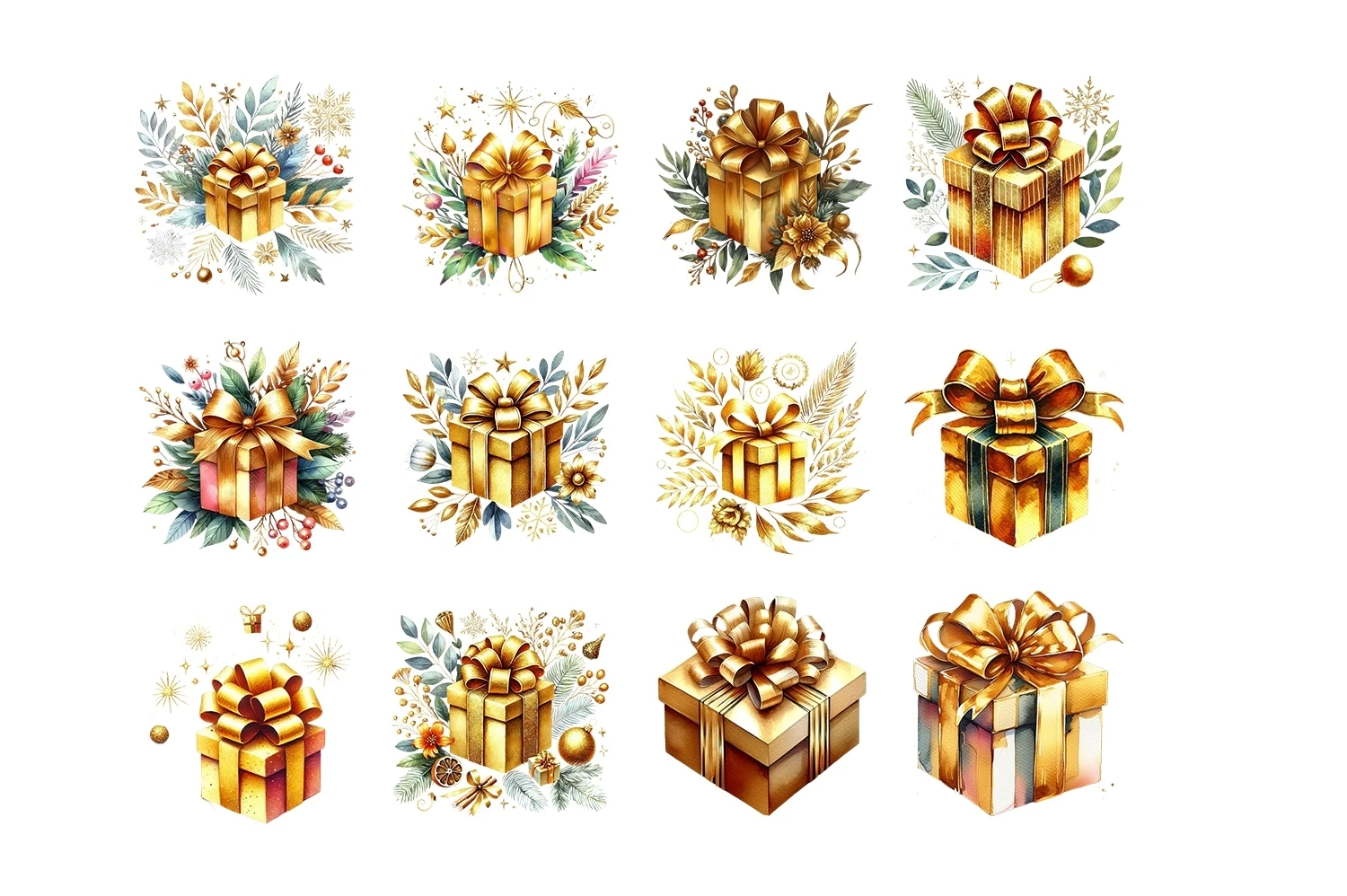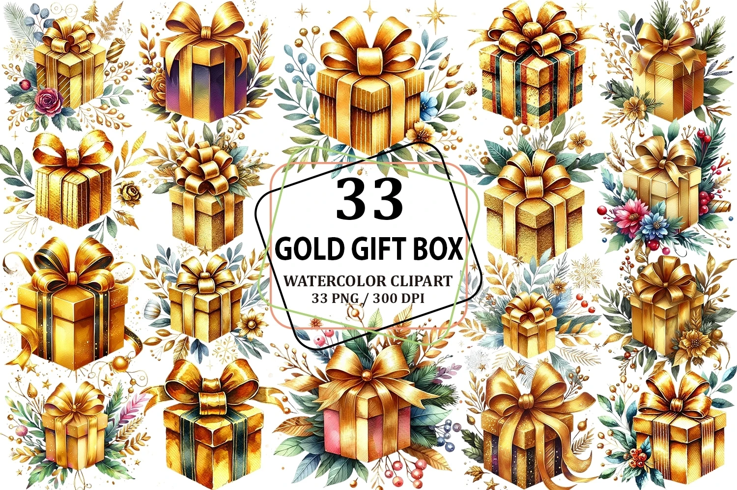Watercolor Gold Gift Box Clipart PNG (AI-generated).