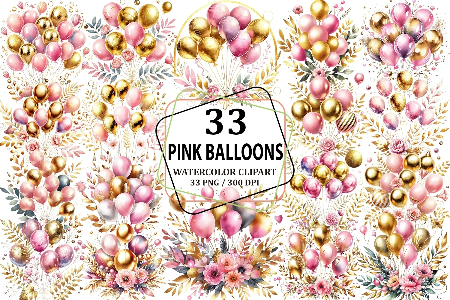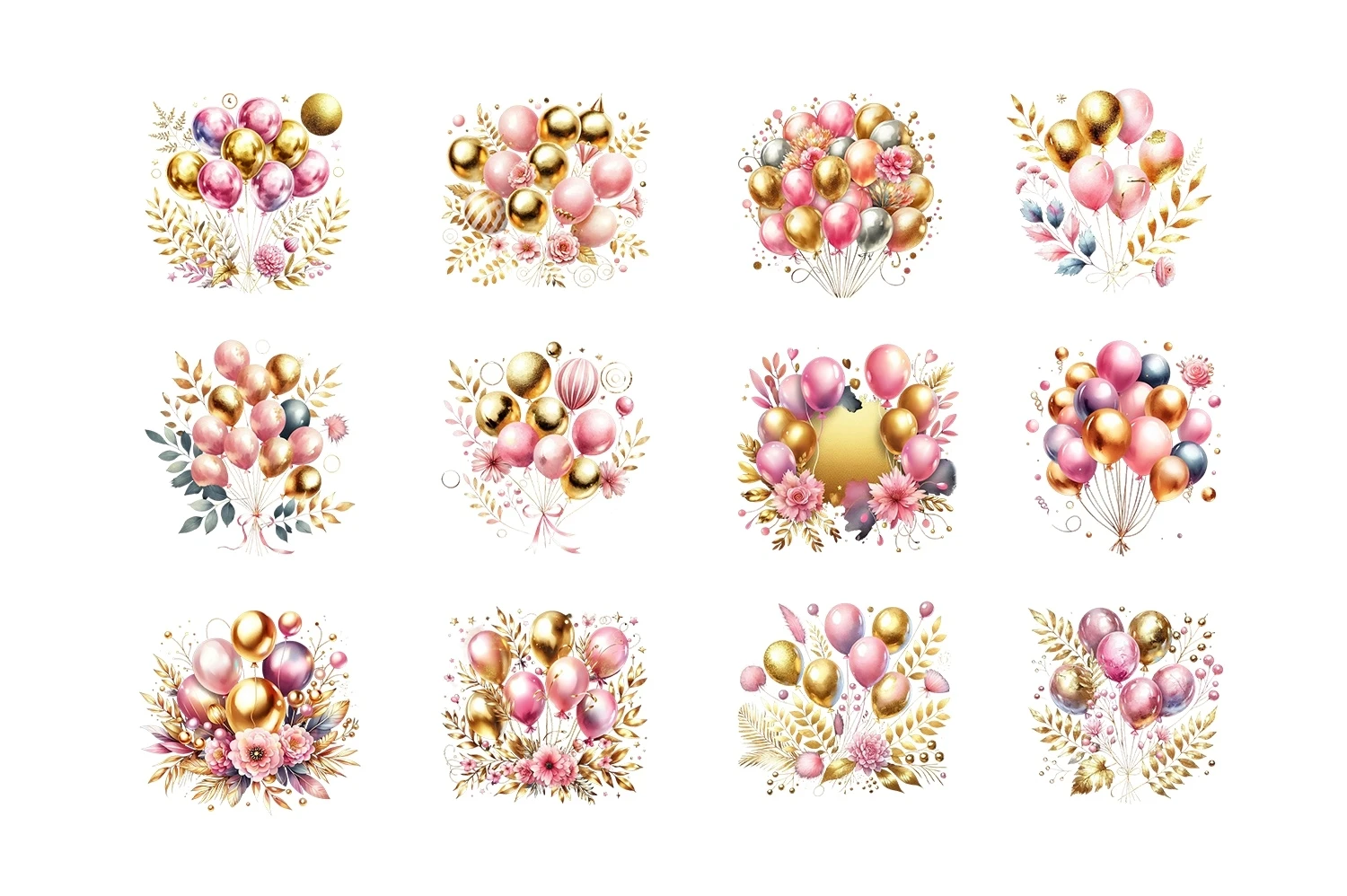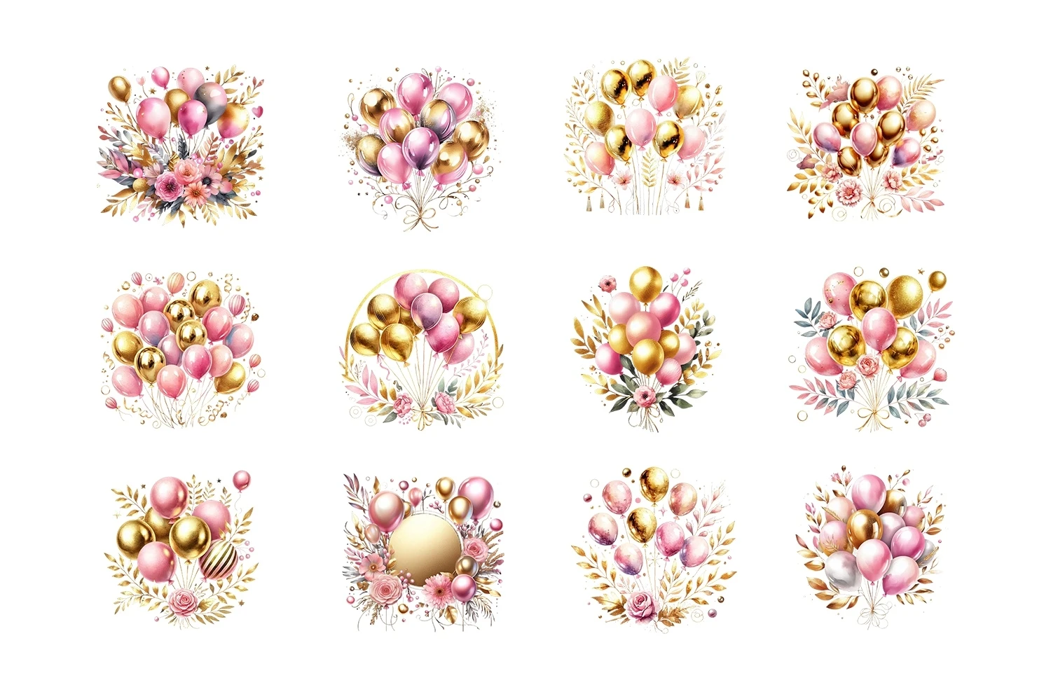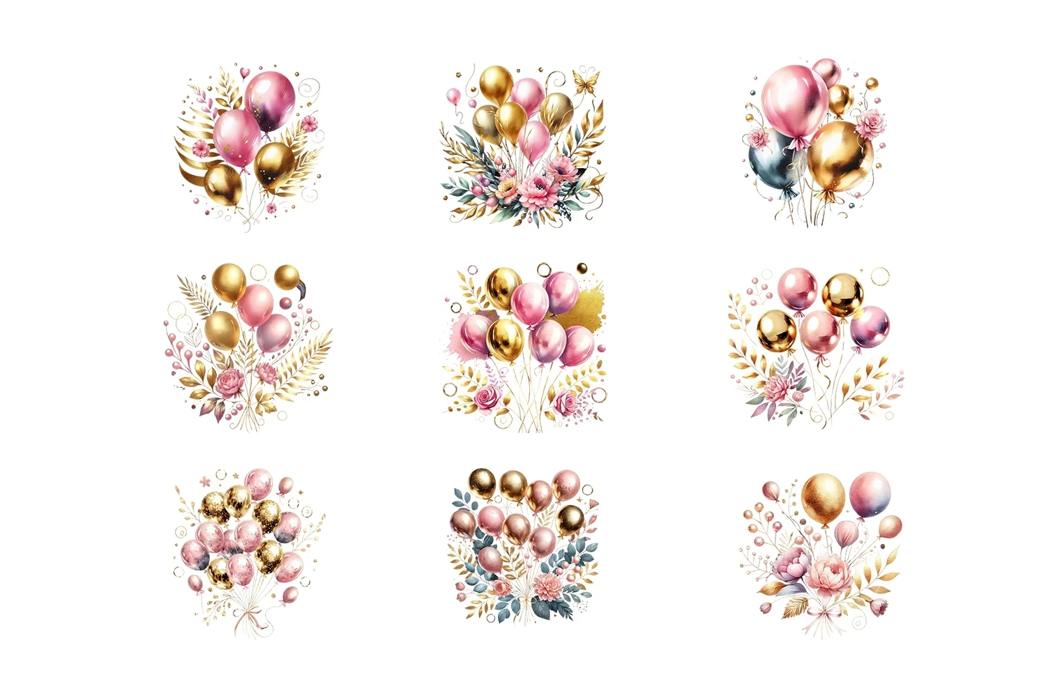 Watercolor Gold & Pink Balloons Clipart Sublimation PNG (AI-generated).